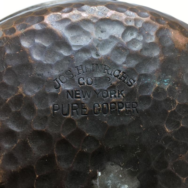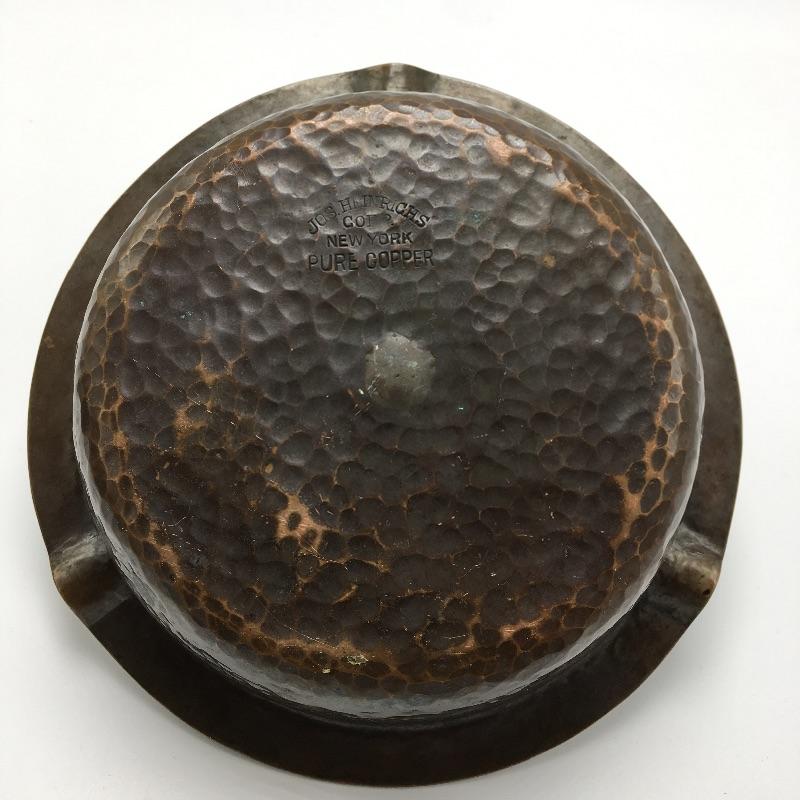 Jos. Heinrichs pure copper hammered ashtray. A beautiful solid piece with a nice weight. Stamped by the maker on the bottom. Ashtray measures 7”D x 4” tall.