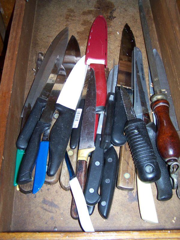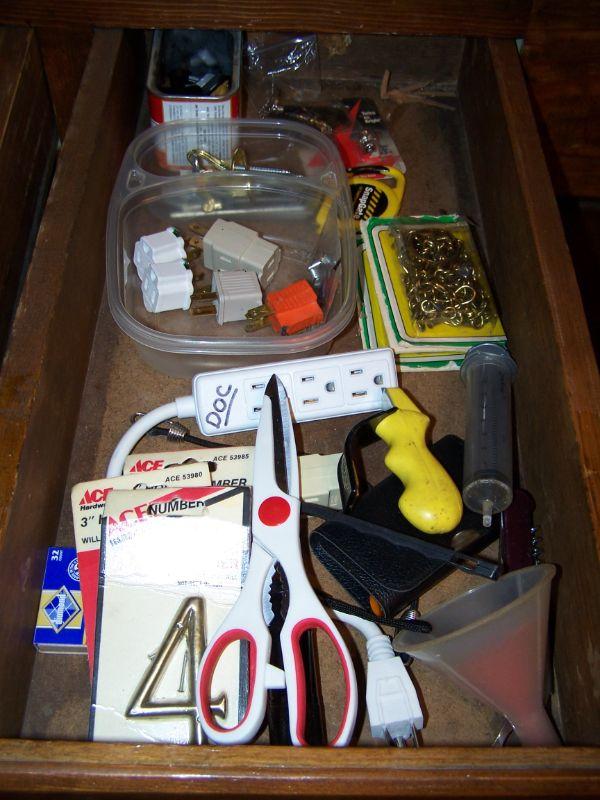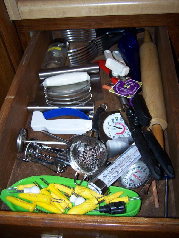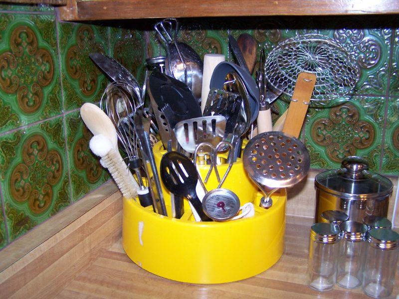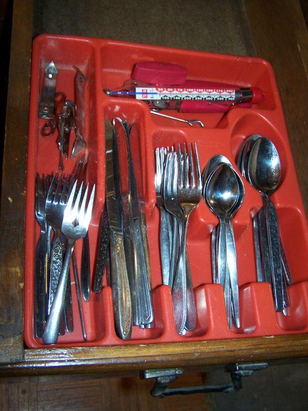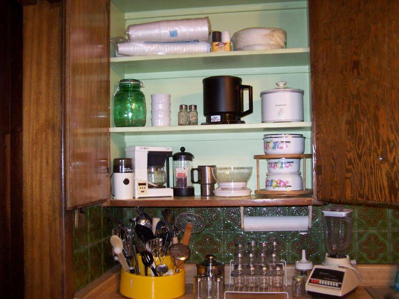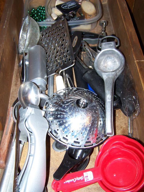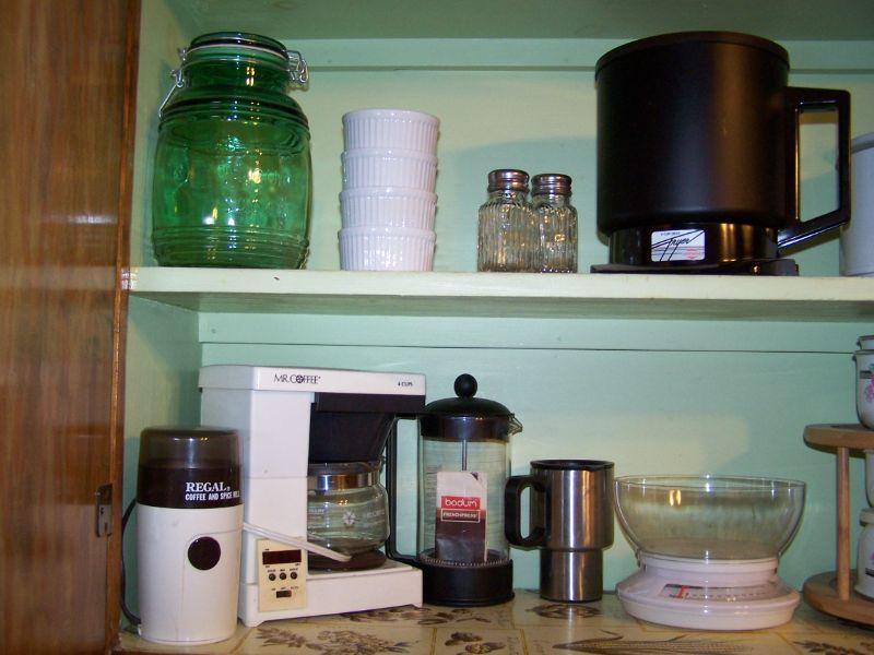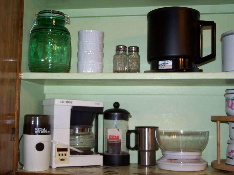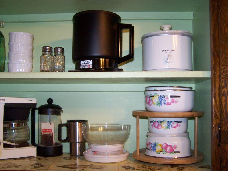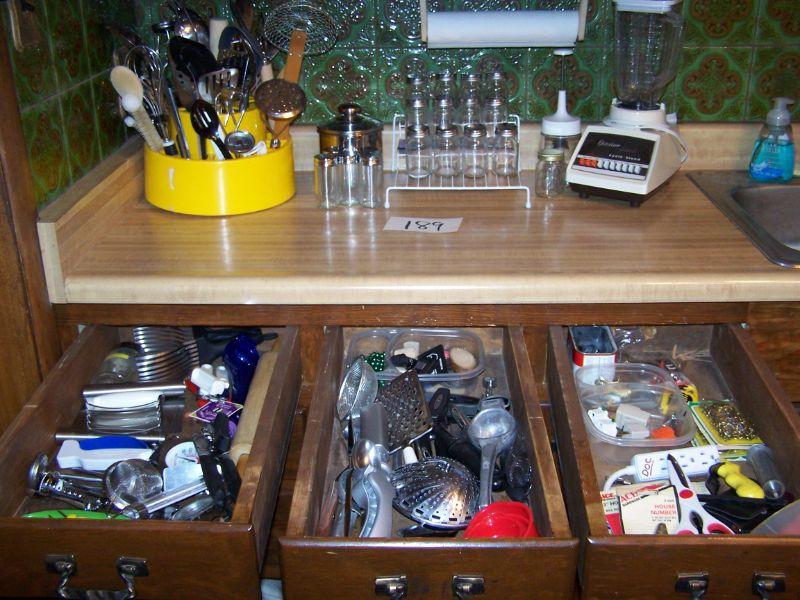 LARGE ASSORTMENT OF KITCHEN ITEMS, OSTERIZER BLENDER, 4 CUP WEST BLEND FRYER, MR. COFFEE COFFEE MAKER, REGAL COFFEE GRINDER, BODUM FRENCH PRESS, SMALL KITCHEN GOURMET CROCKPOT, METAL NESTING BOWLS, KITCHEN SCALE, GREEN GLASS COOKIE JAR, SPICE CONTAINERS, ASSORTED SILVERWARE, KNIVES, UTENSILS, TUPPERWARE, DISH TOWELS AND OTHER KITCHEN NECESSITIES.