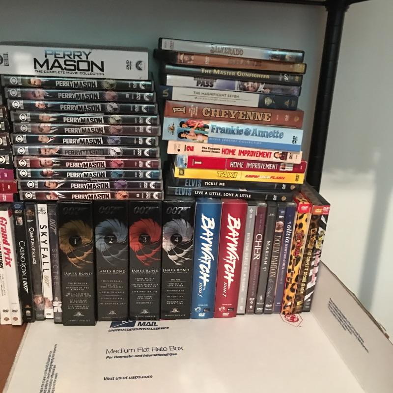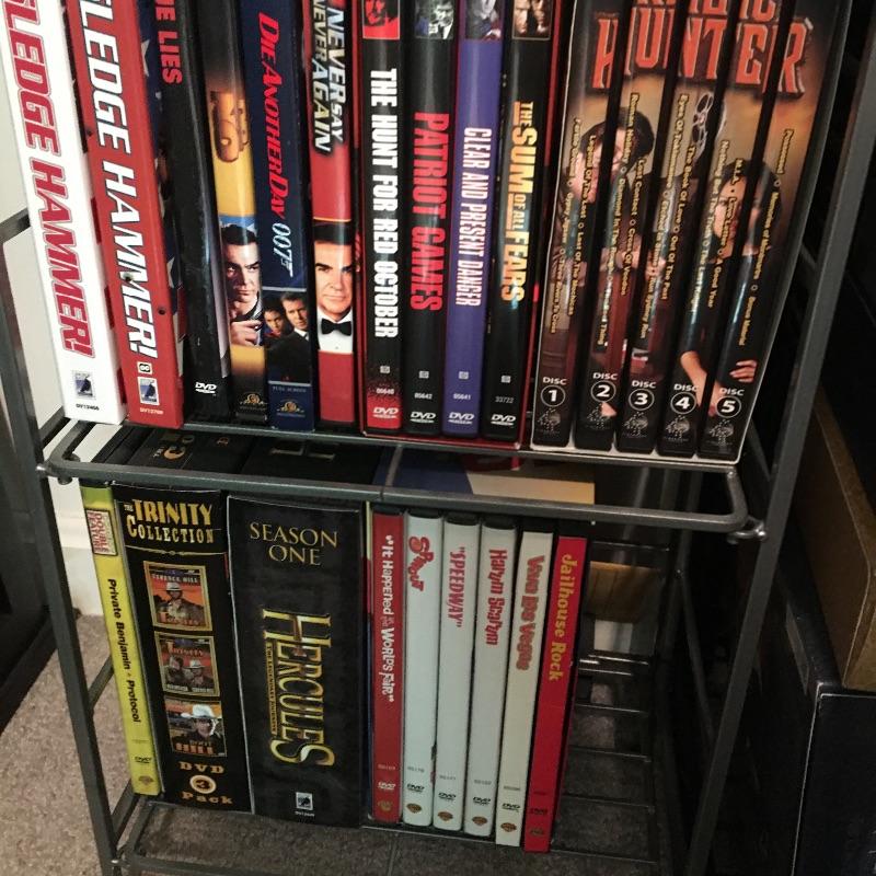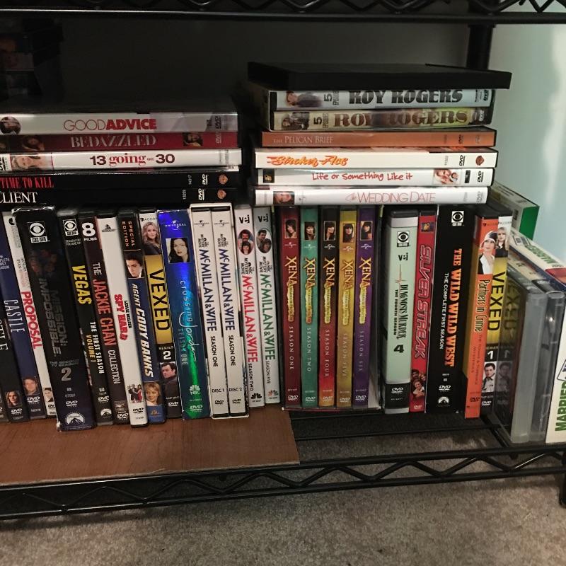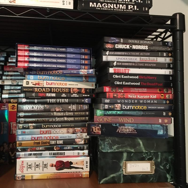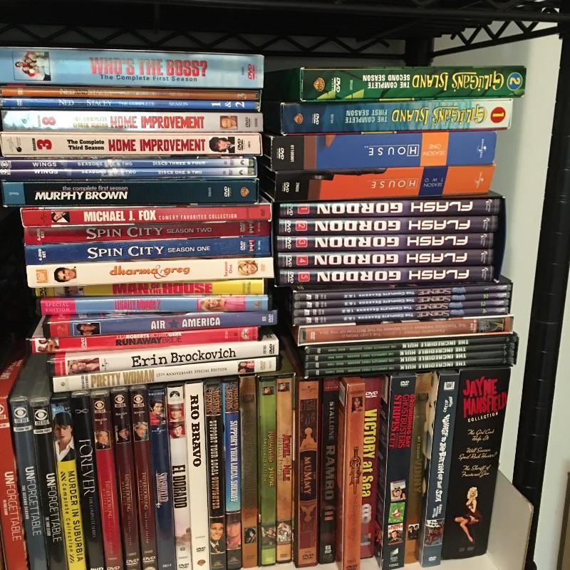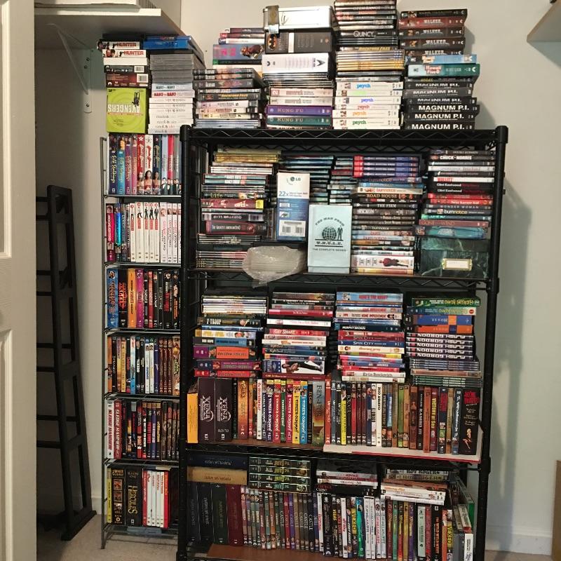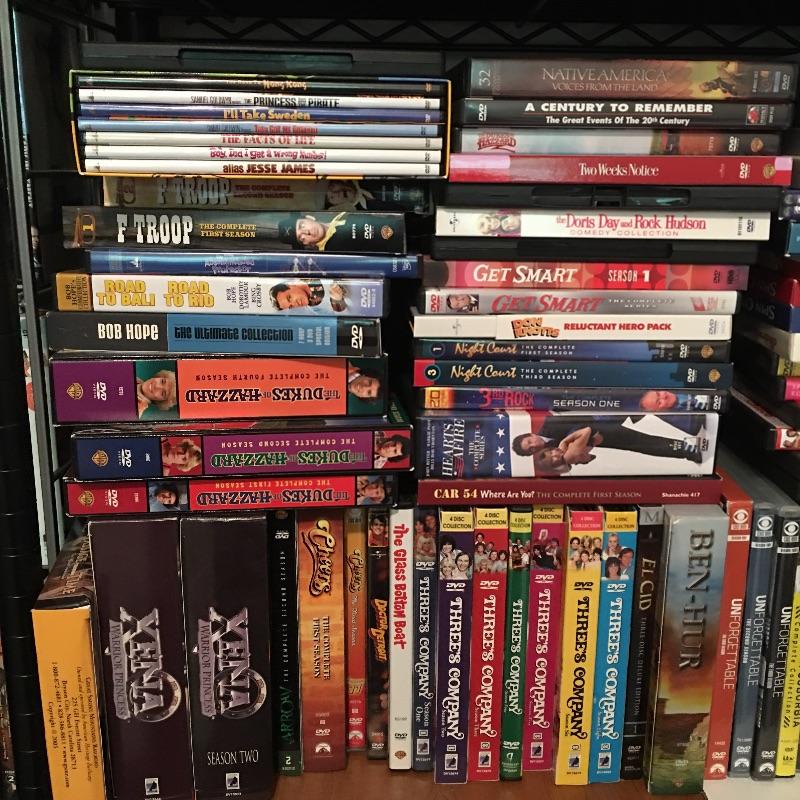 You should be able to cancel your Netflix and binge watch theses DVDs for years! This lot includes hundreds of DVDs movies and series collections including Star Trek, Batman Anthology, Superman, Monk, Ben Hur, Magnum P. I., Dukes of Hazzard and so many more, see pictures for more titles. Also includes three DVD stands. Large black bookcase is not included, but available in lot 197. Largest DVD stand measures 22” x 6” x 47”.