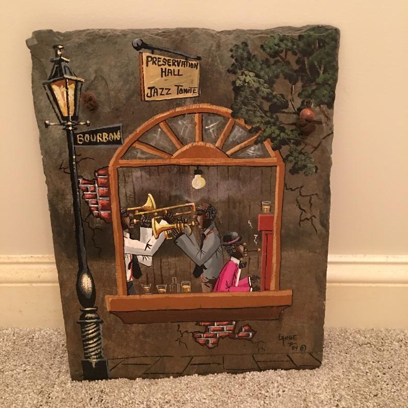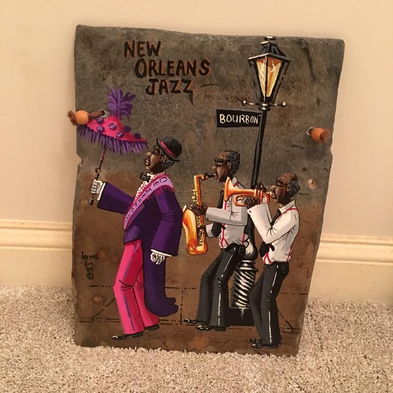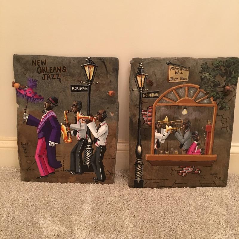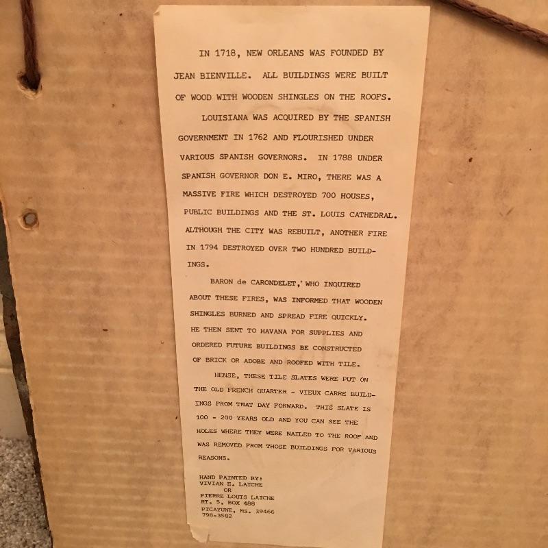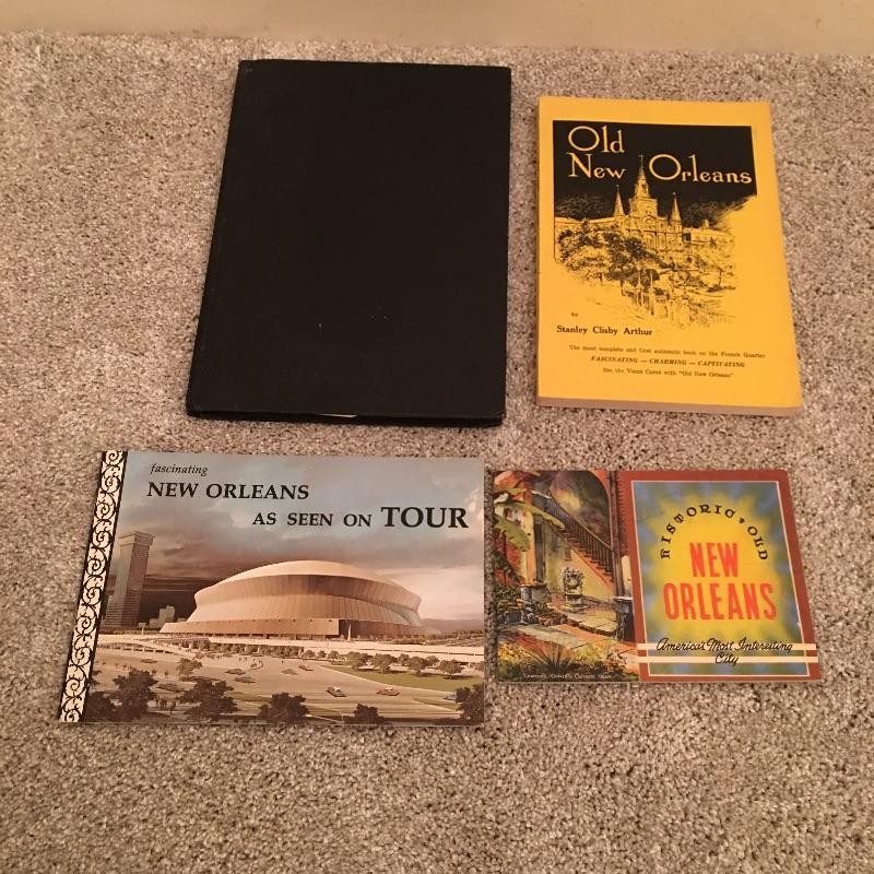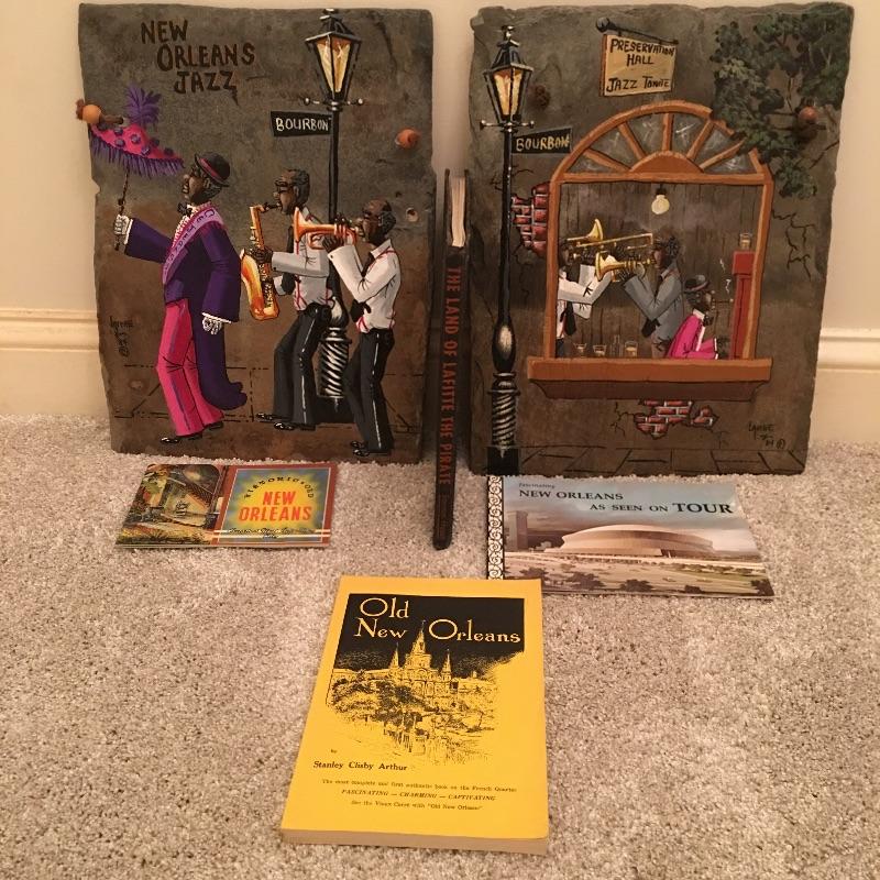 Pair of tile slates from the old French quarter with hand painted New Orleans design and book and pamphlets on New Orleans. Tiles measure 12” x 16”.