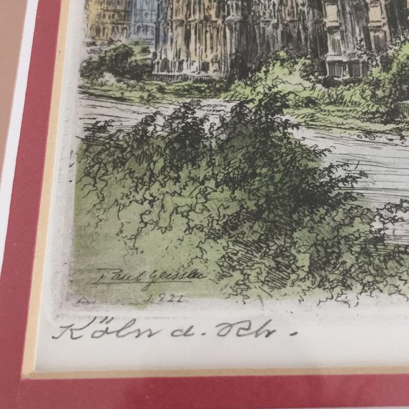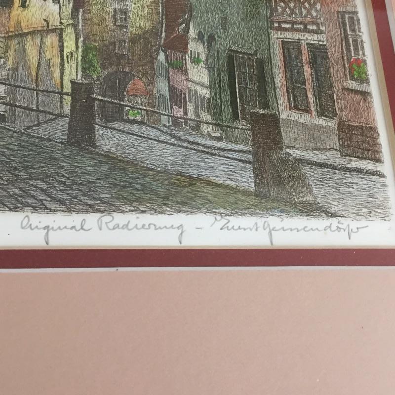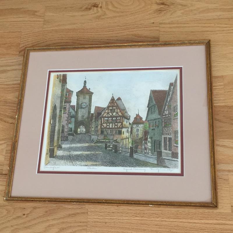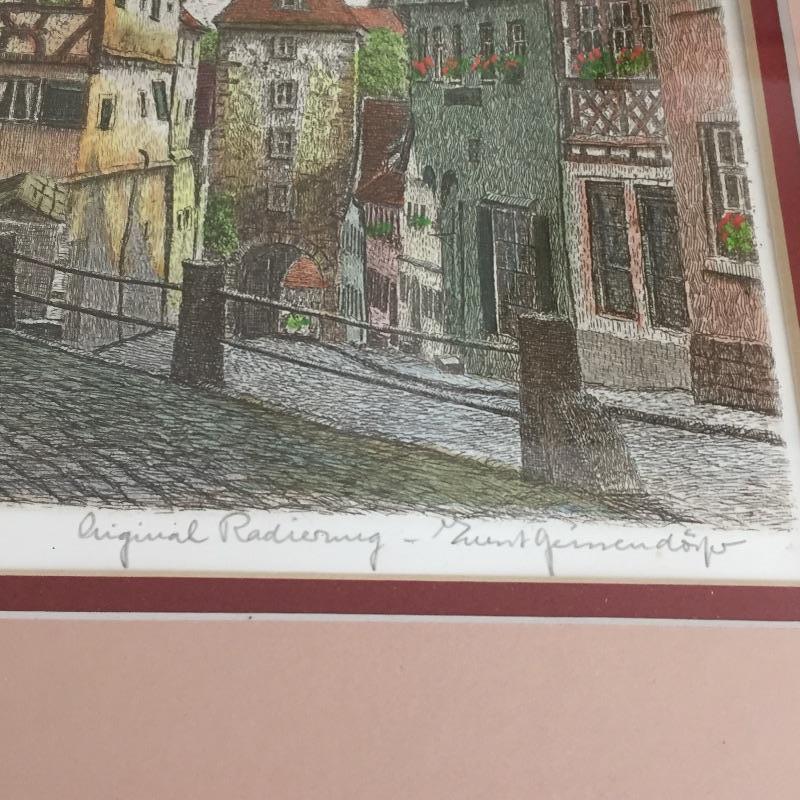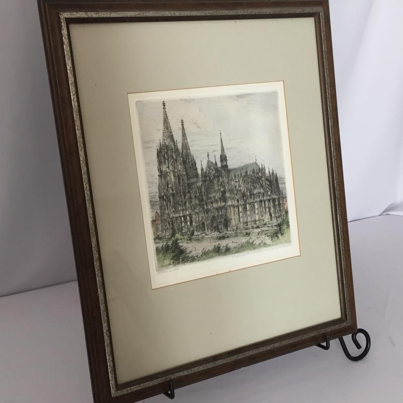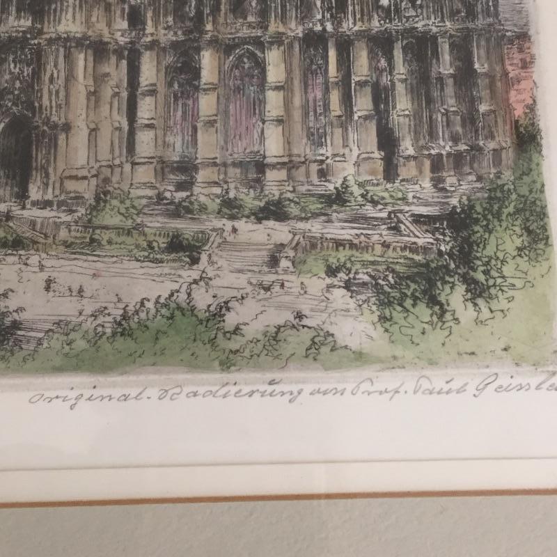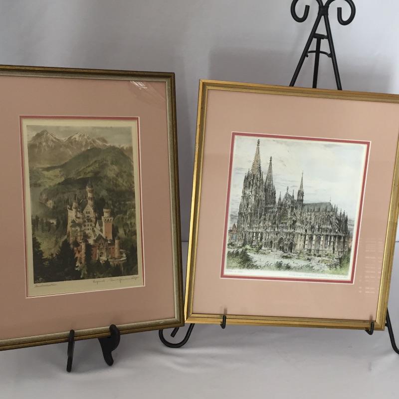 Wonderful collection of original etchings by various German artists. All but the one are signed. For the signed pieces, we have a color etching of Rothenburg Tauber by Ernst Geissendorfer, two original etchings by Paul Geissler depicting the same cathedral in Cologne Germany, one has slightly more color incorporated into it. They are both signed and come in their matted frames. Then we have an unknown artist on the painting of a turreted castle and an unknown artist for the piece with stone gazebo and lastly a piece of what appears to be a German scene painted on wood that has lots of verbage on the back-see images for more information and for all signatures, etc of these pieces. This last piece has a metal border that has been bent in one place that is shown clearly in the photo.