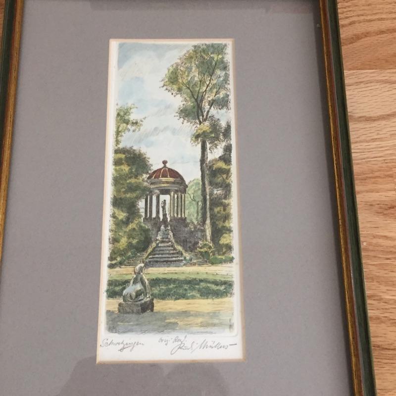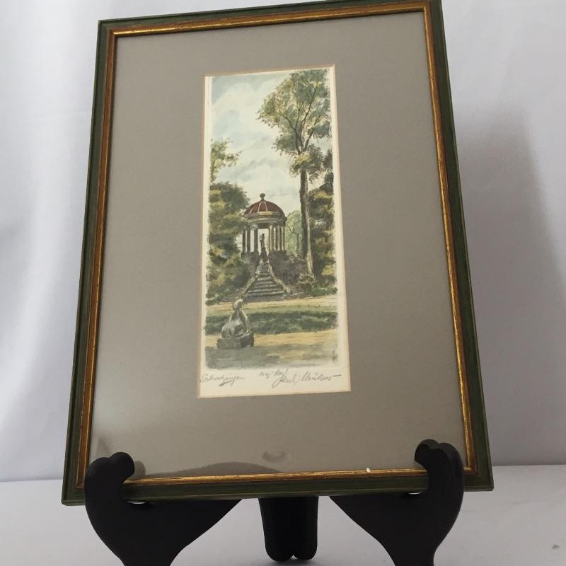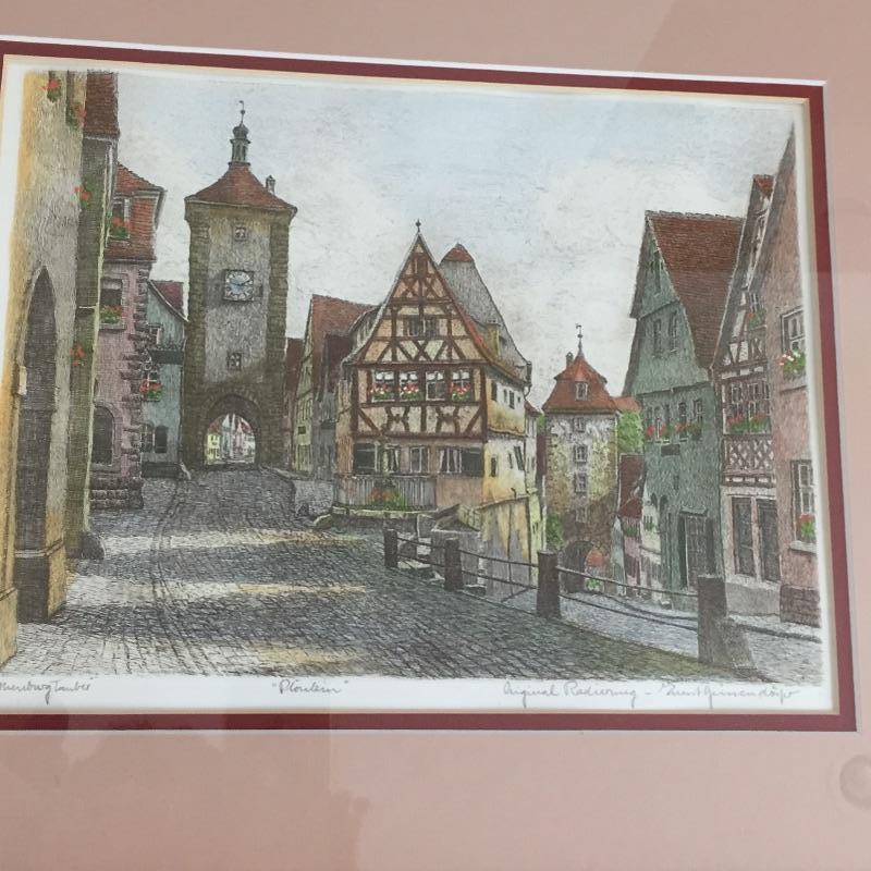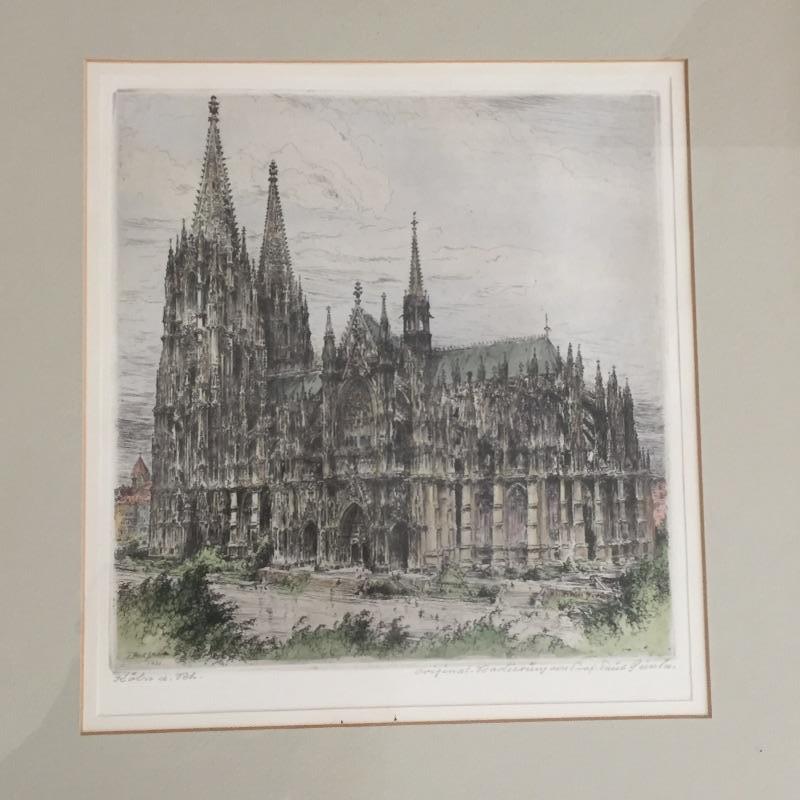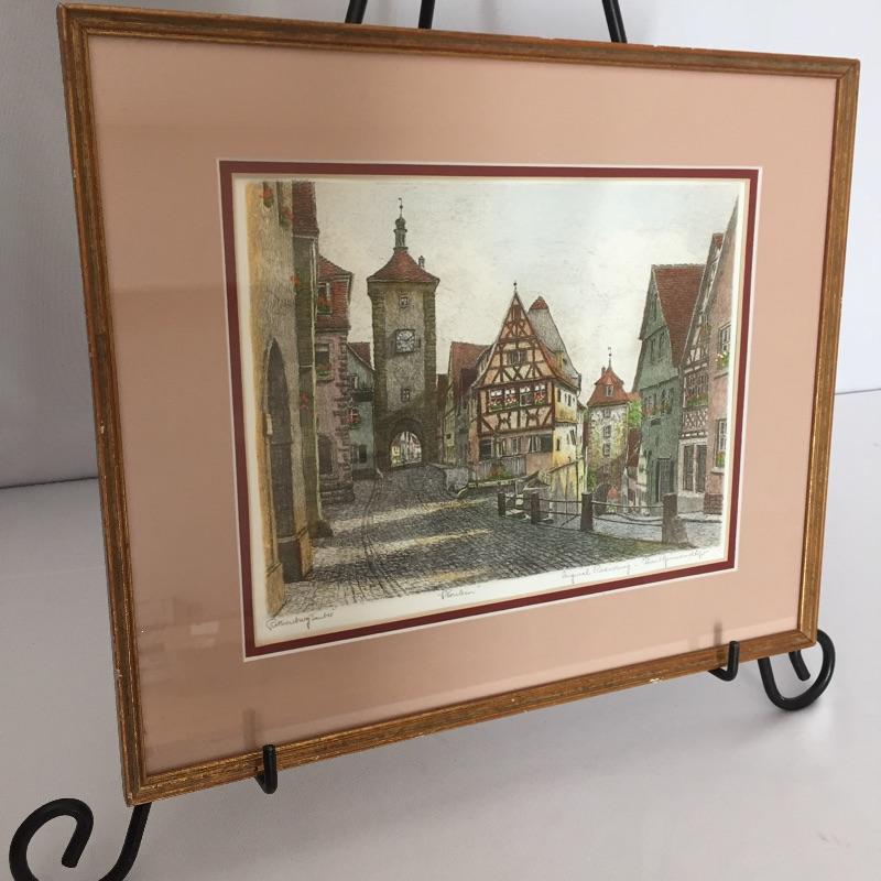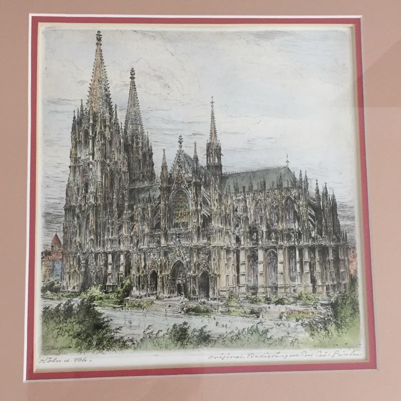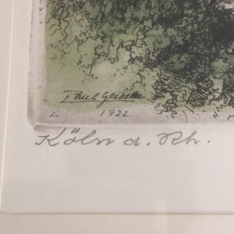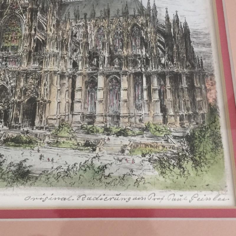 Wonderful collection of original etchings by various German artists. All but the one are signed. For the signed pieces, we have a color etching of Rothenburg Tauber by Ernst Geissendorfer, two original etchings by Paul Geissler depicting the same cathedral in Cologne Germany, one has slightly more color incorporated into it. They are both signed and come in their matted frames. Then we have an unknown artist on the painting of a turreted castle and an unknown artist for the piece with stone gazebo and lastly a piece of what appears to be a German scene painted on wood that has lots of verbage on the back-see images for more information and for all signatures, etc of these pieces. This last piece has a metal border that has been bent in one place that is shown clearly in the photo.