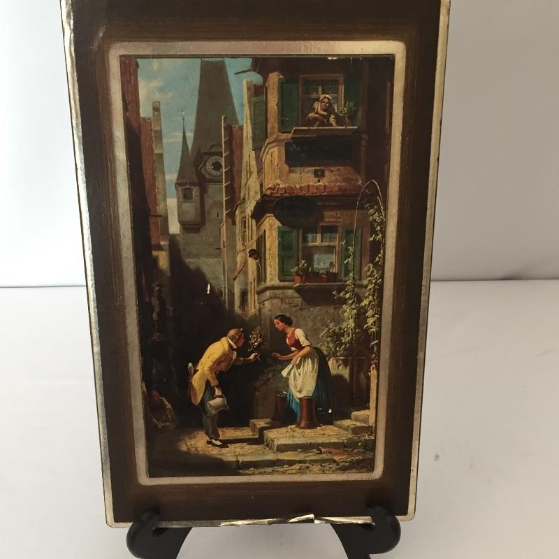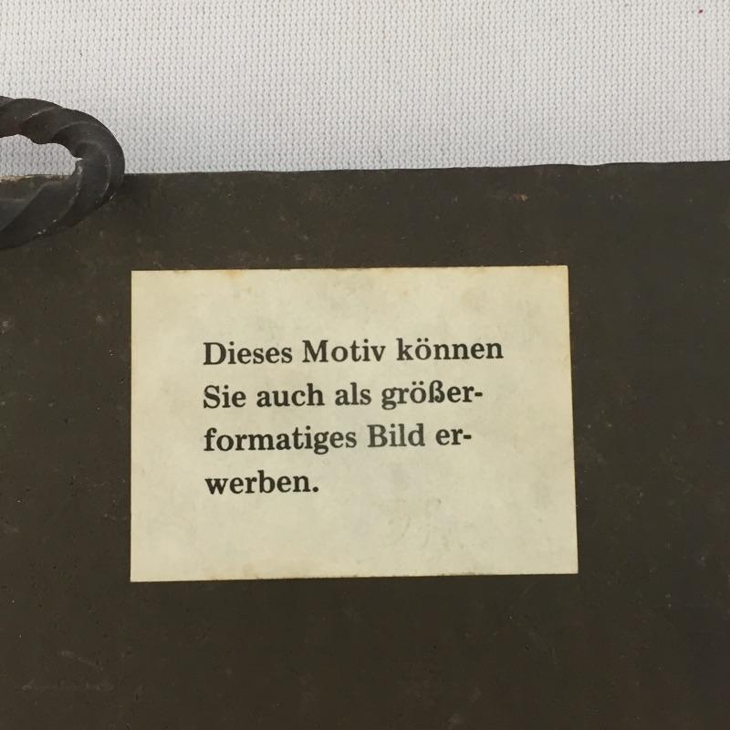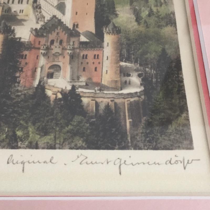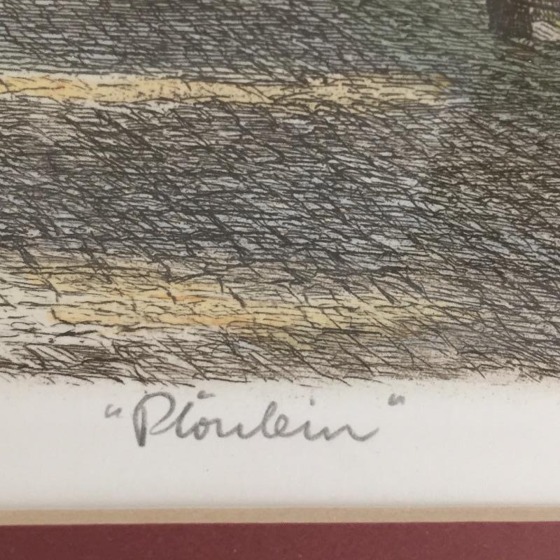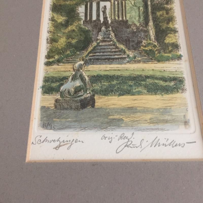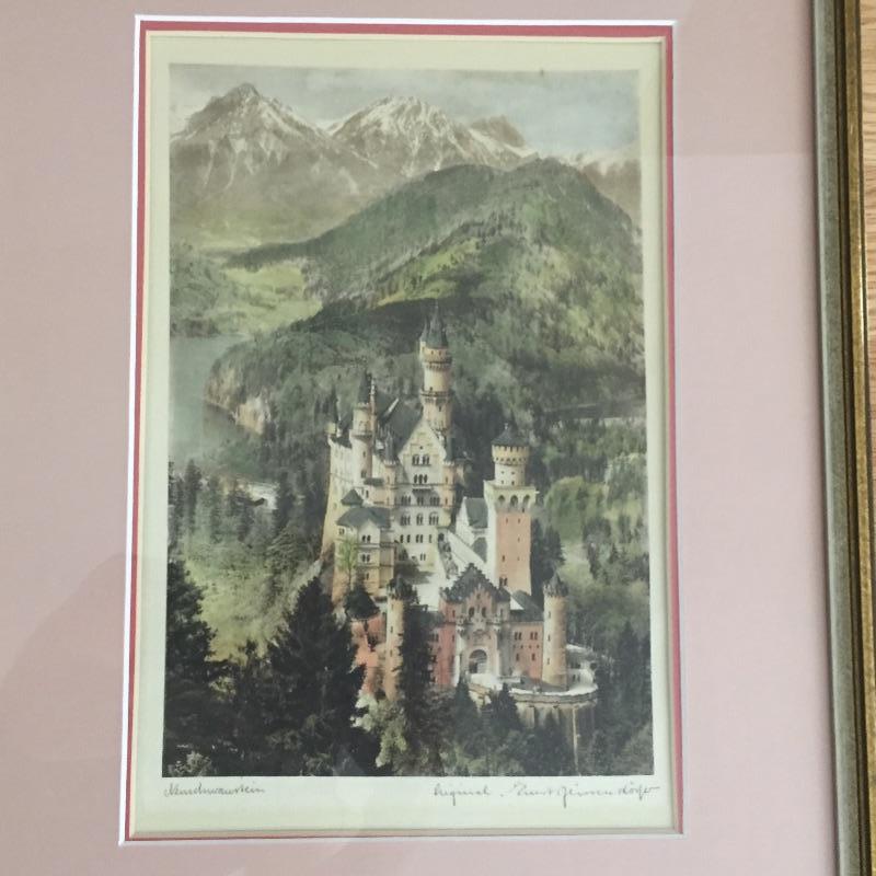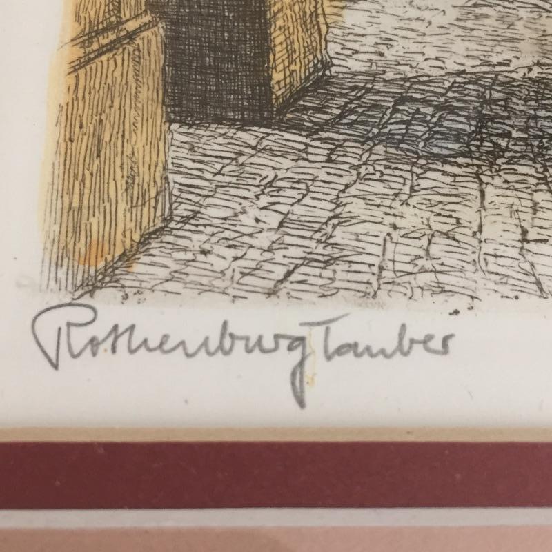 Wonderful collection of original etchings by various German artists. All but the one are signed. For the signed pieces, we have a color etching of Rothenburg Tauber by Ernst Geissendorfer, two original etchings by Paul Geissler depicting the same cathedral in Cologne Germany, one has slightly more color incorporated into it. They are both signed and come in their matted frames. Then we have an unknown artist on the painting of a turreted castle and an unknown artist for the piece with stone gazebo and lastly a piece of what appears to be a German scene painted on wood that has lots of verbage on the back-see images for more information and for all signatures, etc of these pieces. This last piece has a metal border that has been bent in one place that is shown clearly in the photo.