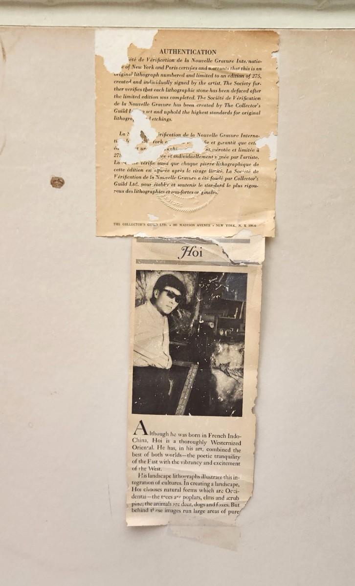 The artist information on the reverse describes the artist as "a thoroghly Westernized Oriental" - you can tell that was written in the 60's. The artist, Hoi, was known for his unusual landscape lithographs. #69/275, pencil signed. 10" across, 24.5" tall - Mid Century Modern.