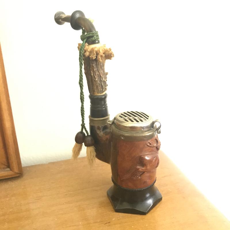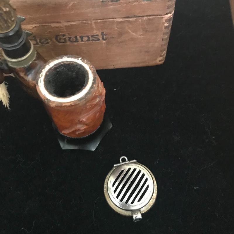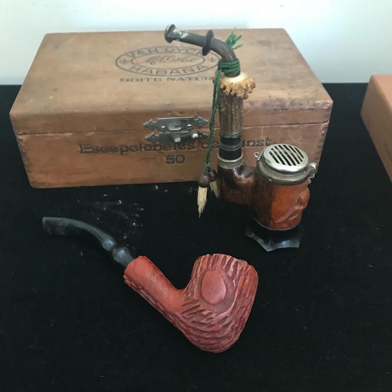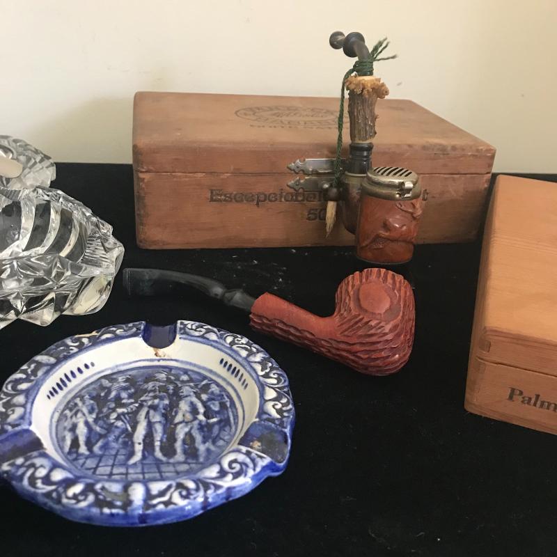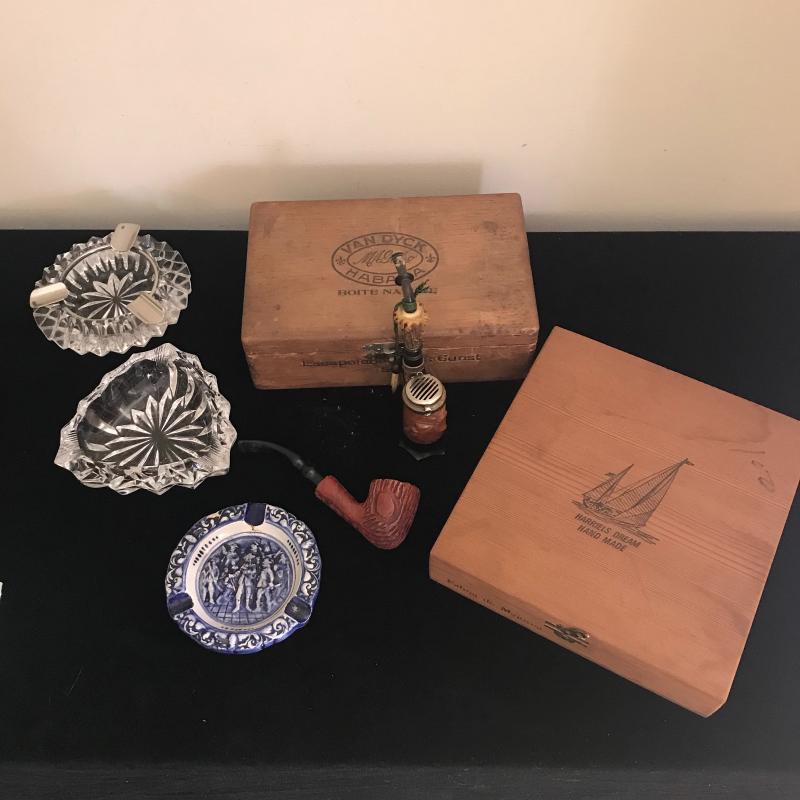 Cigar boxes, glass ashtrays, Dutch delays ceramic ashtray and two tobacco pipes. One pipe appears to be cared wood with bone. Has Allweter and the number 3461 imprinted in sides. Shipping available.