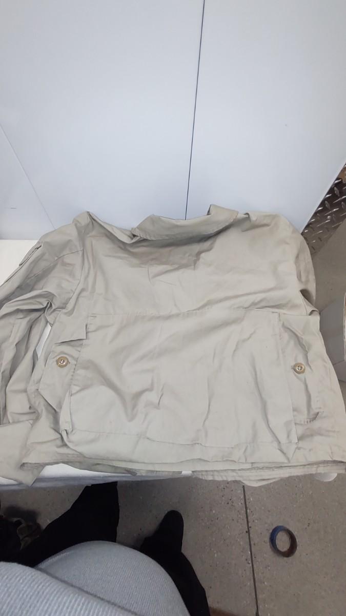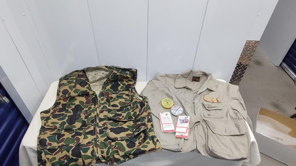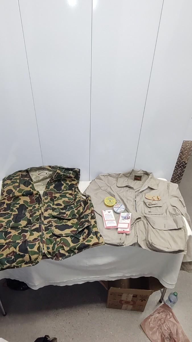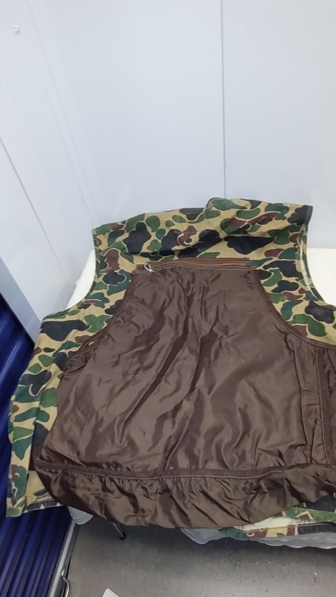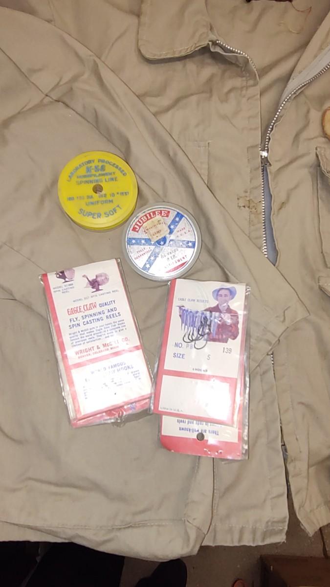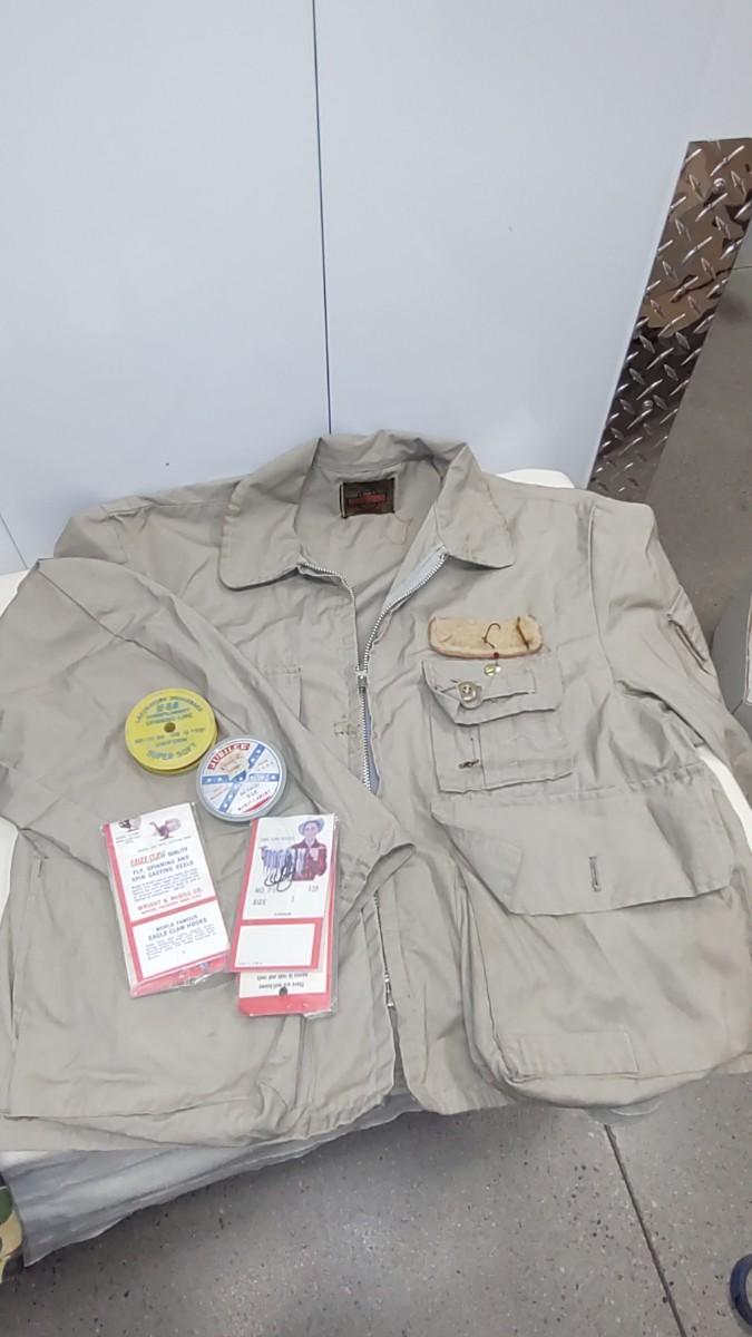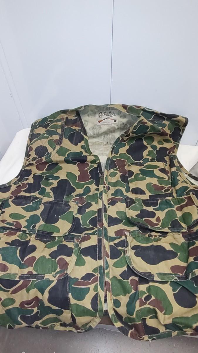A BRAND NEW CABELA'S HUNTING VEST WITH SHOULDER CUSHION SUPPORT, USED SAF T BAK WATER REPELLENT JACKET, TWO ROLLS OF FISHING LINE, TWO PACKS OF EAGLE CLAW HOOKS