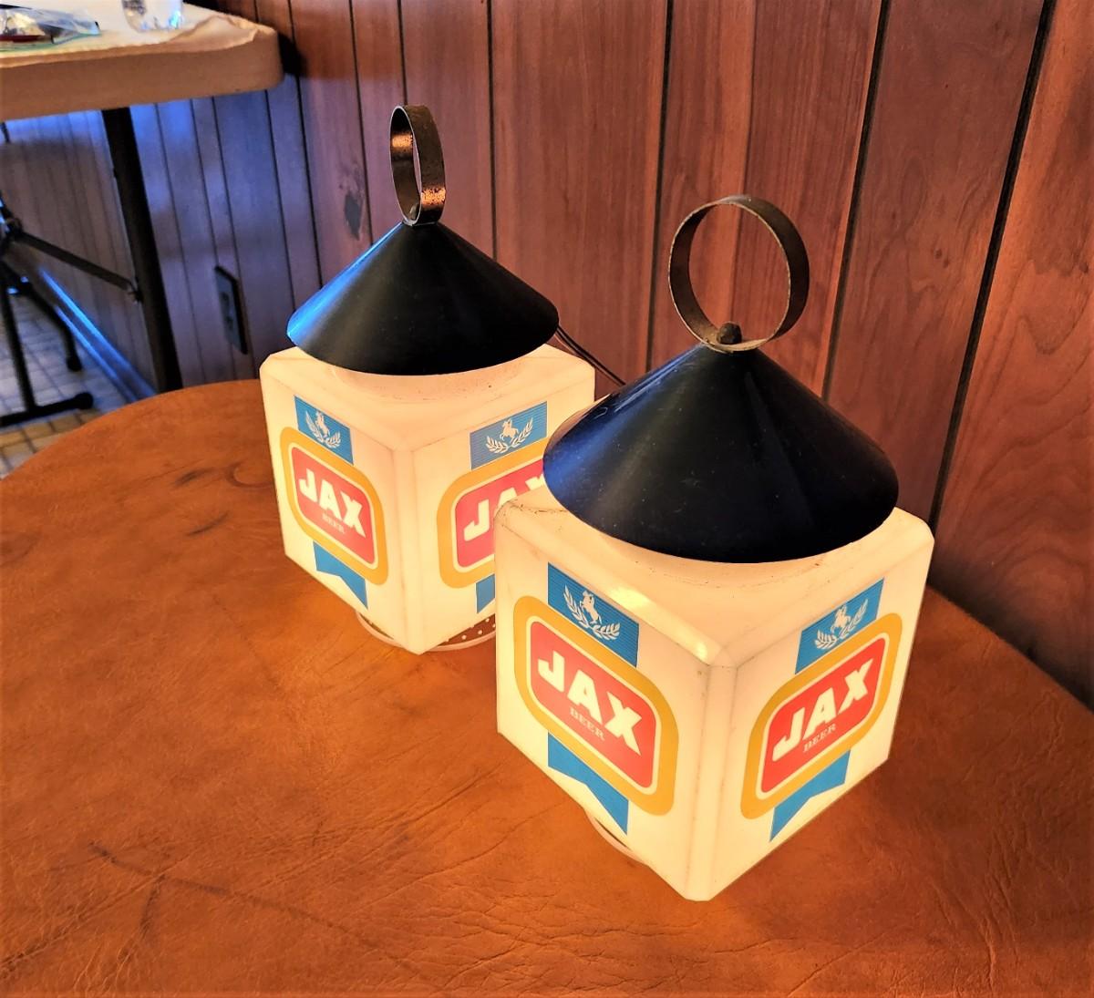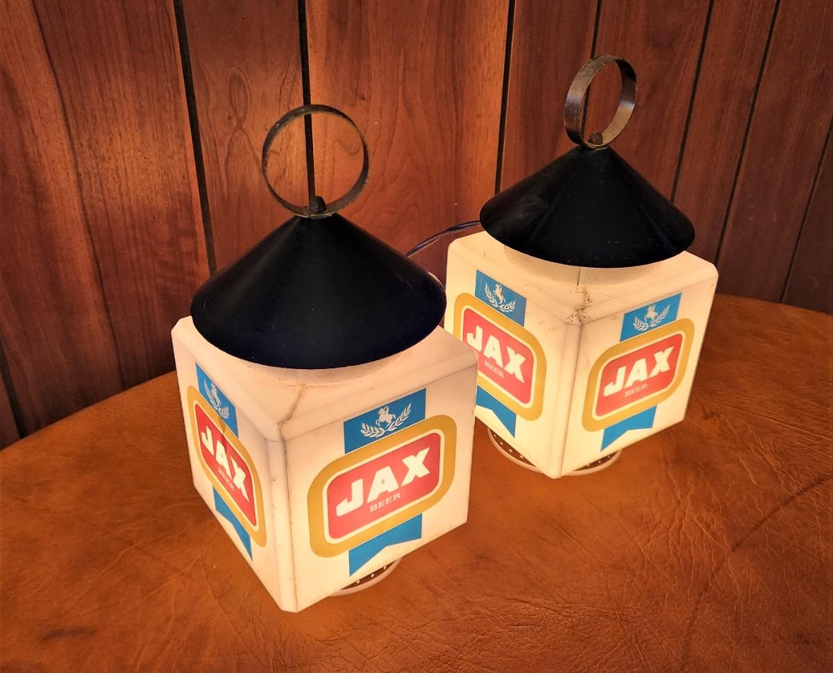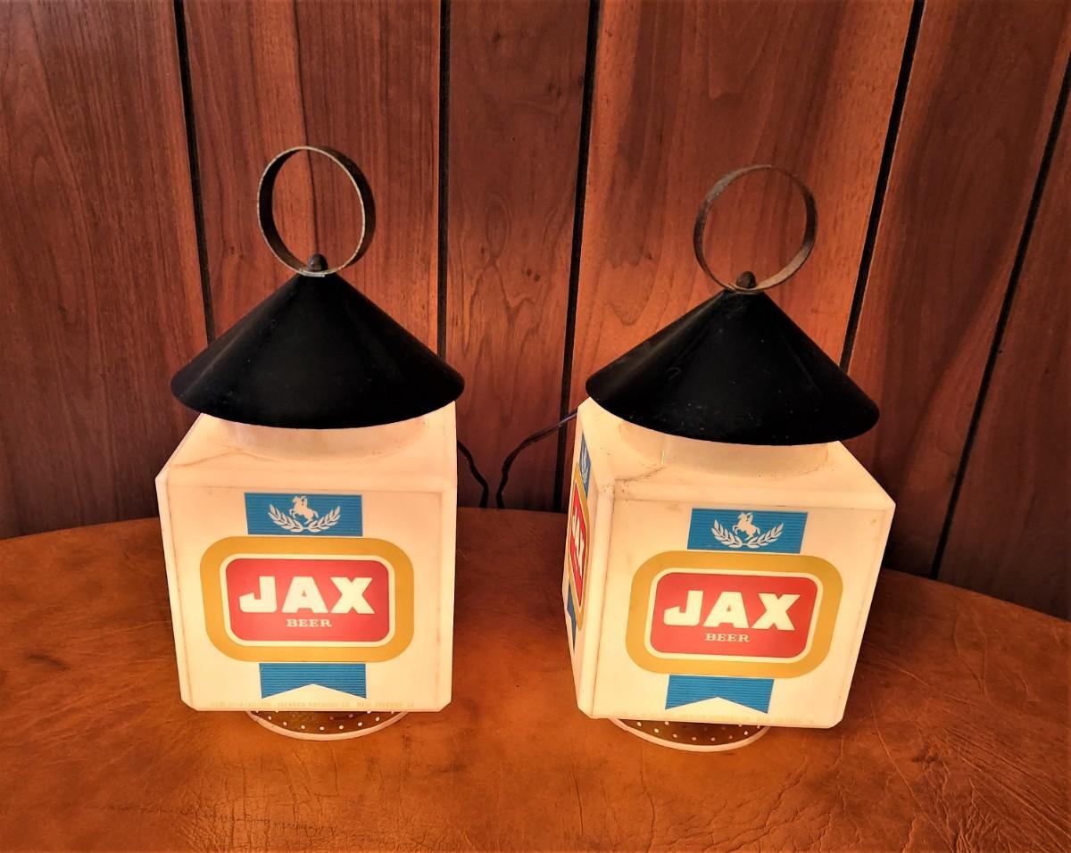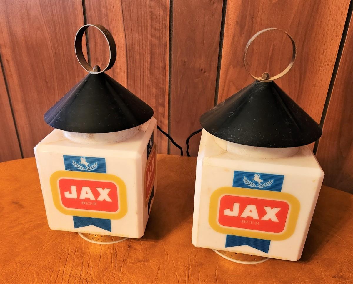 You may never see another pair like this. Vintage Lantern style plastic (50's) JAX beer lights - working condition (plug in). 10" tall, 5" across. Great vintage condition.