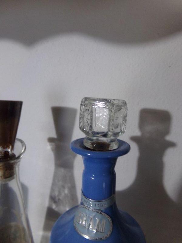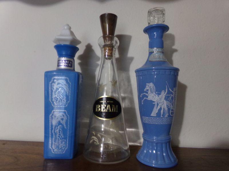 LOT 189  VINTAGE 1965 JIM BEAM BLU/WHT MILK GLASS BTL-SHEPARD/DOG,  1960 J.M. CLEAR BTL W/ GEESE,  1960 J. B. BLU/WHT DECANTER W/ GREEK CHARIOT
