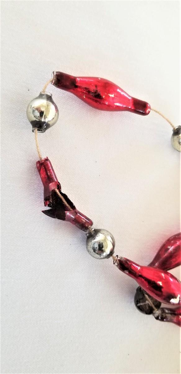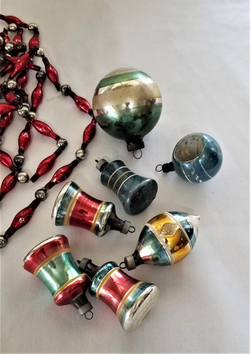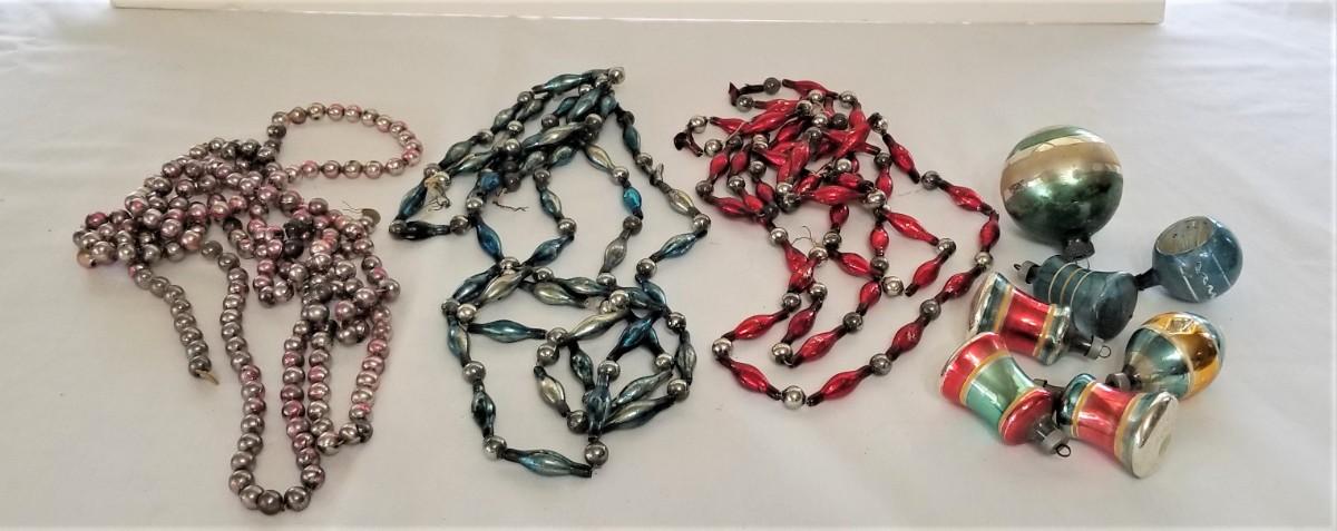 Nice vintage Christmas lot here - 3 strands of vintage mercury glass garland - each about 104" long. Note: as is common with this old garland, a few of the beads on each are broken, but does not detract. There are also 7 vintage glass ornaments. All in vintage condition.