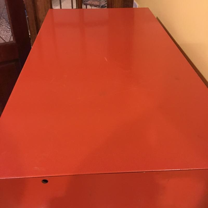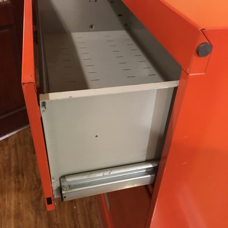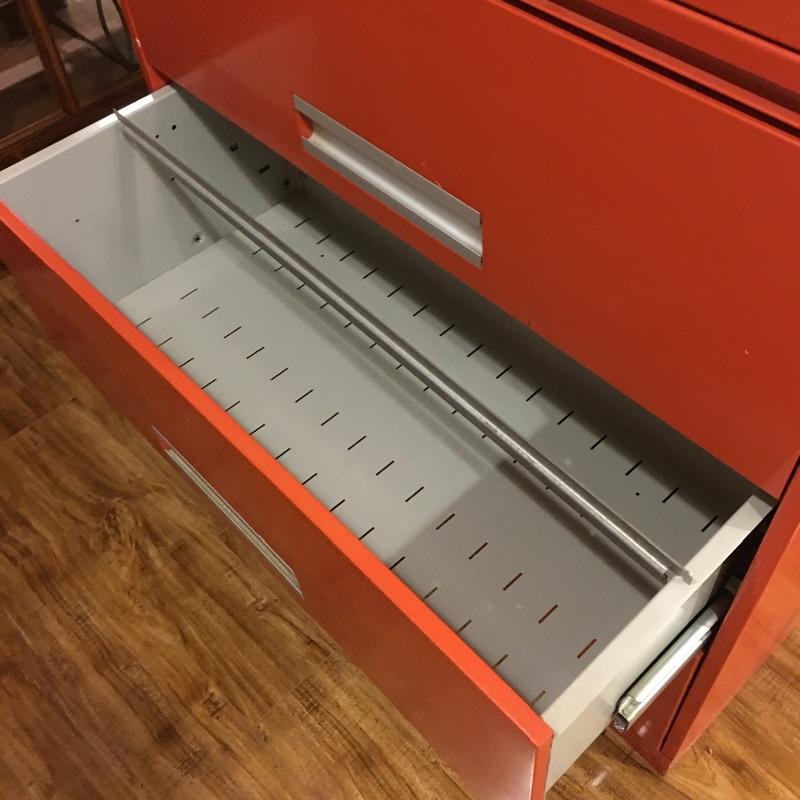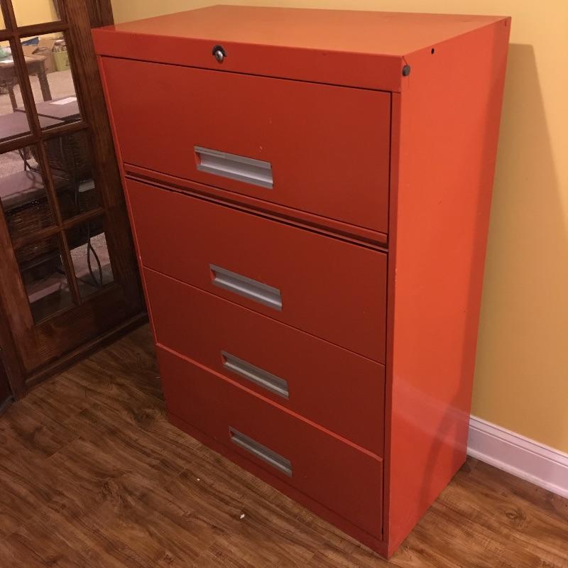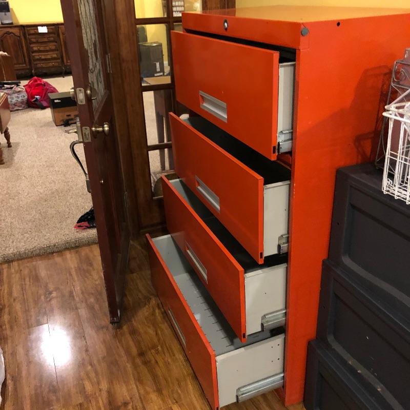 Add a little color with this orange four drawer metal file cabinet. Its made by Supreme Equipment Systems of NY. A great find for all you Clemson or Florida fans out there to put in your home office, man cave or she shed! Drawers fit either standard or legal sized folders. The drawers glide smoothly, and it was manufactured with its bright orange color!