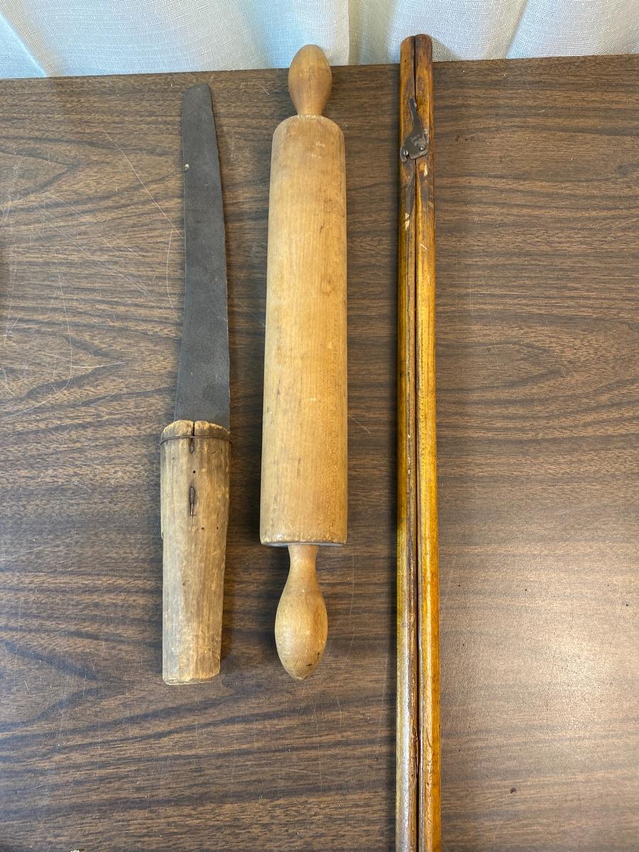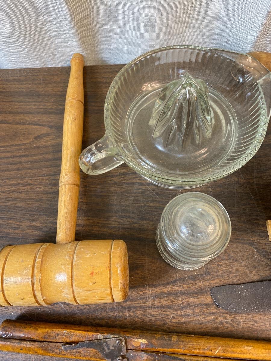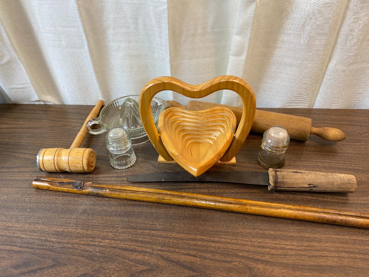 Lot 189 Vintage Wood Glass Kitchen Lot Insulators Primitive Knife Meat Mallet Collapsible Basket Rolling Pin
