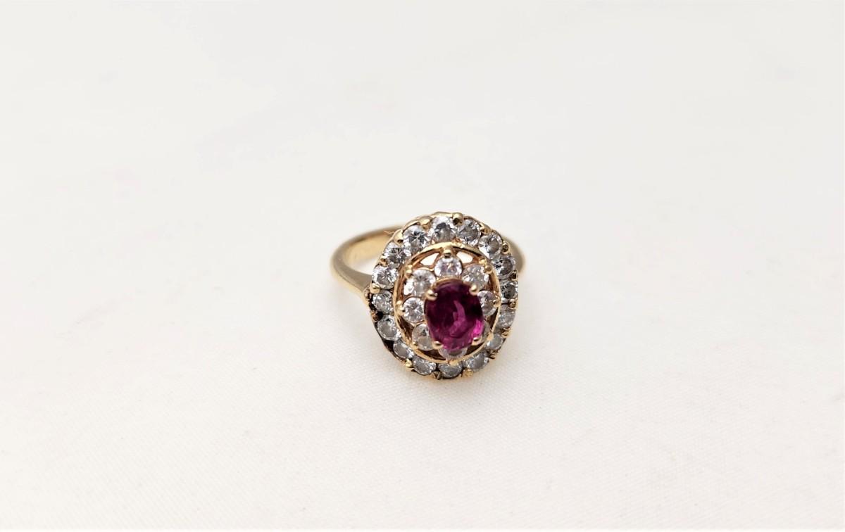 Vintage 14kt yellow gold cocktail ring, size 5.5, set with a center ruby and surrounding diamonds. Good condition. Opening bids for fine jewelry are set a little above scrap price and will not be reduced.