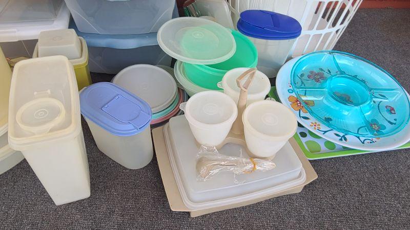 Nice lot of vintage Tupperware, laundry basket, storage containers and more. Please see all pictures for content of the lot, condition of the lot, and measurements if taken. Pictures are the best representation of the items listed and items are untested unless indicated in description. Thank you for looking and have fun bidding!