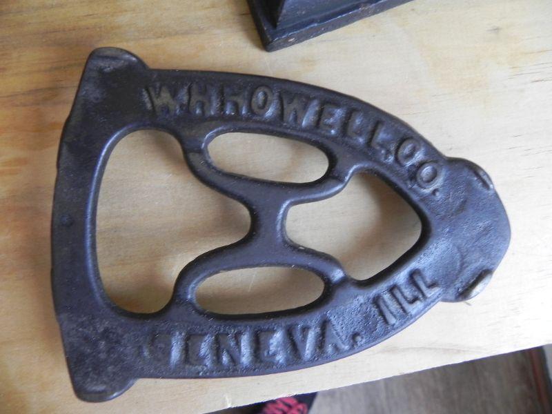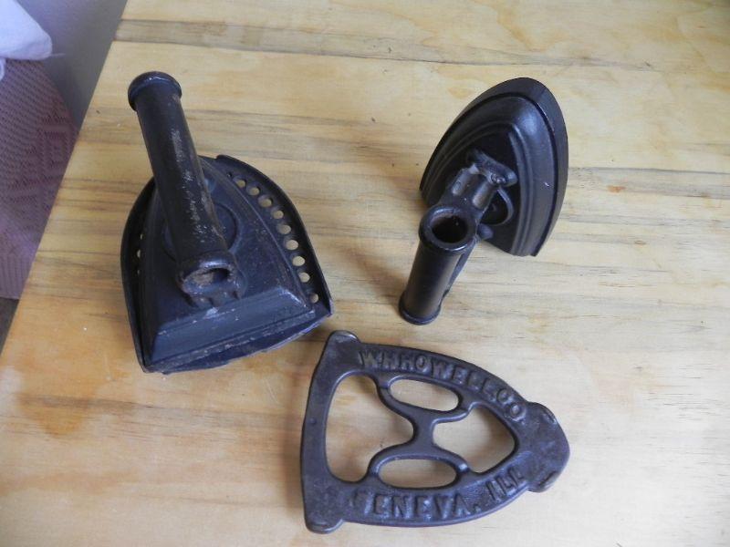 2 CAST IRON VINTAGE CLOTHES IRONS WITH HOLDERS, ONE STAMPED WHKOWELL, CO. GENEVA, ILL., ONE IRON STAMPED WITH #5/700/K