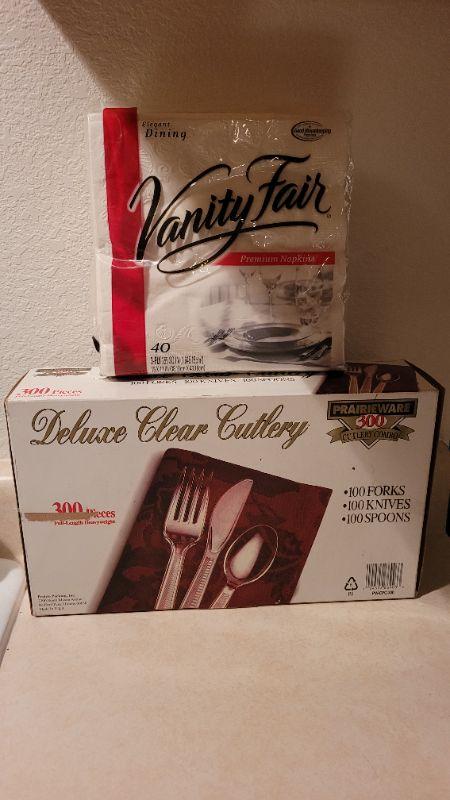 Lot 19; New Plastic Cutlery Set + Vanity Fair Napkins