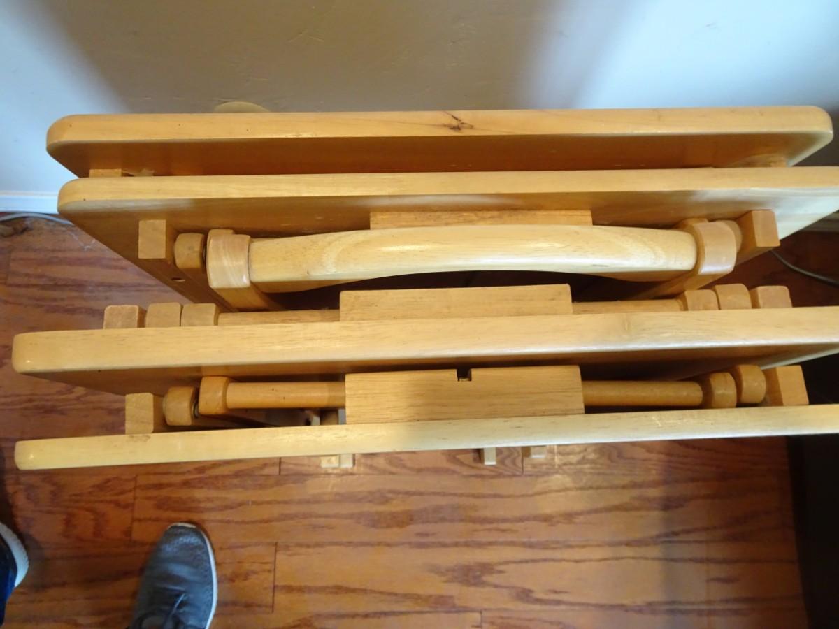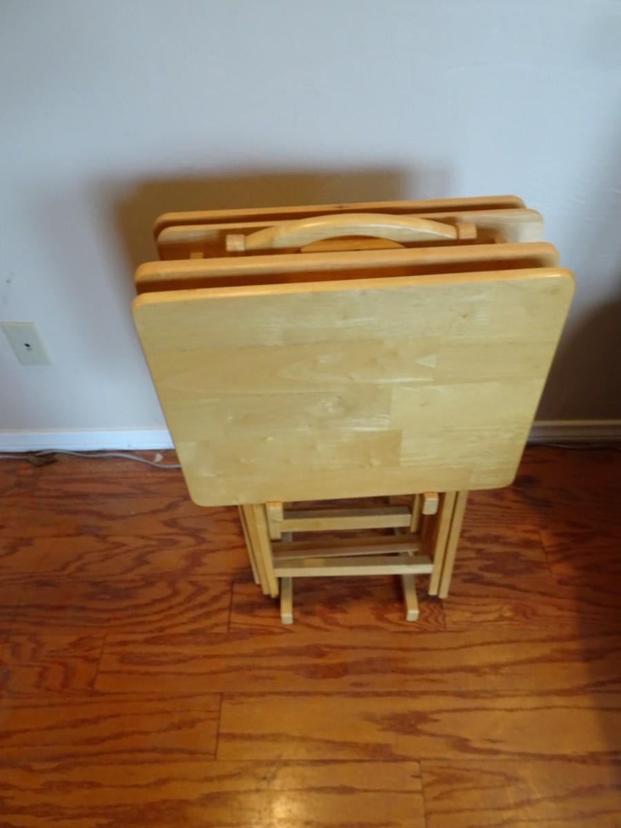 LOT 19. WOOD TV TRAY TABLE SET OF FOUR