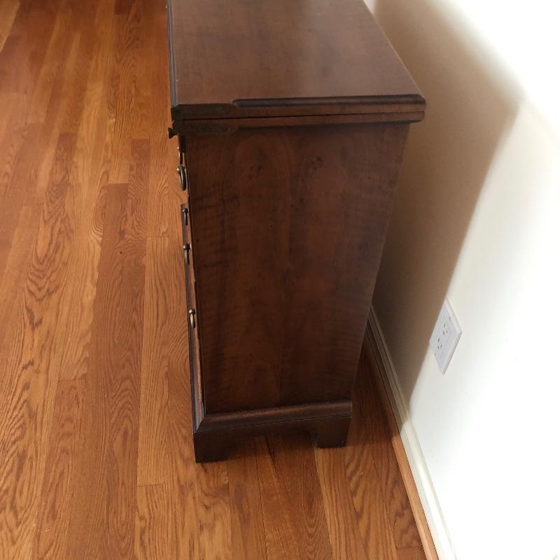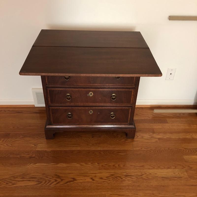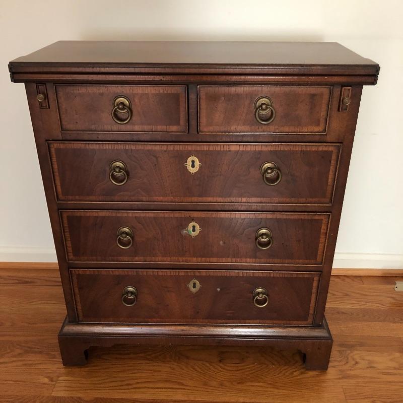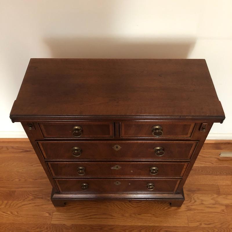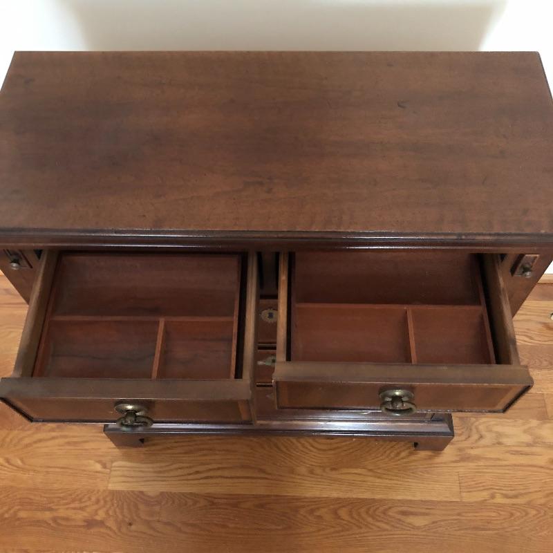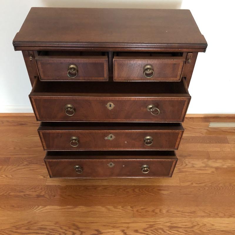This antique bachelors chest comes with five dovetailed drawers and fold down leaf that doubles the width. The top two smaller drawers have removable compartment trays. Pulls appear to be brass and the wood appears to be mahogany, but we cannot make any guarantees. It’s a beautiful small chest of drawers that is in very good condition.