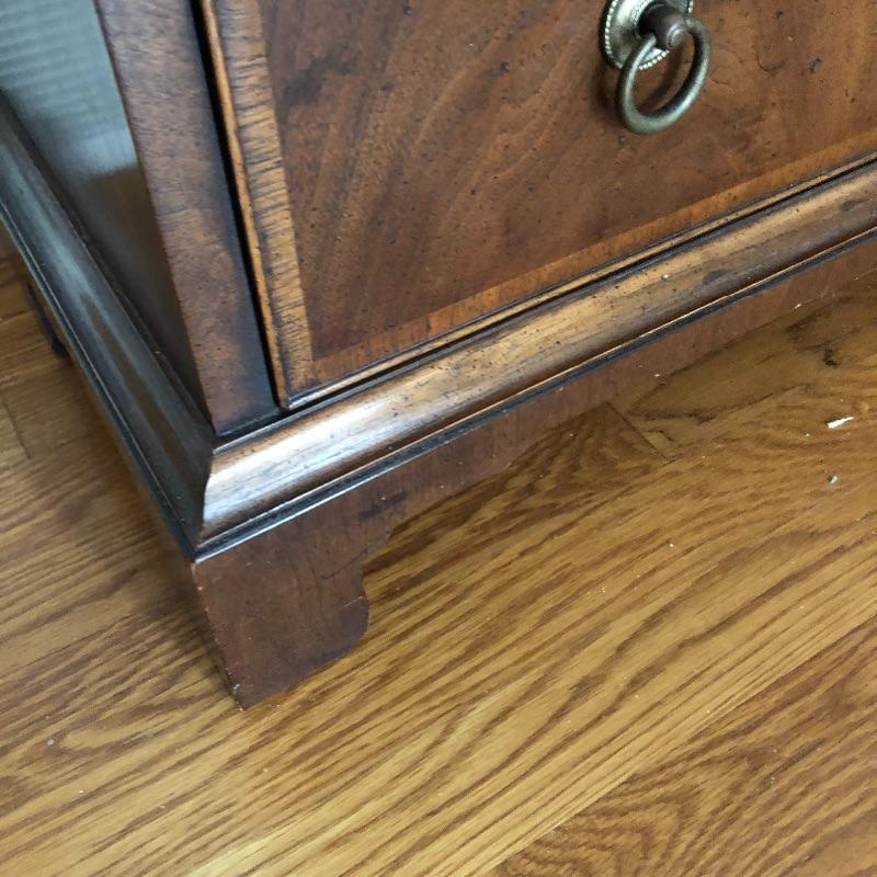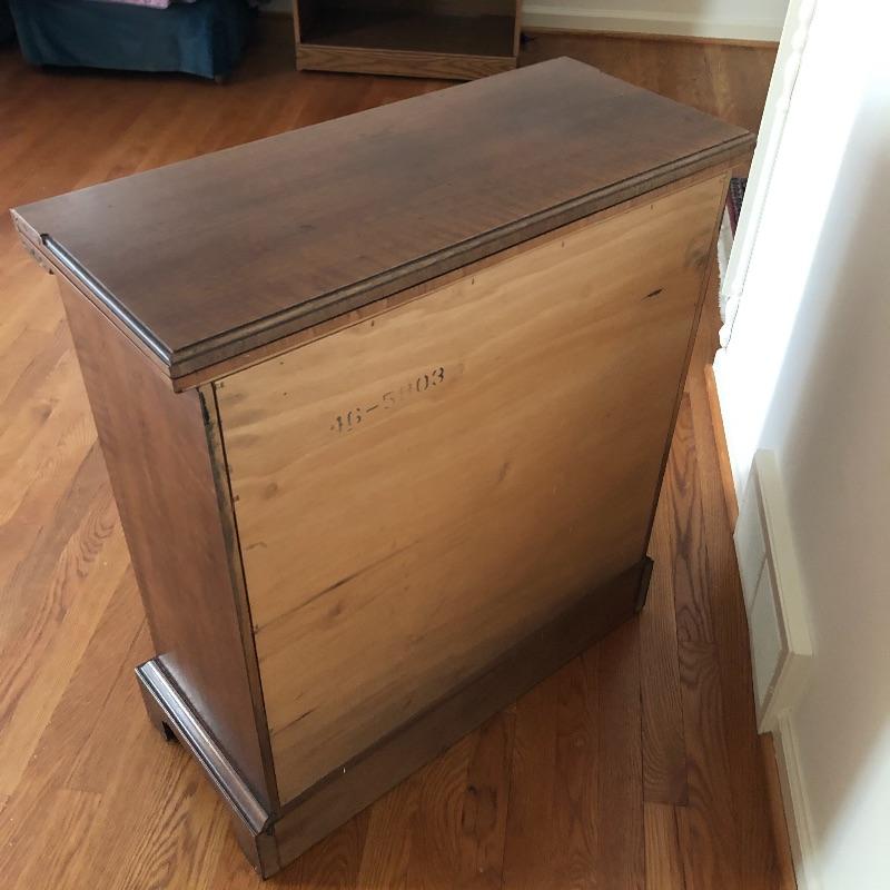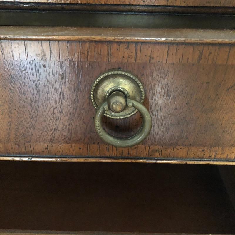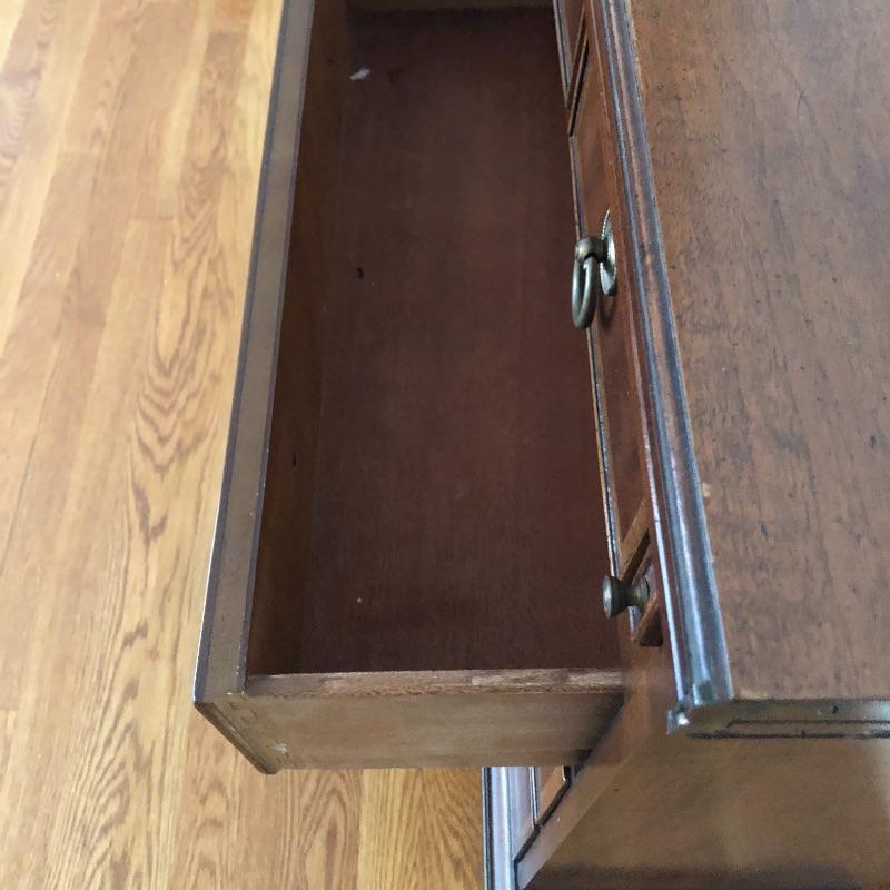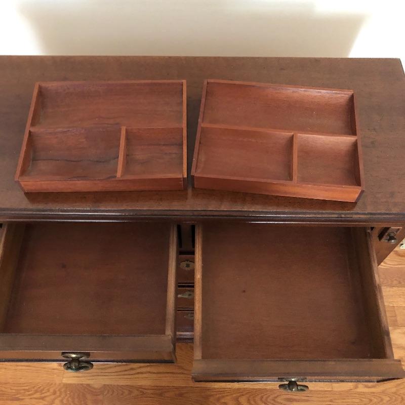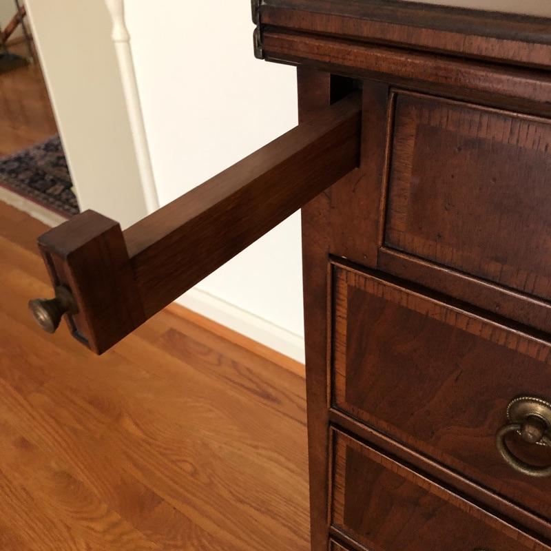 This antique bachelors chest comes with five dovetailed drawers and fold down leaf that doubles the width. The top two smaller drawers have removable compartment trays. Pulls appear to be brass and the wood appears to be mahogany, but we cannot make any guarantees. It’s a beautiful small chest of drawers that is in very good condition.