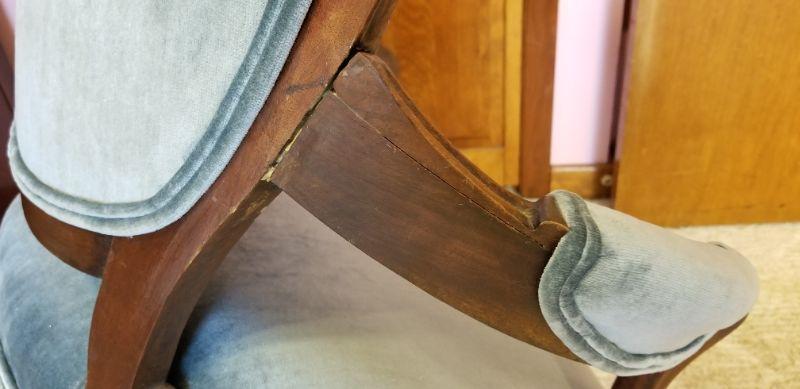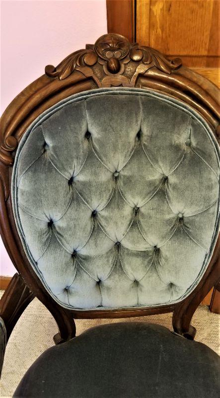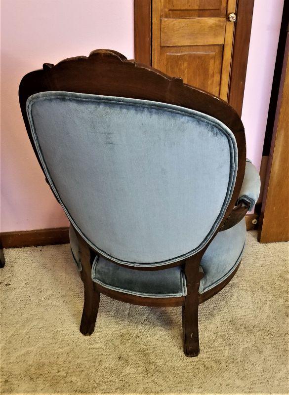 Nice, solid antique Victorian Ladies parlor chair - upholstered in blue velveteen - ca. 1870. Good antique condition - 40" tall, 25" across, 22" deep. Old repair to one arm (as shown) - not especially noticeable - solid and pretty clean. Nice detailing on front.