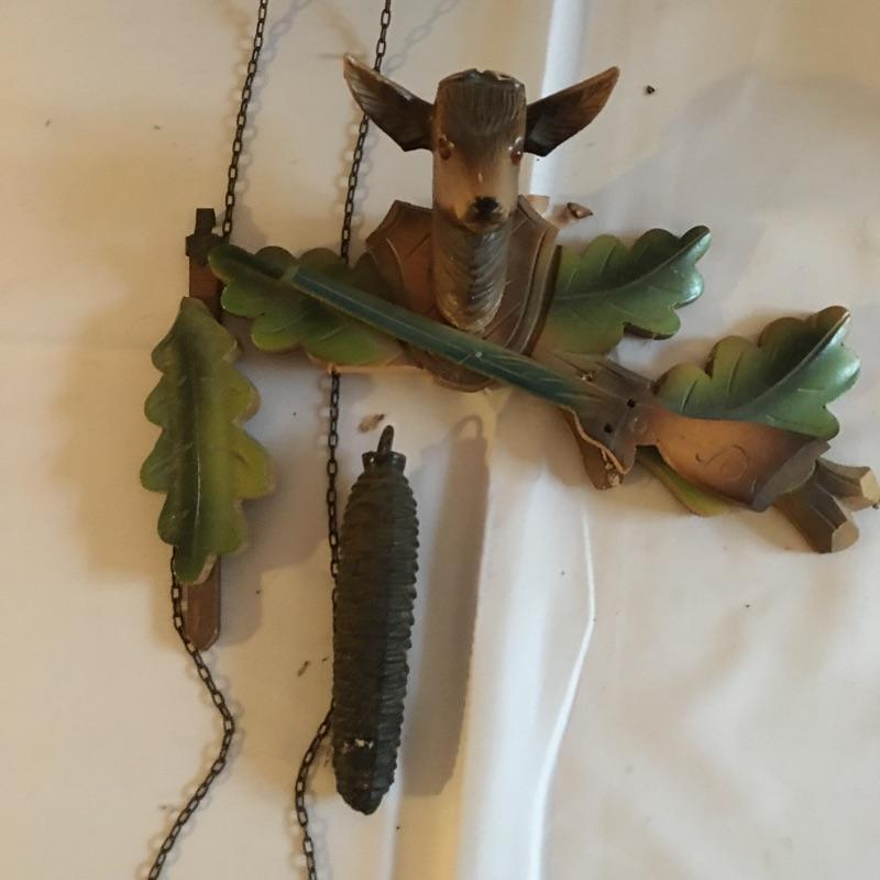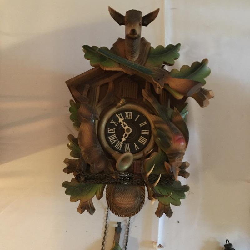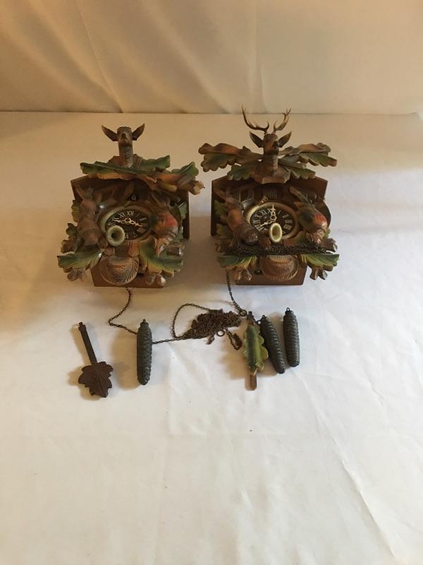 This lovely pair of Bachmaier & Klemmer German cuckoo clocks are the perfect project with all that is going on in the world. One clock is missing one weight and the chains are not attached on either clock and one is missing the deer antlers. Clocks measure 5.5” x 8.5” x 11”. A little bit of patience and skill and you should have these clocks working in no time.