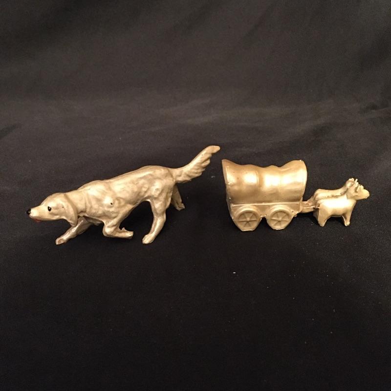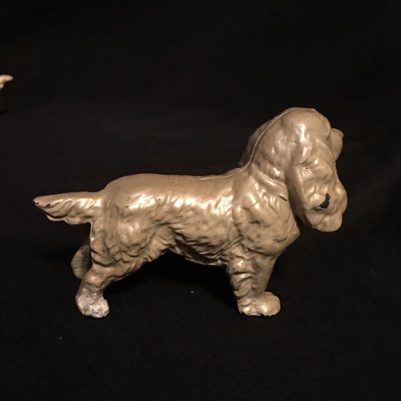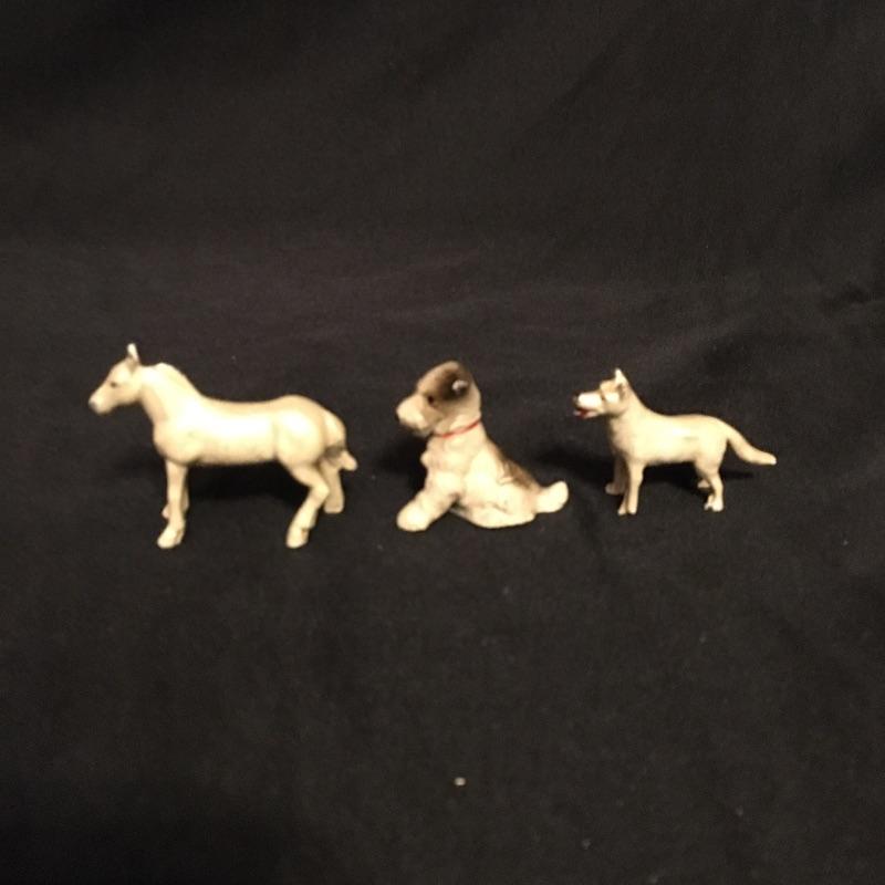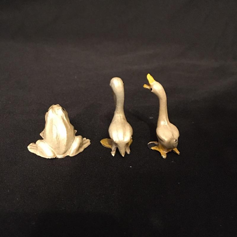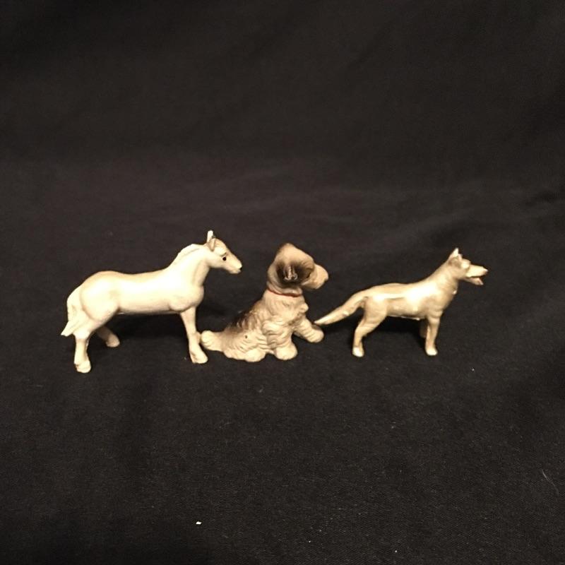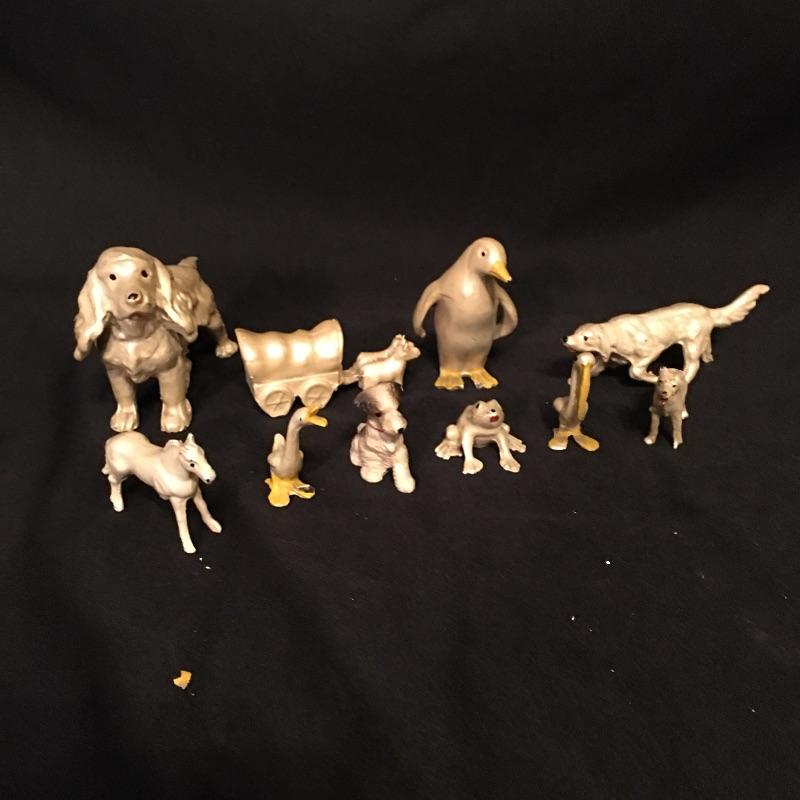 A total of 10 cast iron collectibles here that appear to have been painted an attractive iridescent pearl color. The largest figurine measures 1.5” x 4” x 3”. There are dogs, a horse, geese, a frog and even a penguin.