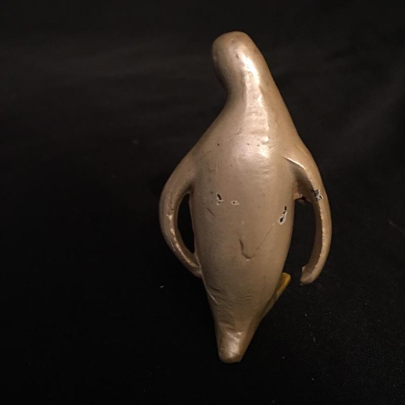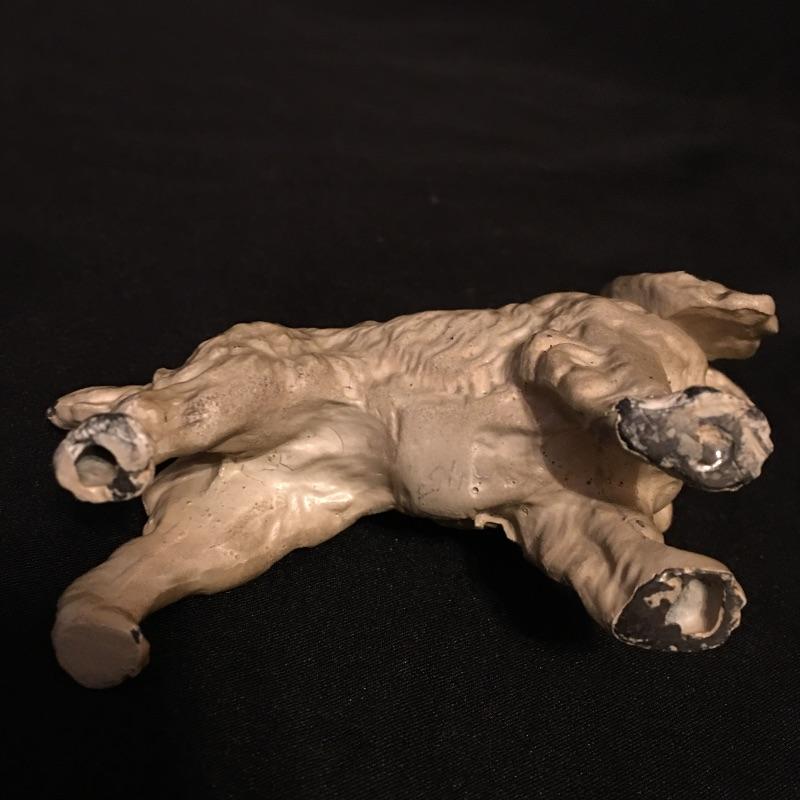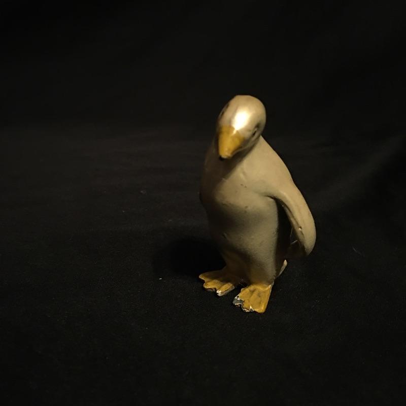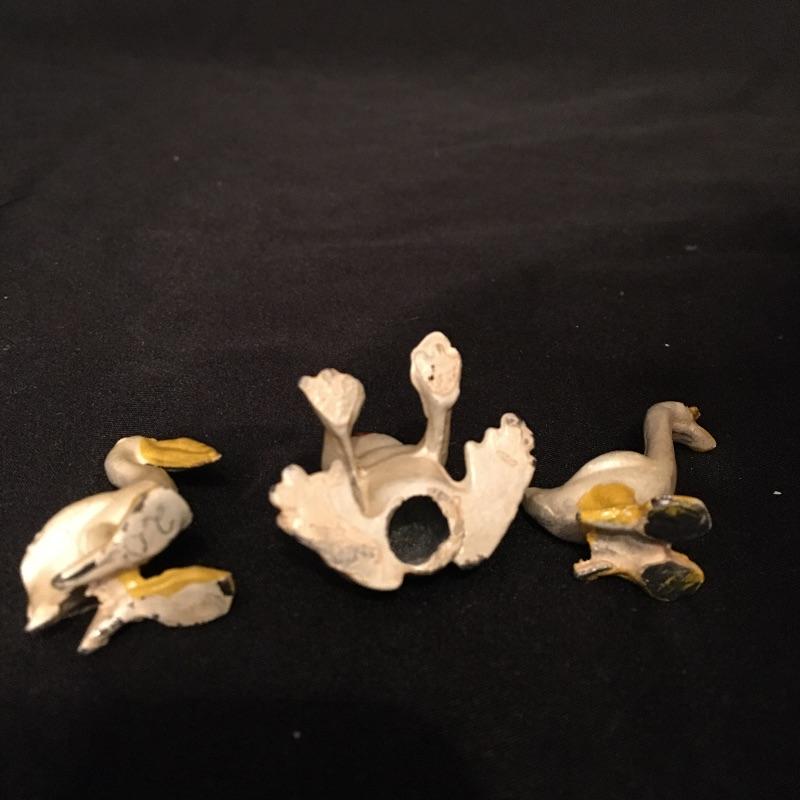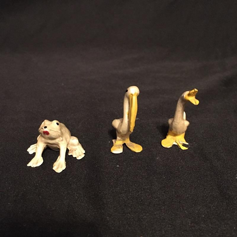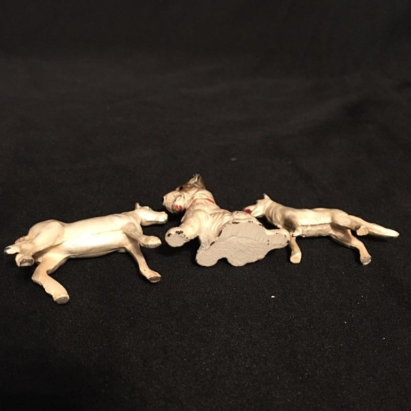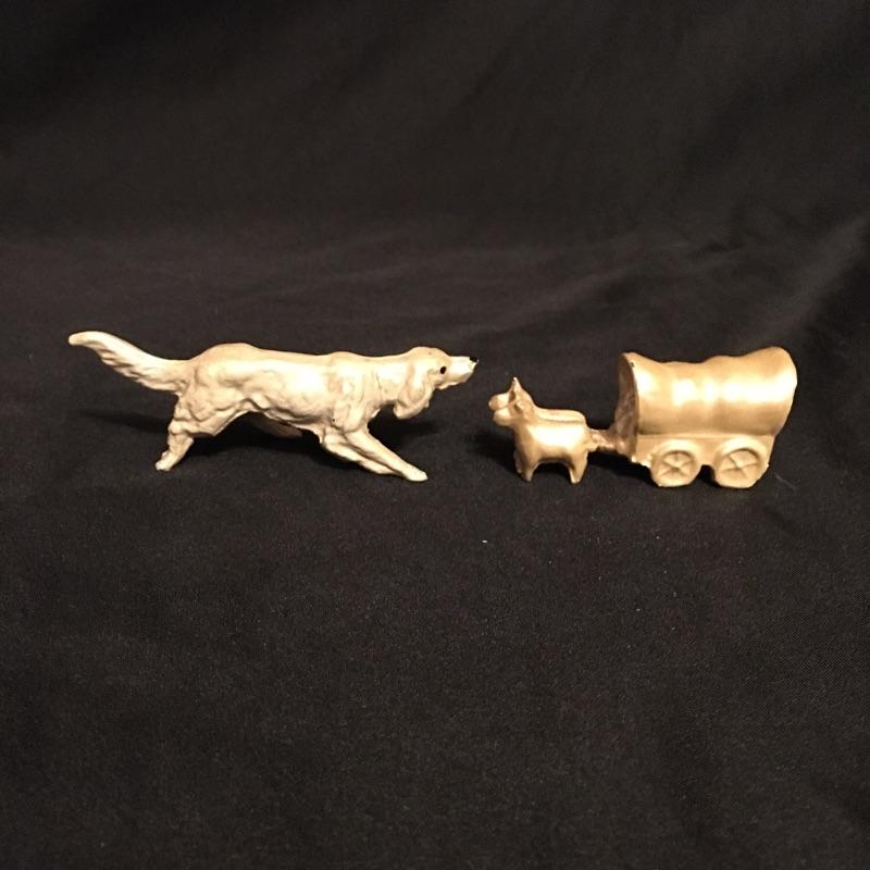 A total of 10 cast iron collectibles here that appear to have been painted an attractive iridescent pearl color. The largest figurine measures 1.5” x 4” x 3”. There are dogs, a horse, geese, a frog and even a penguin.