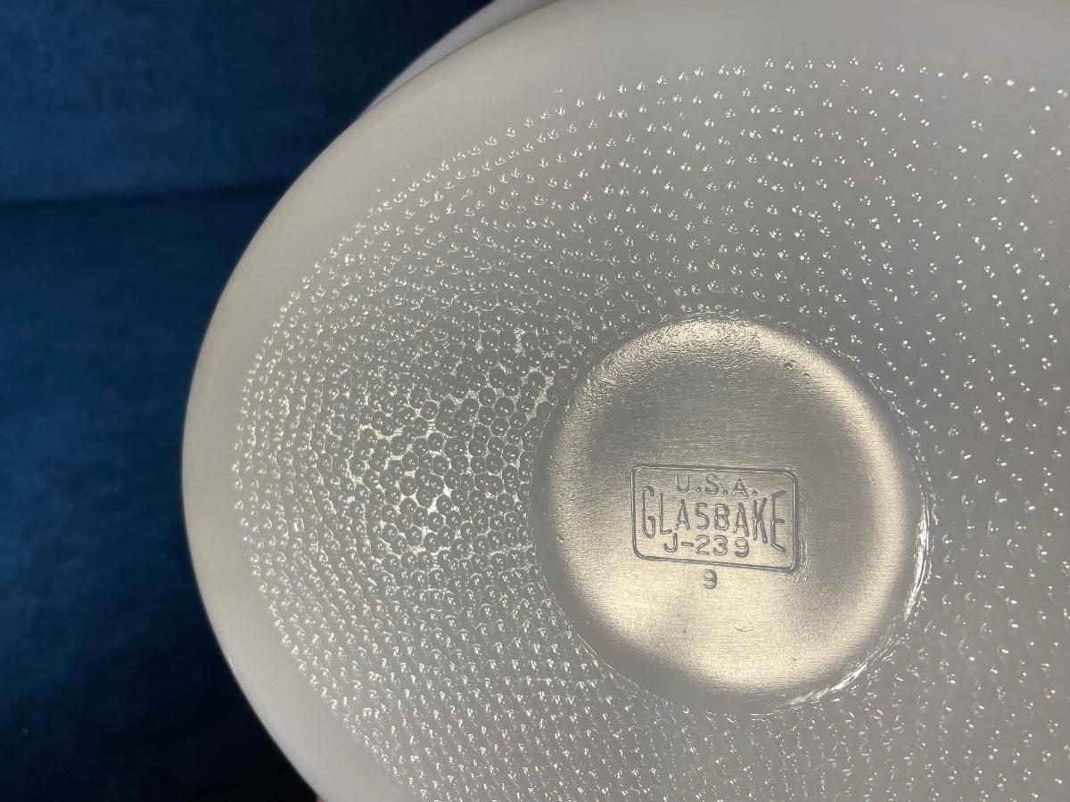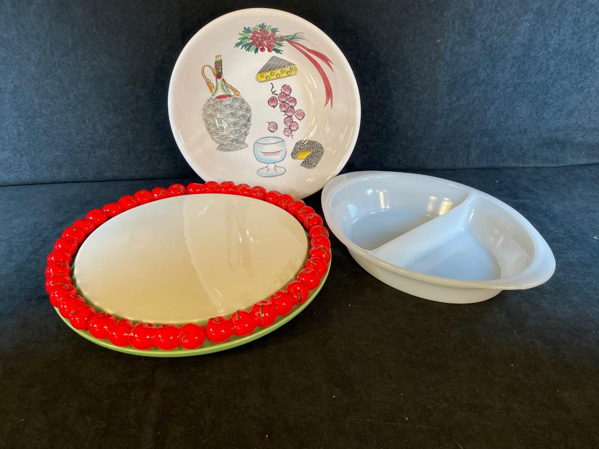 Ceramic cake stand/plate with raised cherry border, pasta serving bowl and a vintage GlasBake divided vegetable bowl