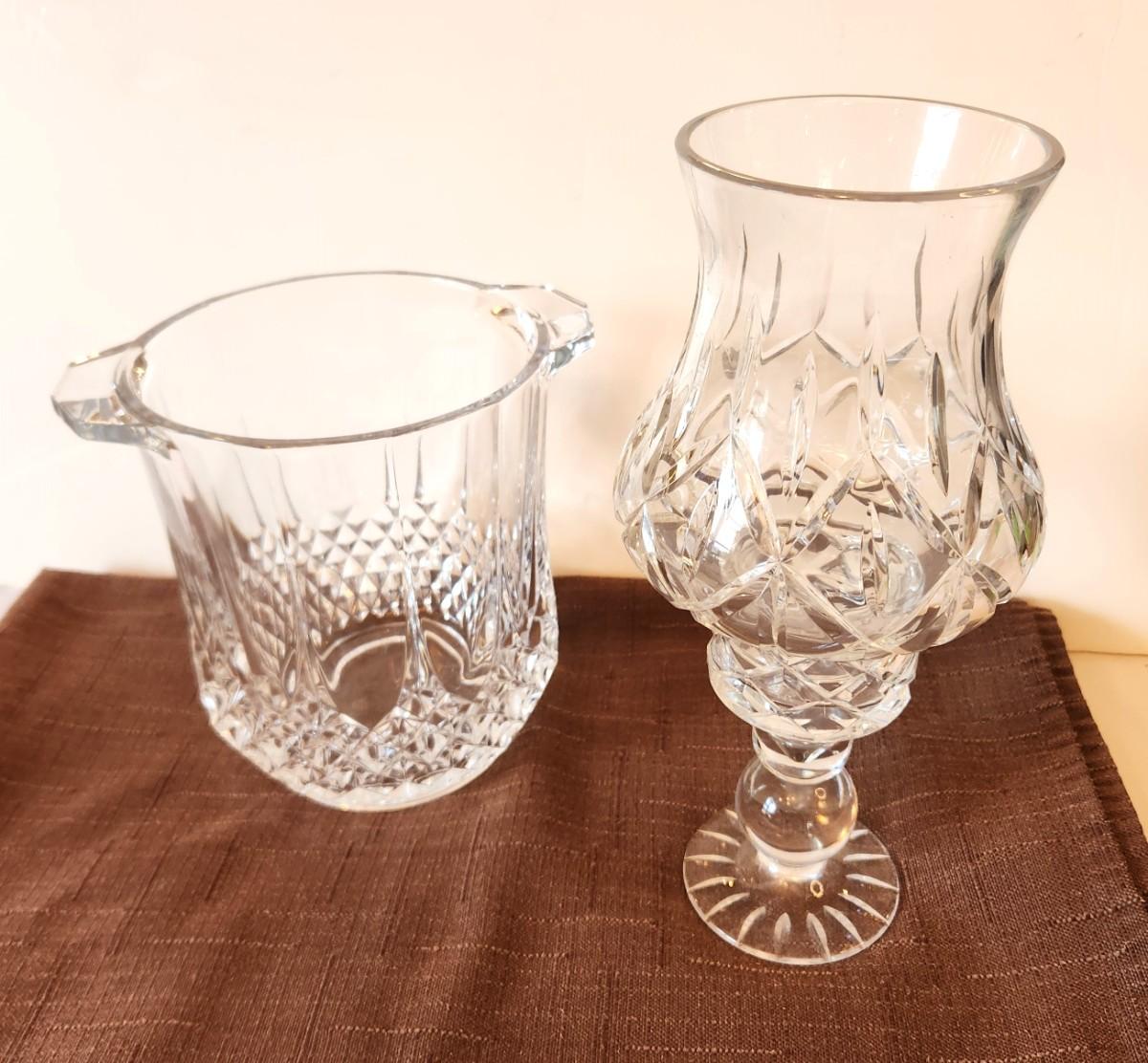 Lot of 2 pieces of nice crystal - ice bucket with handles, 8" tall, crystal candle lamp with removeable shade, 12" tall. Both in nice condition.