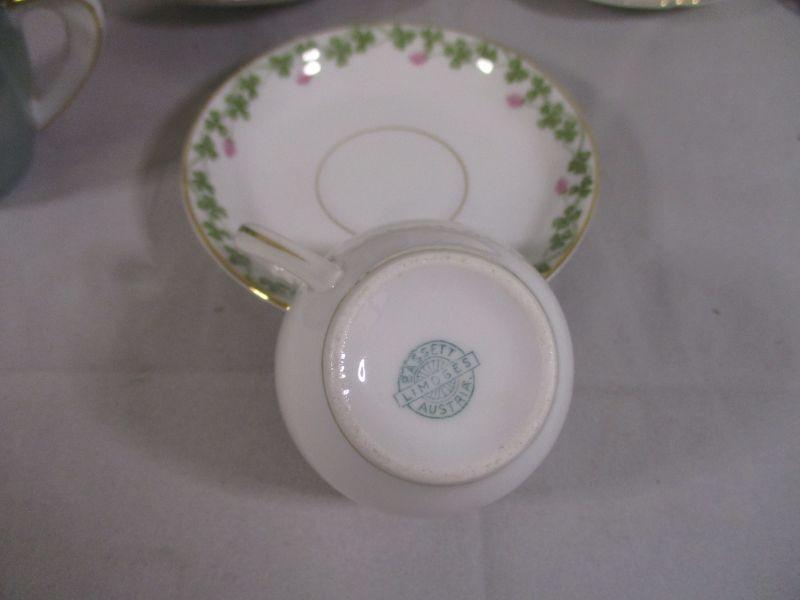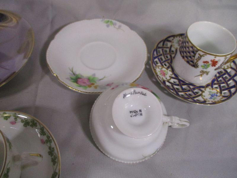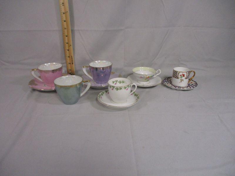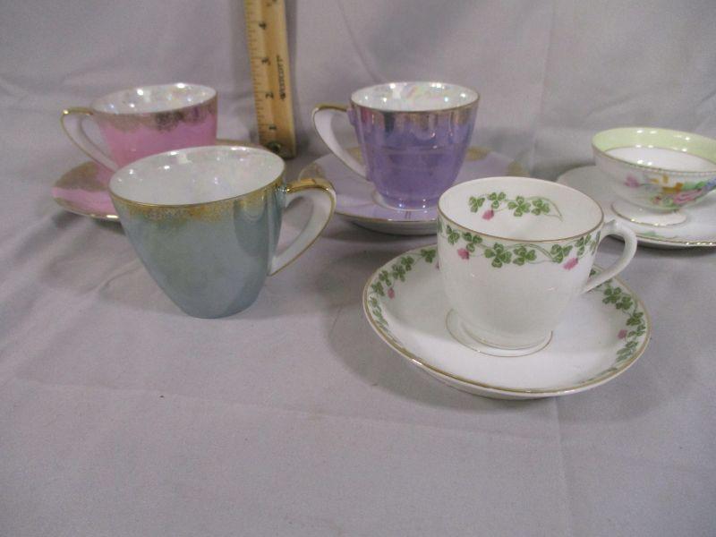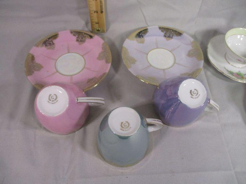 There are (5) sets and one extra cup. The one cup that is hand painted Japan, does have a small chip on the base but it is very small and not seen when the cup is on the saucer. The purple saucer is a little lighter than the matching purple cup. No other issues are found.
