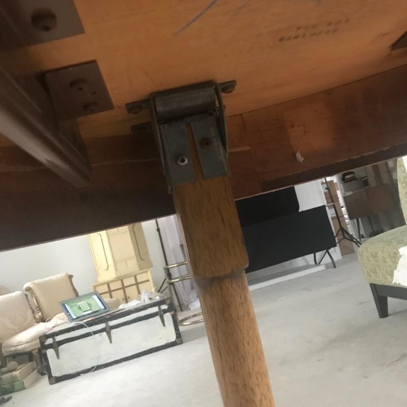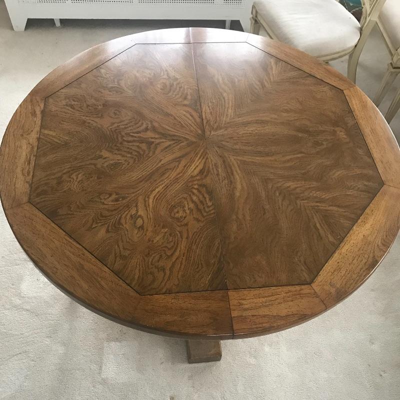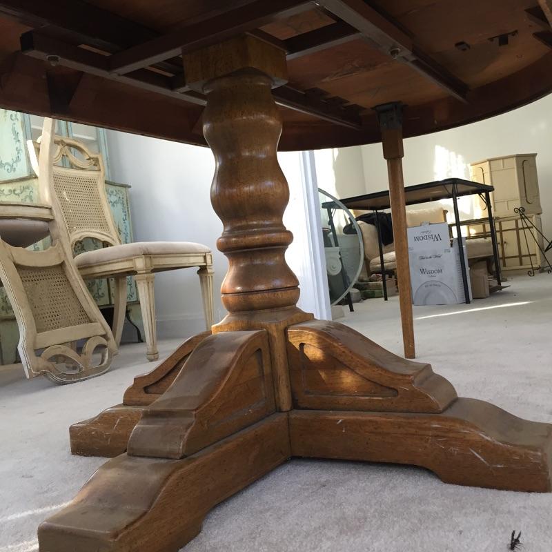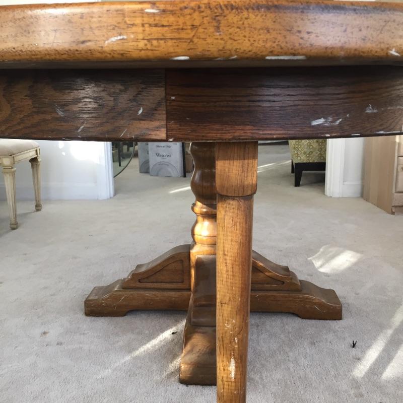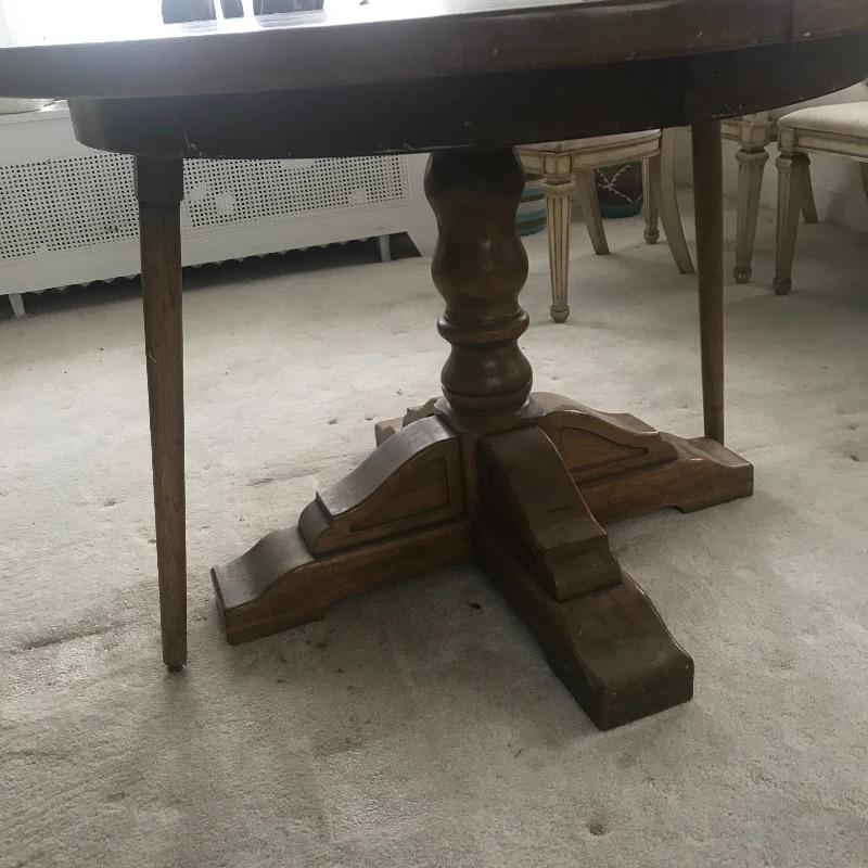 Large wooden dining table with two leaves. Can be a round table without the leaves or oval with one or two leaves. Pedestal bottom with two adjustable supports for the ends. Get ready to have the family and friends over with this handsome table. Table measures 44” x 84” x 28.5” with both 20” leaves in. Some wear on sides but top looks nice.