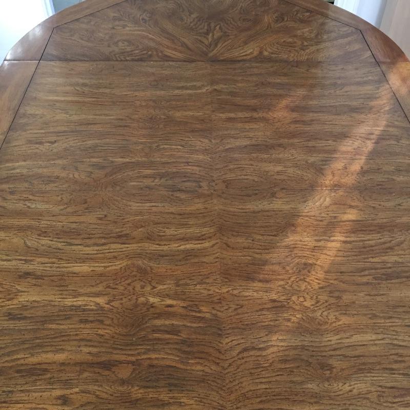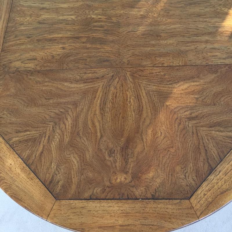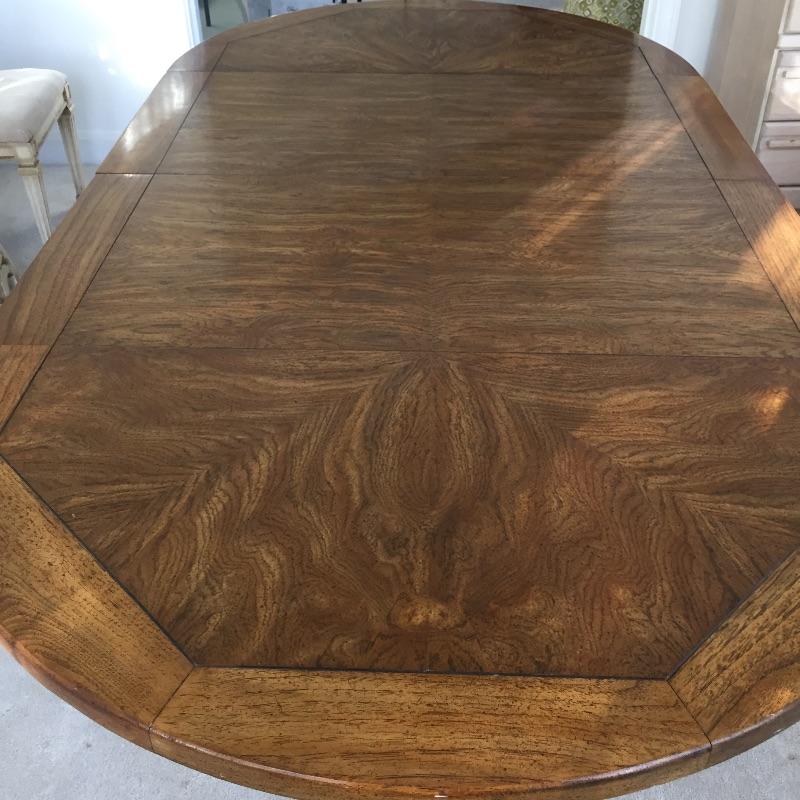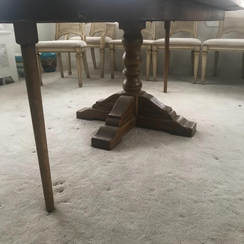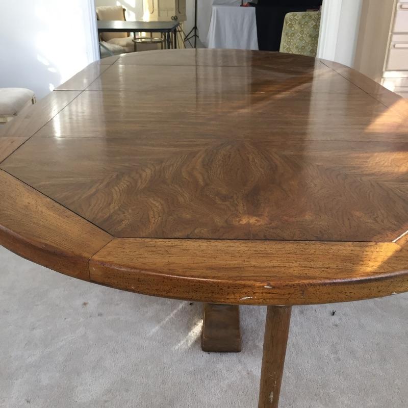 Large wooden dining table with two leaves. Can be a round table without the leaves or oval with one or two leaves. Pedestal bottom with two adjustable supports for the ends. Get ready to have the family and friends over with this handsome table. Table measures 44” x 84” x 28.5” with both 20” leaves in. Some wear on sides but top looks nice.