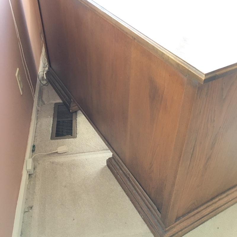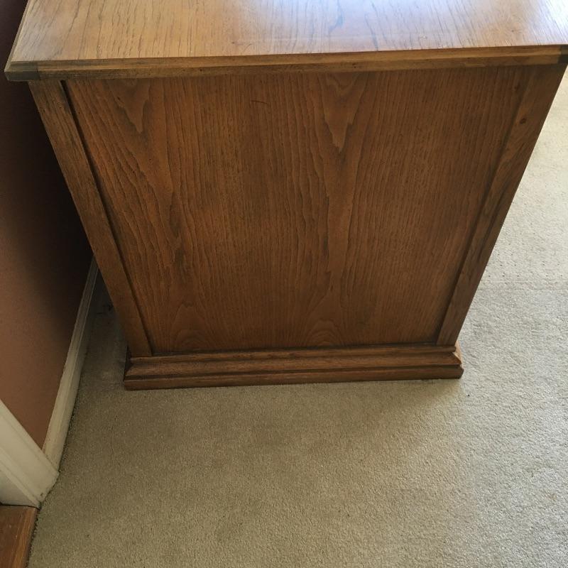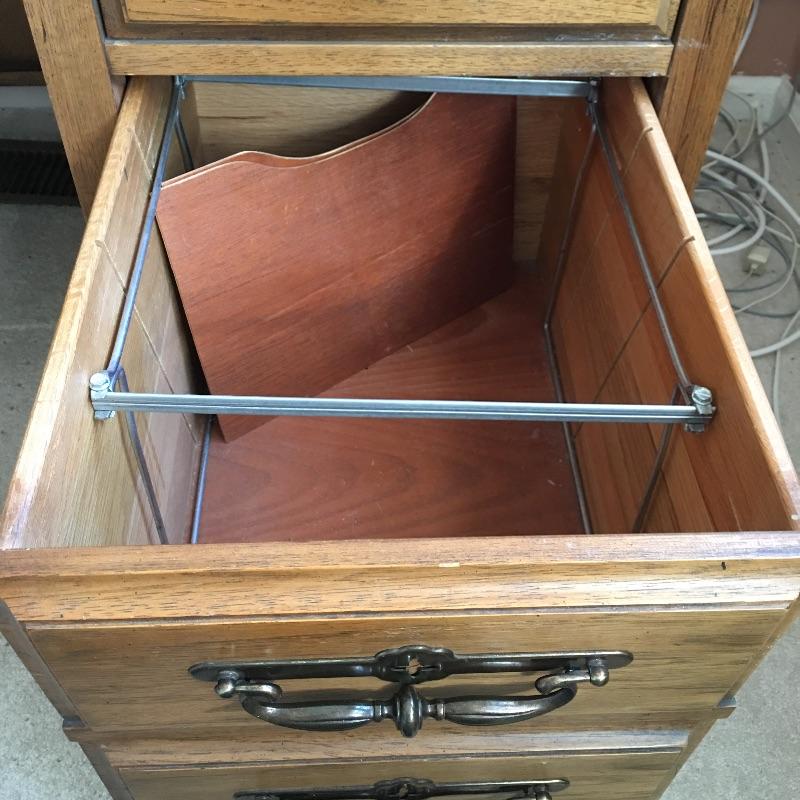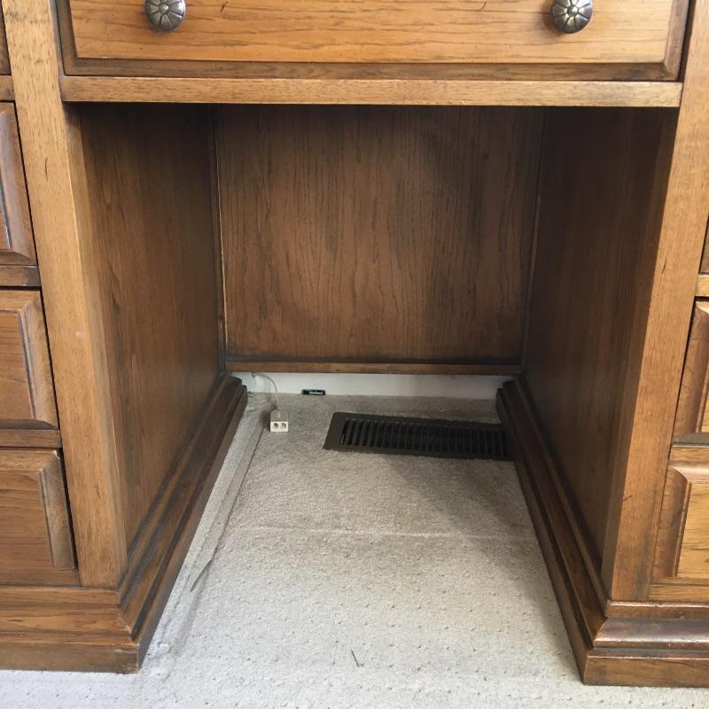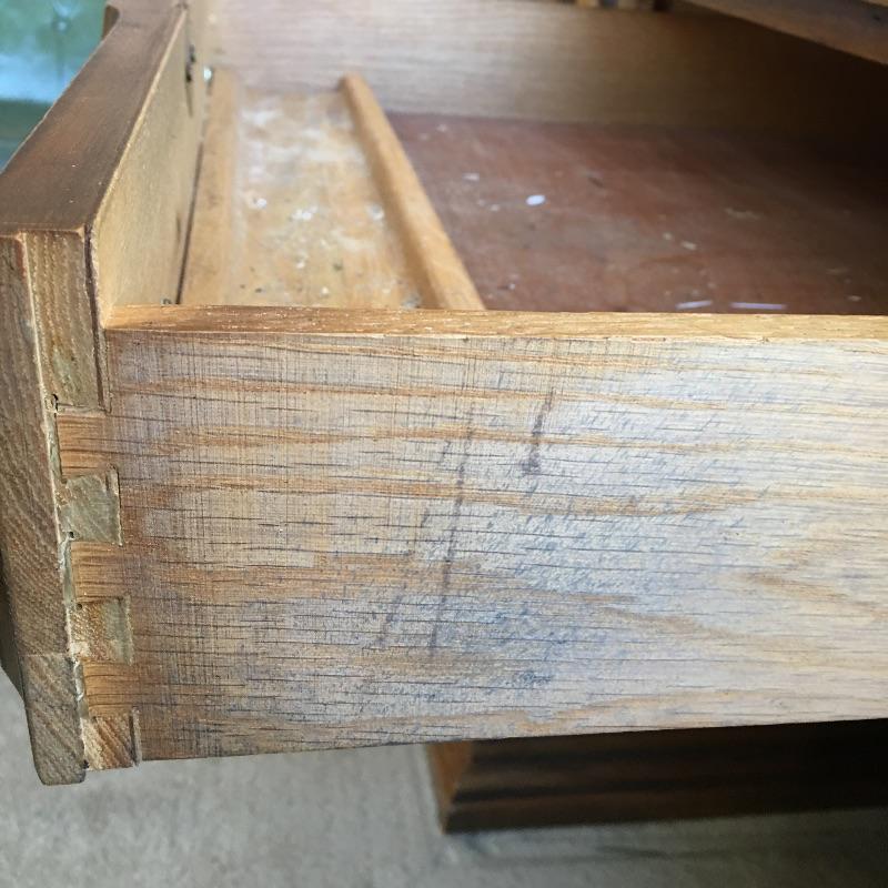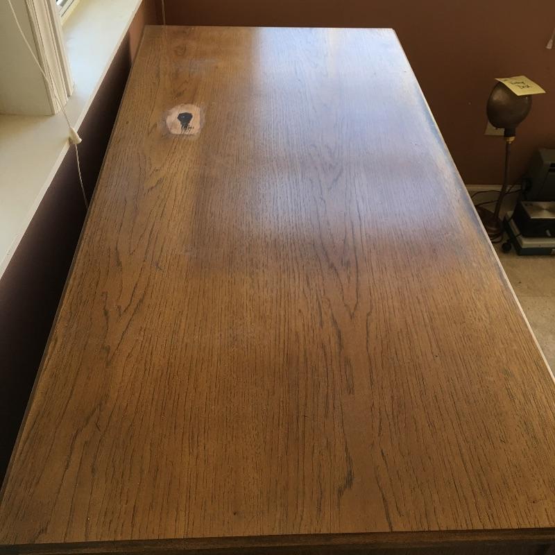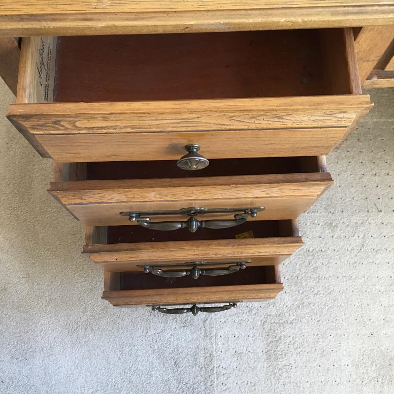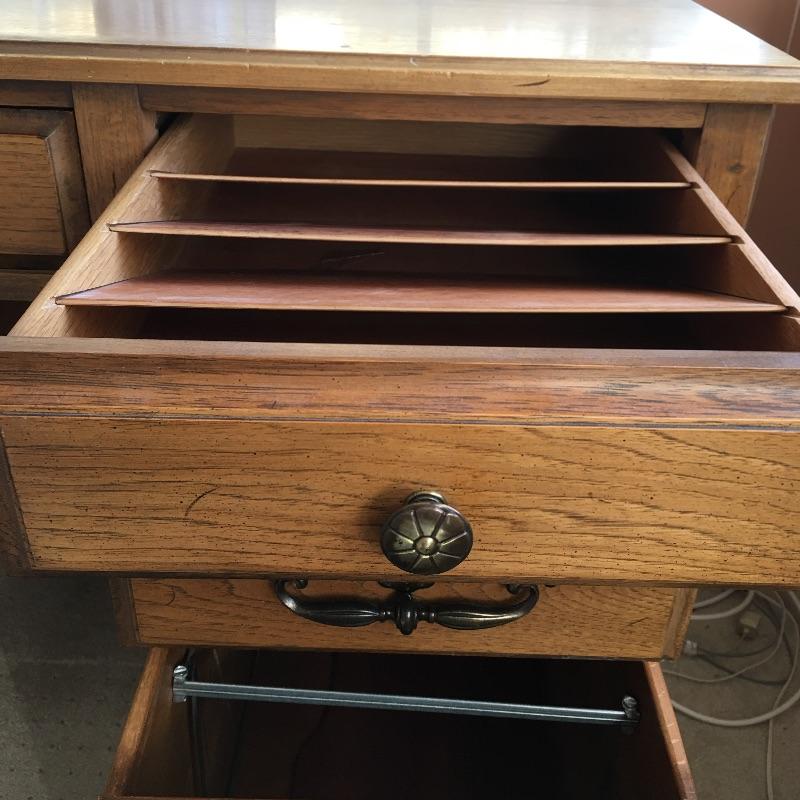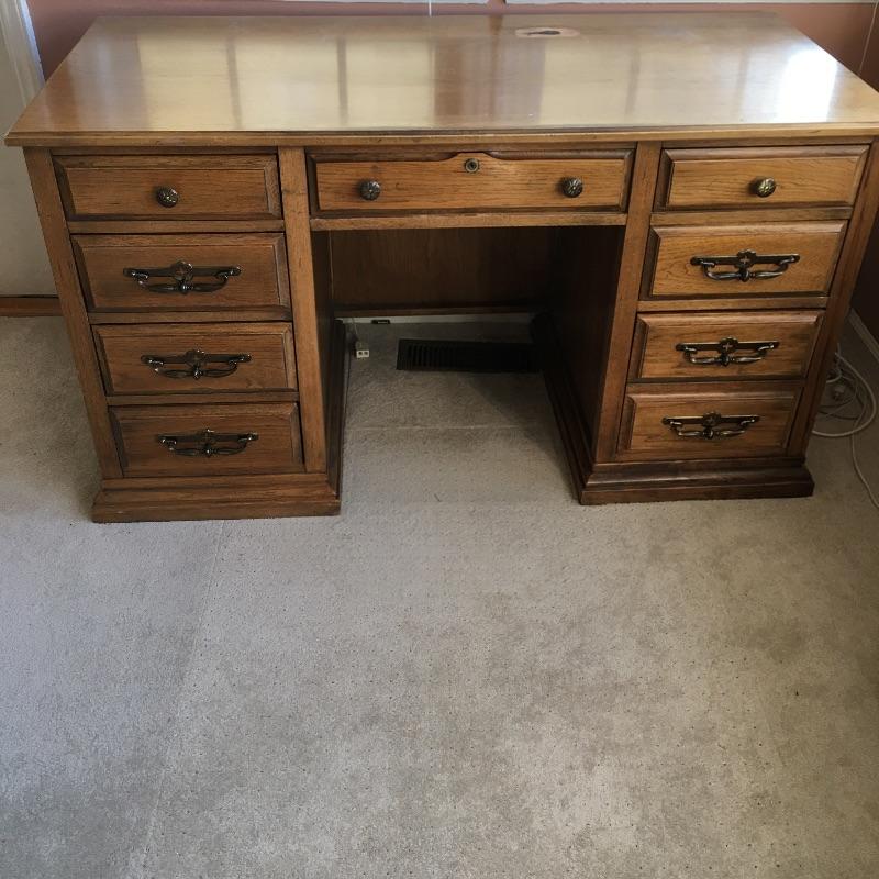 Eight dovetailed drawer desk by Sanford. Has file drawer and paper drawer. Key is missing and there is a large spot on top that is missing finish, see pictures. This can be a lovely desk with a little elbow grease or leave it as is and cover with a desk calendar.