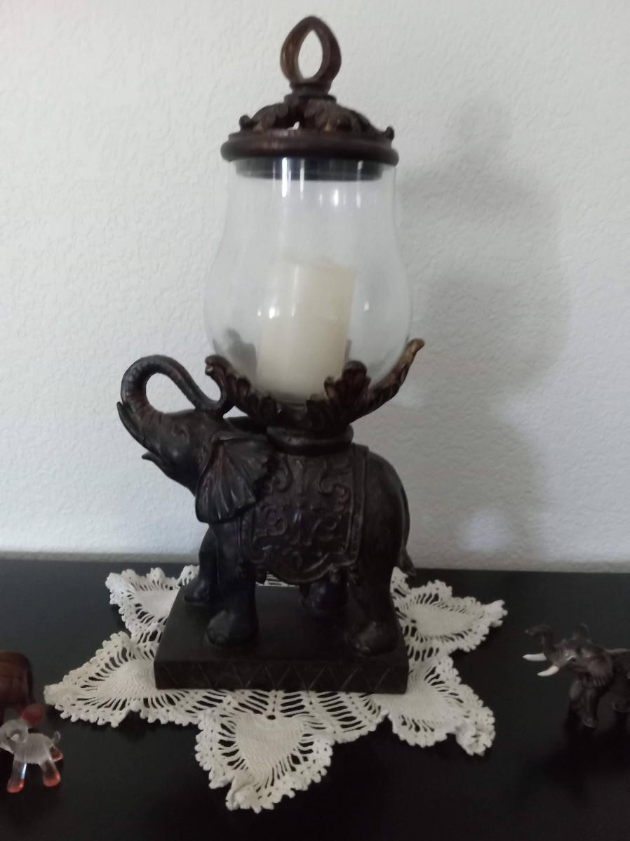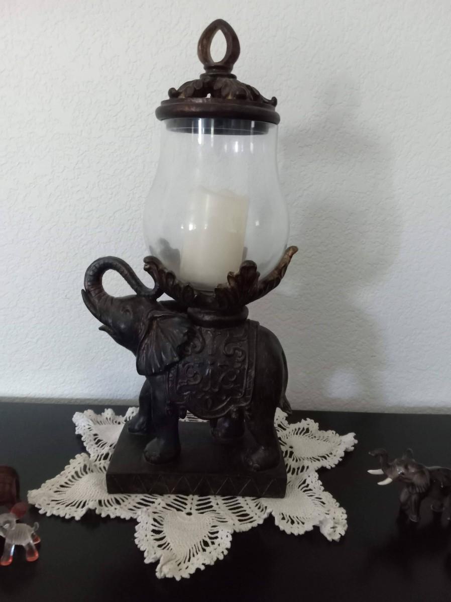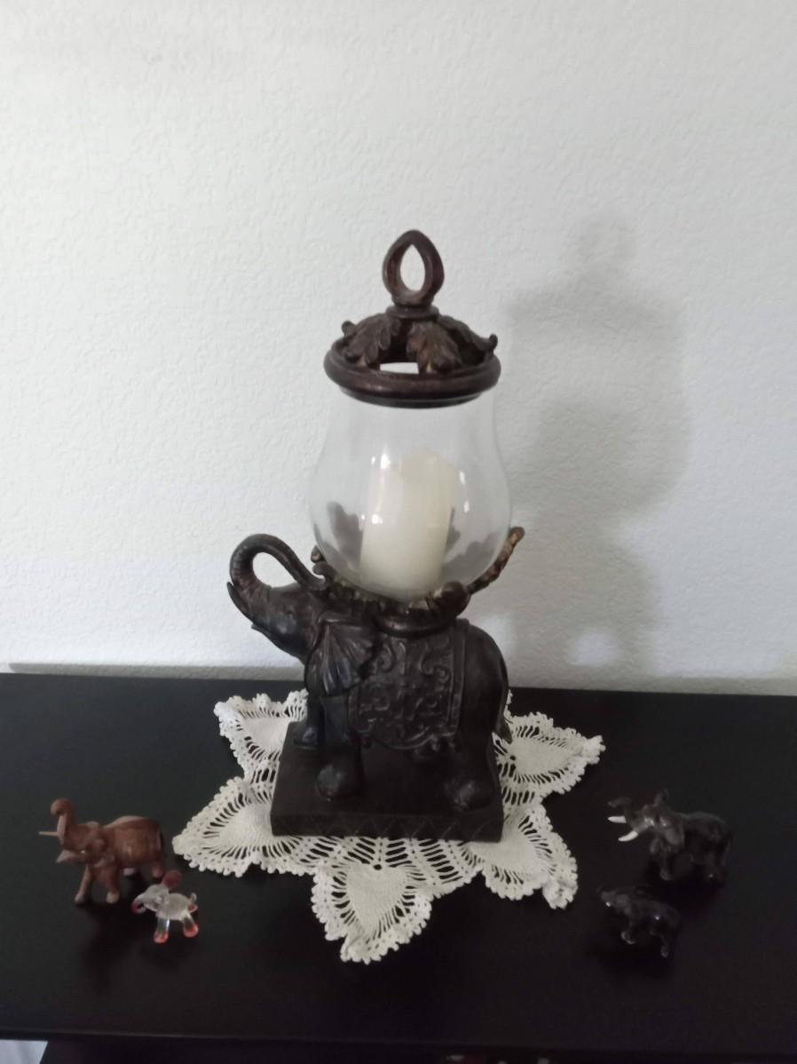 BEAUTIFUL ELEPHANT CANDLE HOLDER WITH GLASS GLOBE 15" TALL, FOUR MINIATURE ELEPHANTS ONE WOODEN, ANOTHER PLASTIC AND TWO CERAMIC
