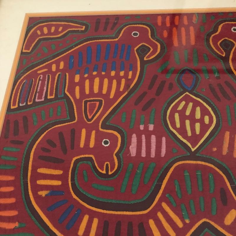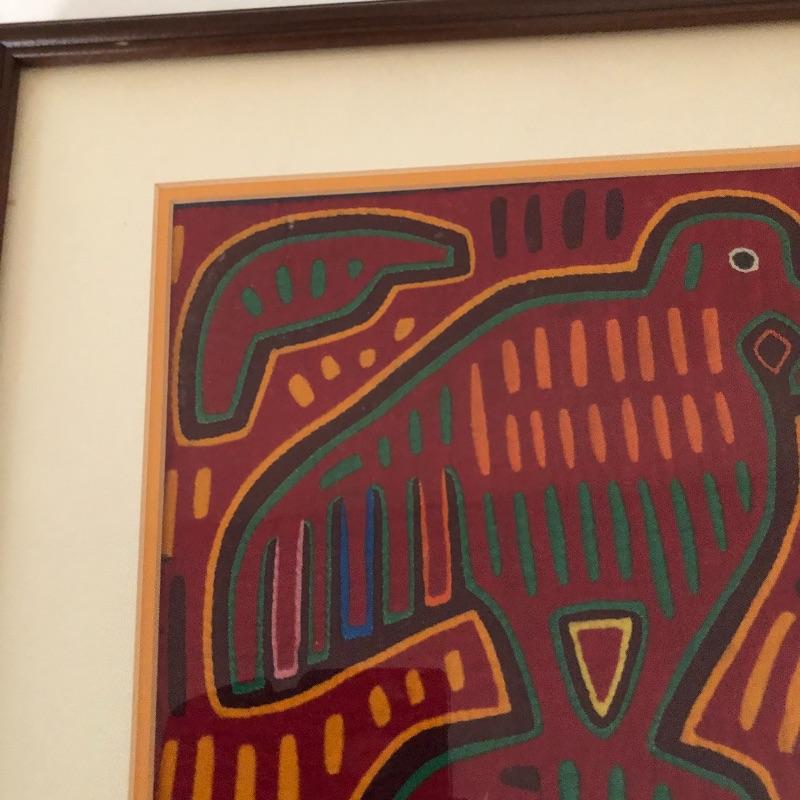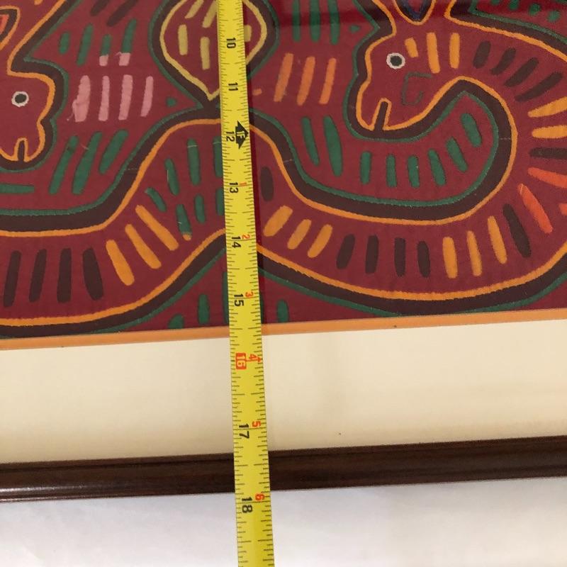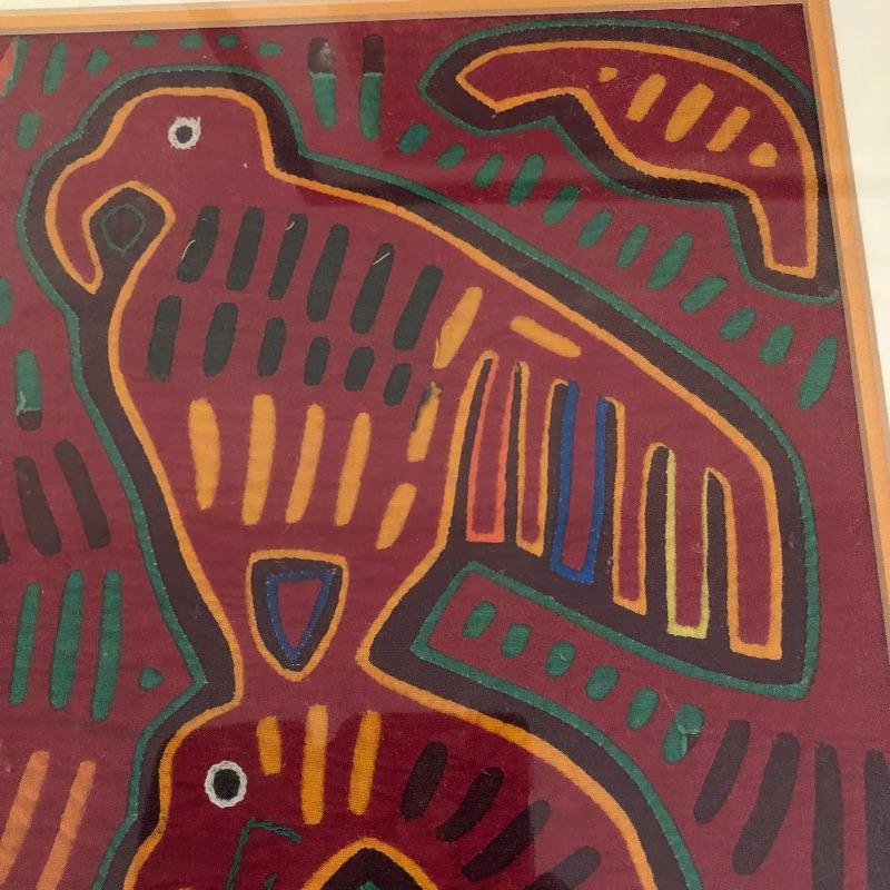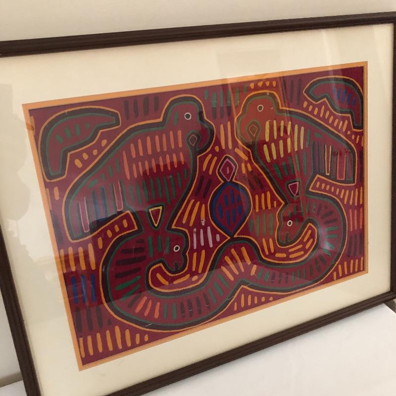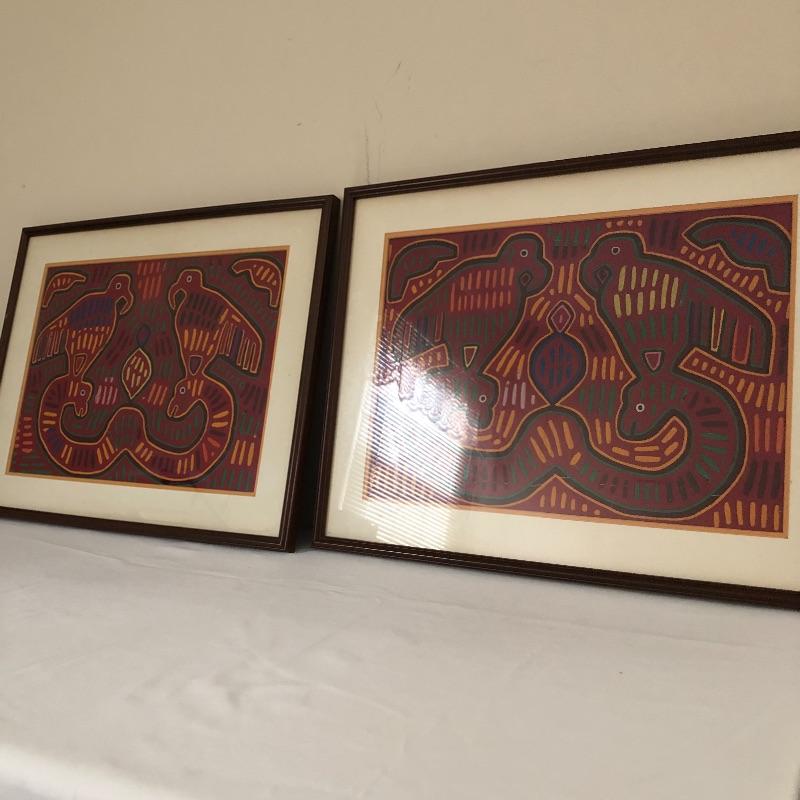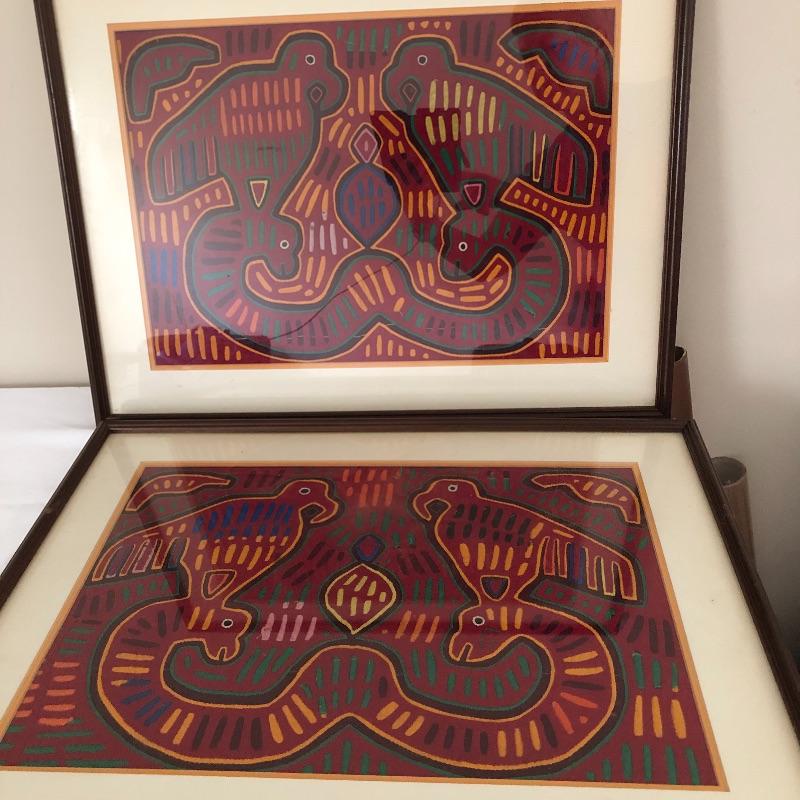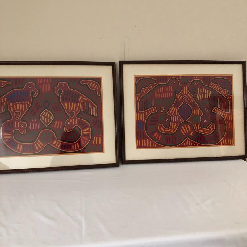 This colorful Mola artwork is two wooden framed bright fabric pieces. Reds and Yellows highlight the birds and snake in the fabric. Both measure the same: 23” x 18”. Shipping available.