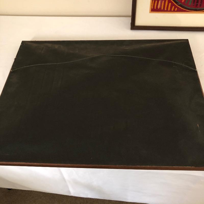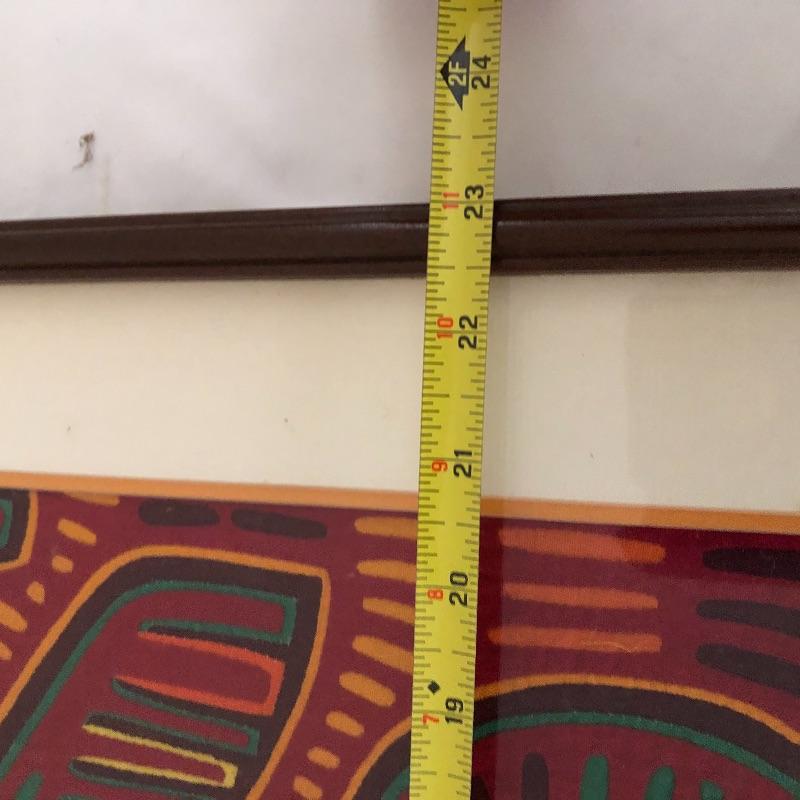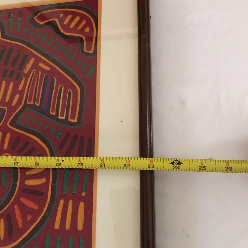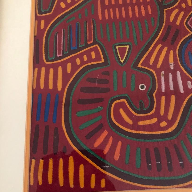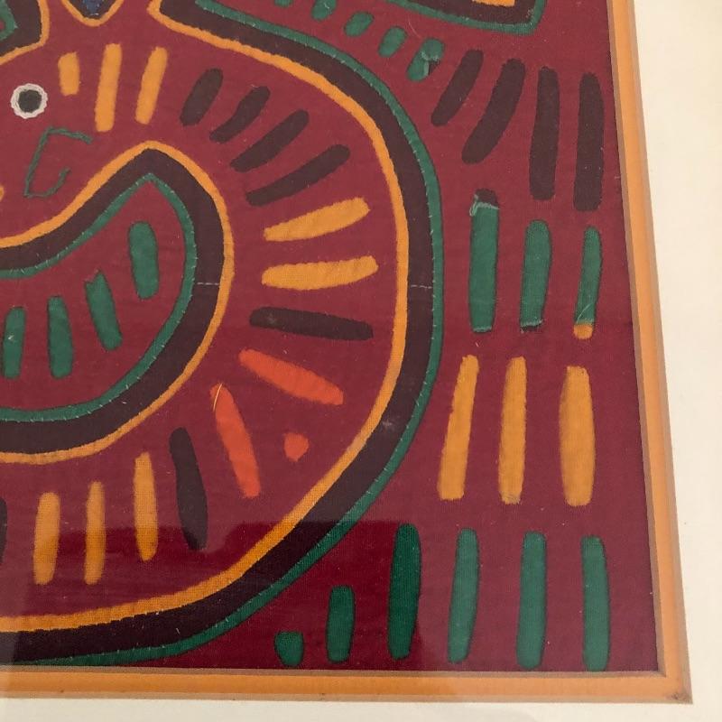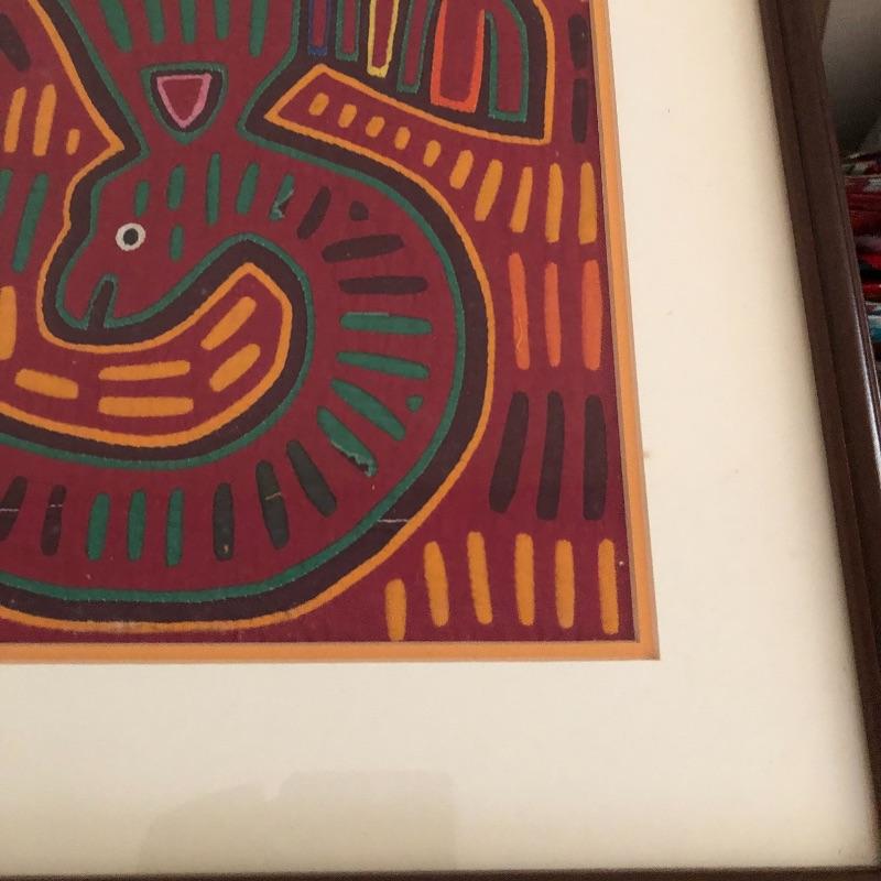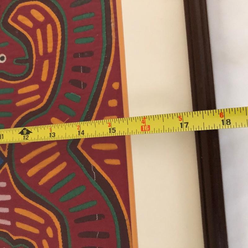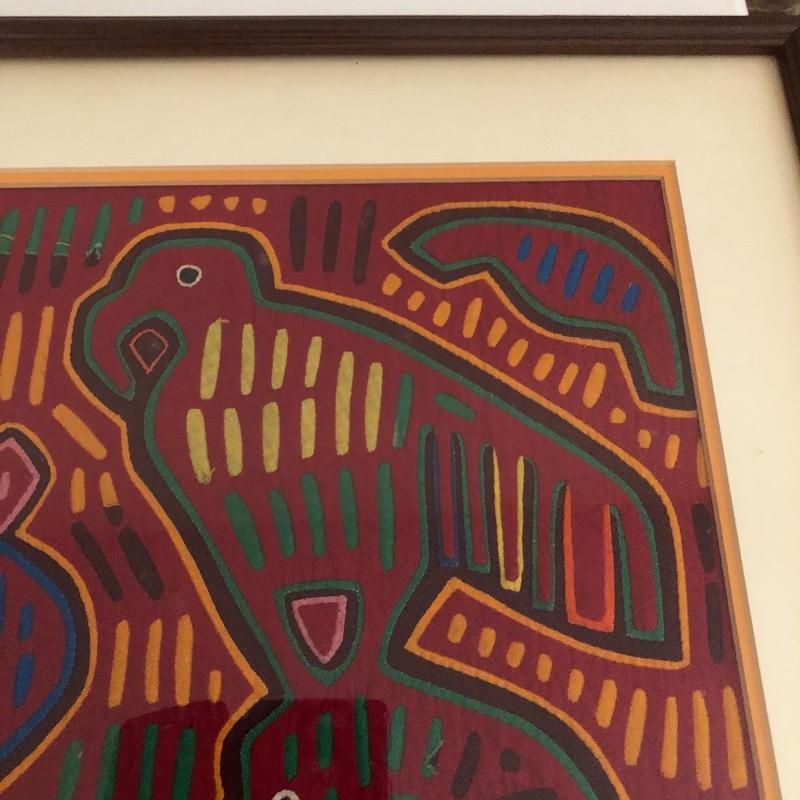 This colorful Mola artwork is two wooden framed bright fabric pieces. Reds and Yellows highlight the birds and snake in the fabric. Both measure the same: 23” x 18”. Shipping available.