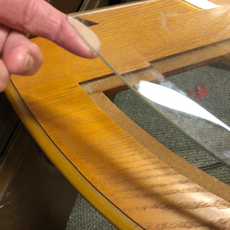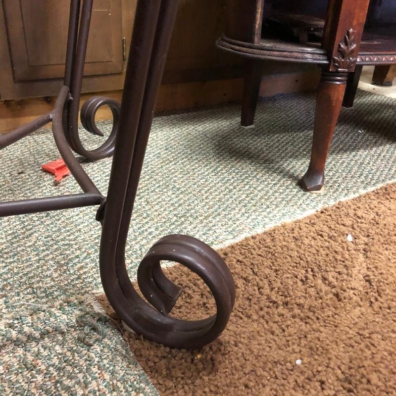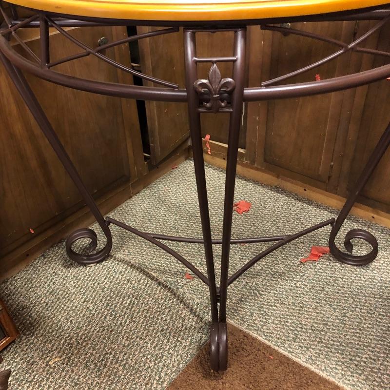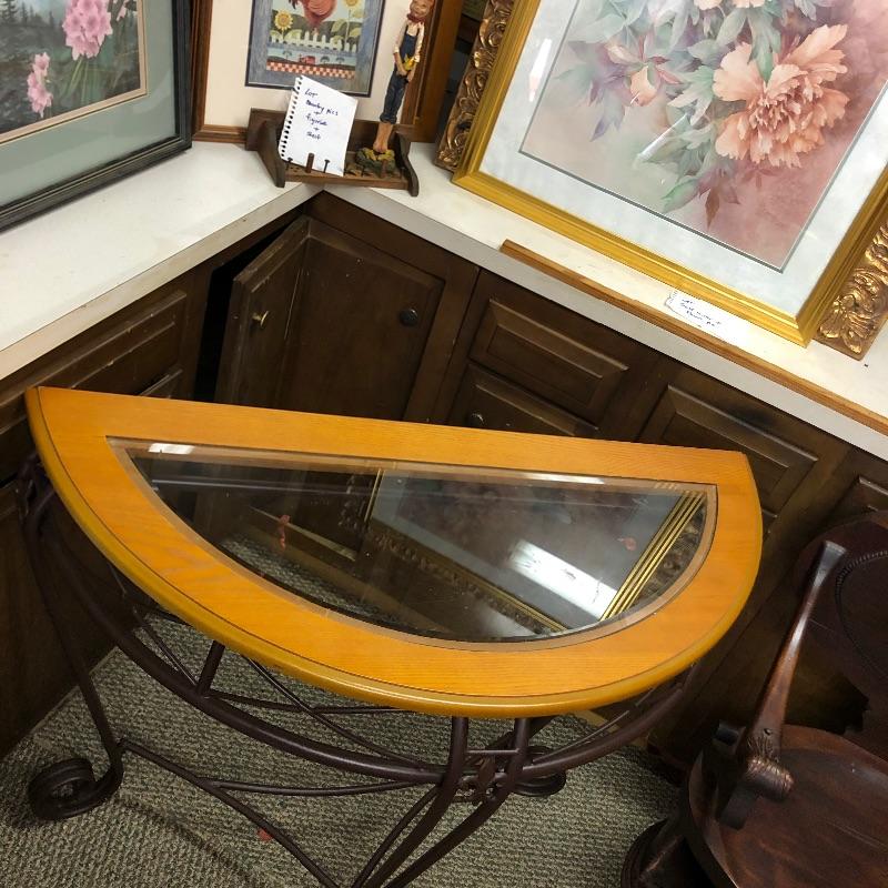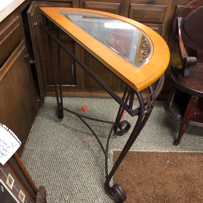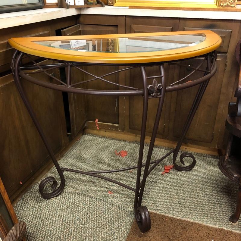 The perfect size for your hallway, this glass topped table has a light toned wood surround with ornate brown metal legs. The glass top is removable for easy cleaning and please note that there are some scratches in the glass, see images.