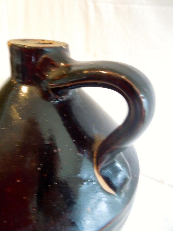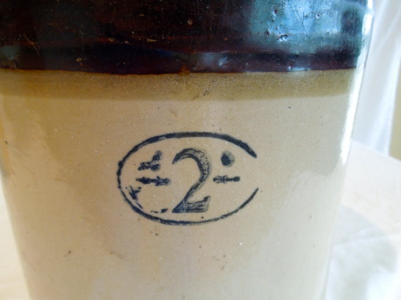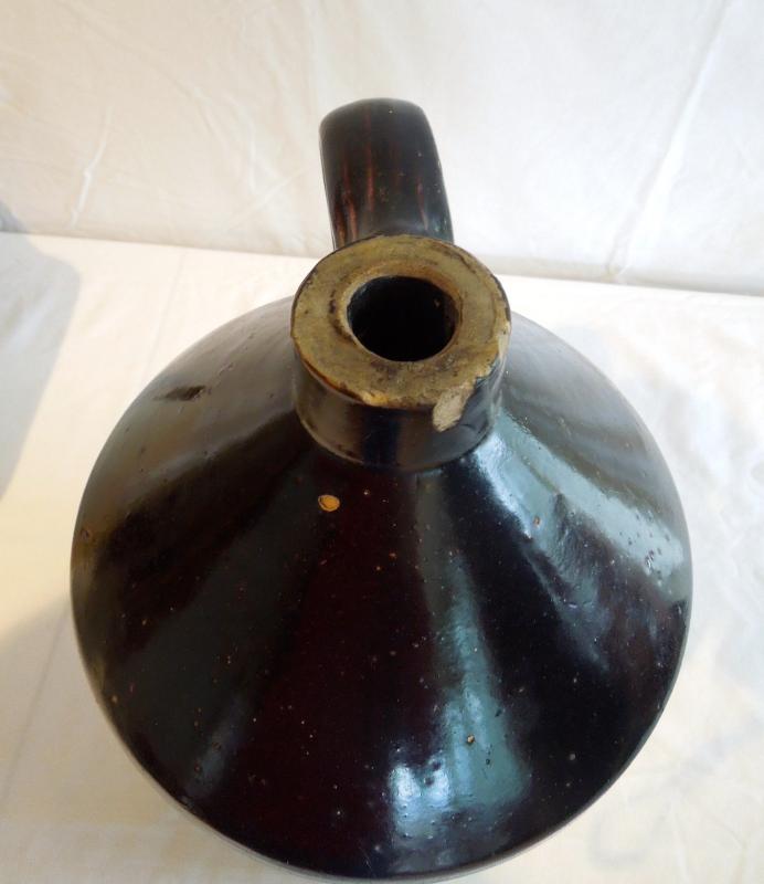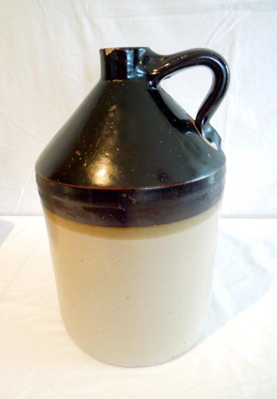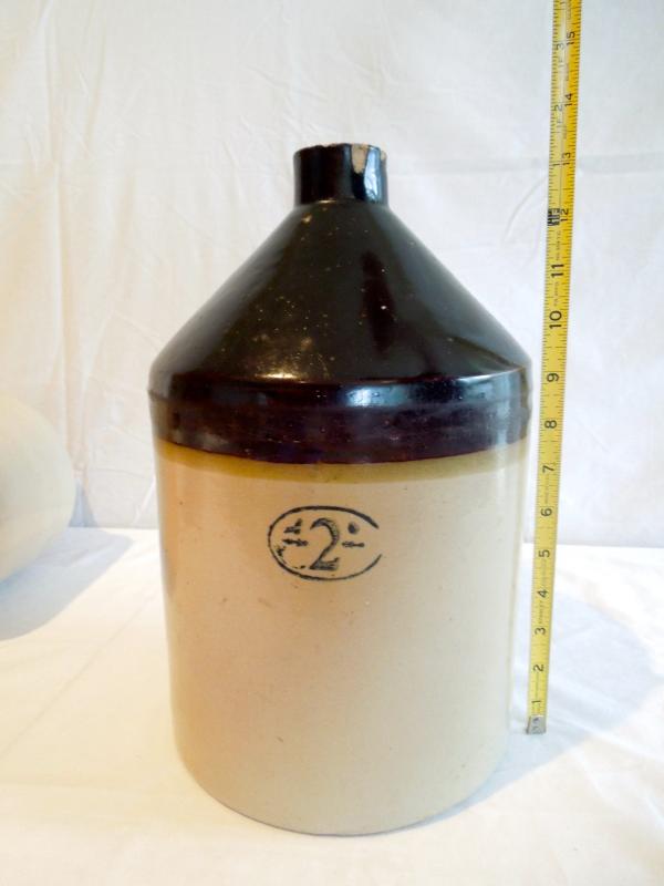 Nice brown and tan earthenware 2 gallon jug. Probably used for whiskey, molasses or cider. Pulled handle and stenciled 2 gal mark. bottom is wire cut and shows stains from the years. some erosion around the edge of the underside of bottom. 14" h x 9" diameter base. Similar to type used during prohibition.