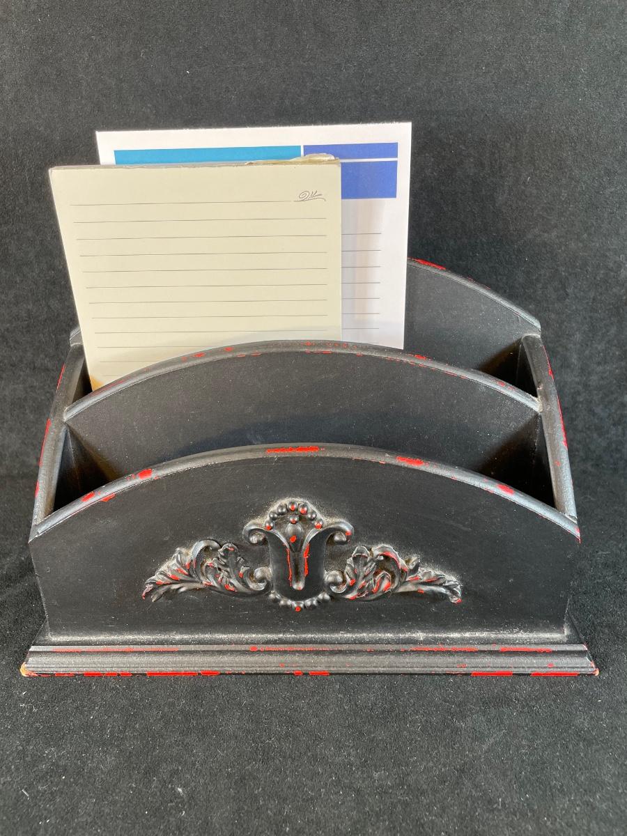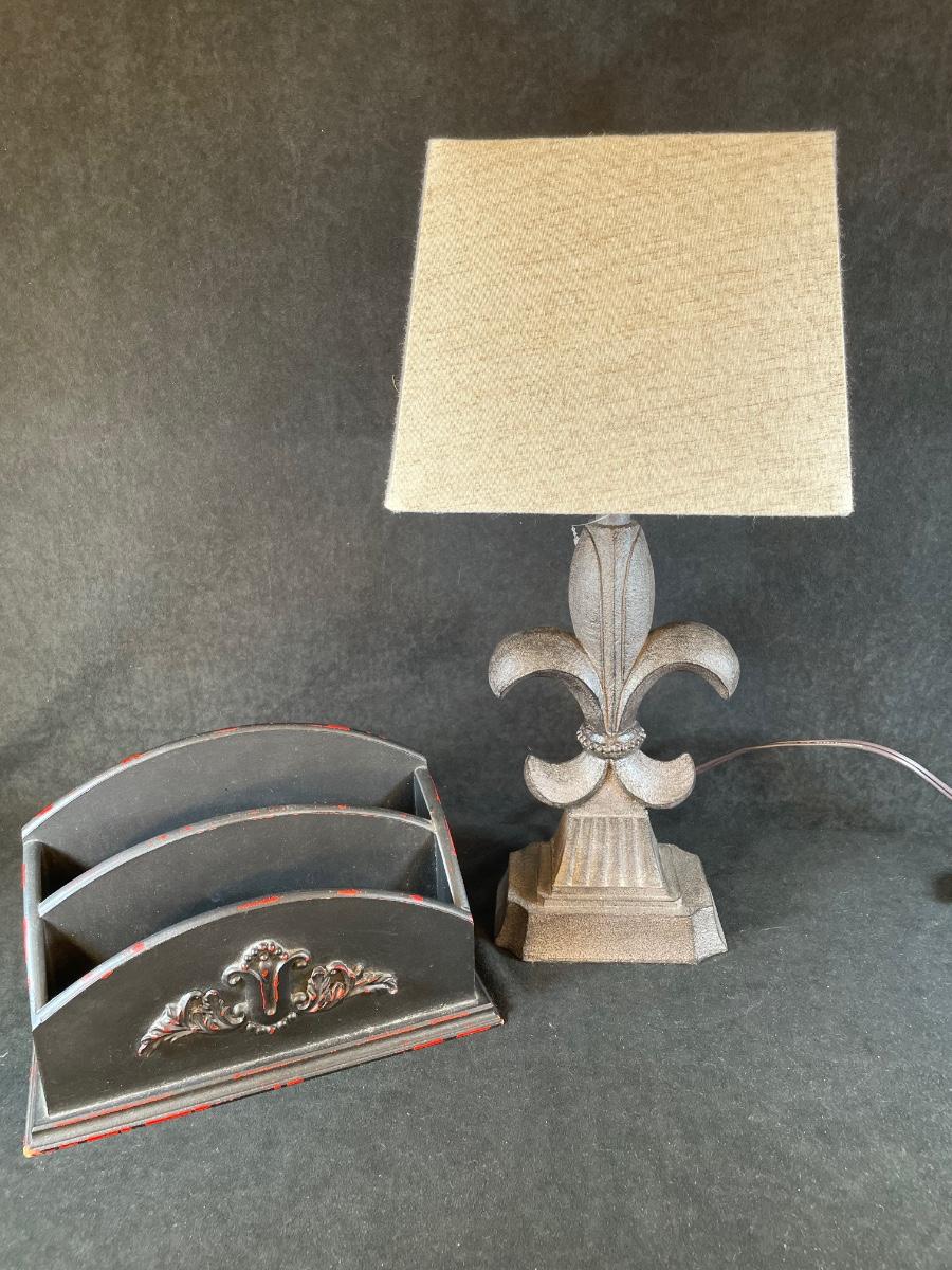 Includes 2 bin letter/bill organizer and desk lamp.