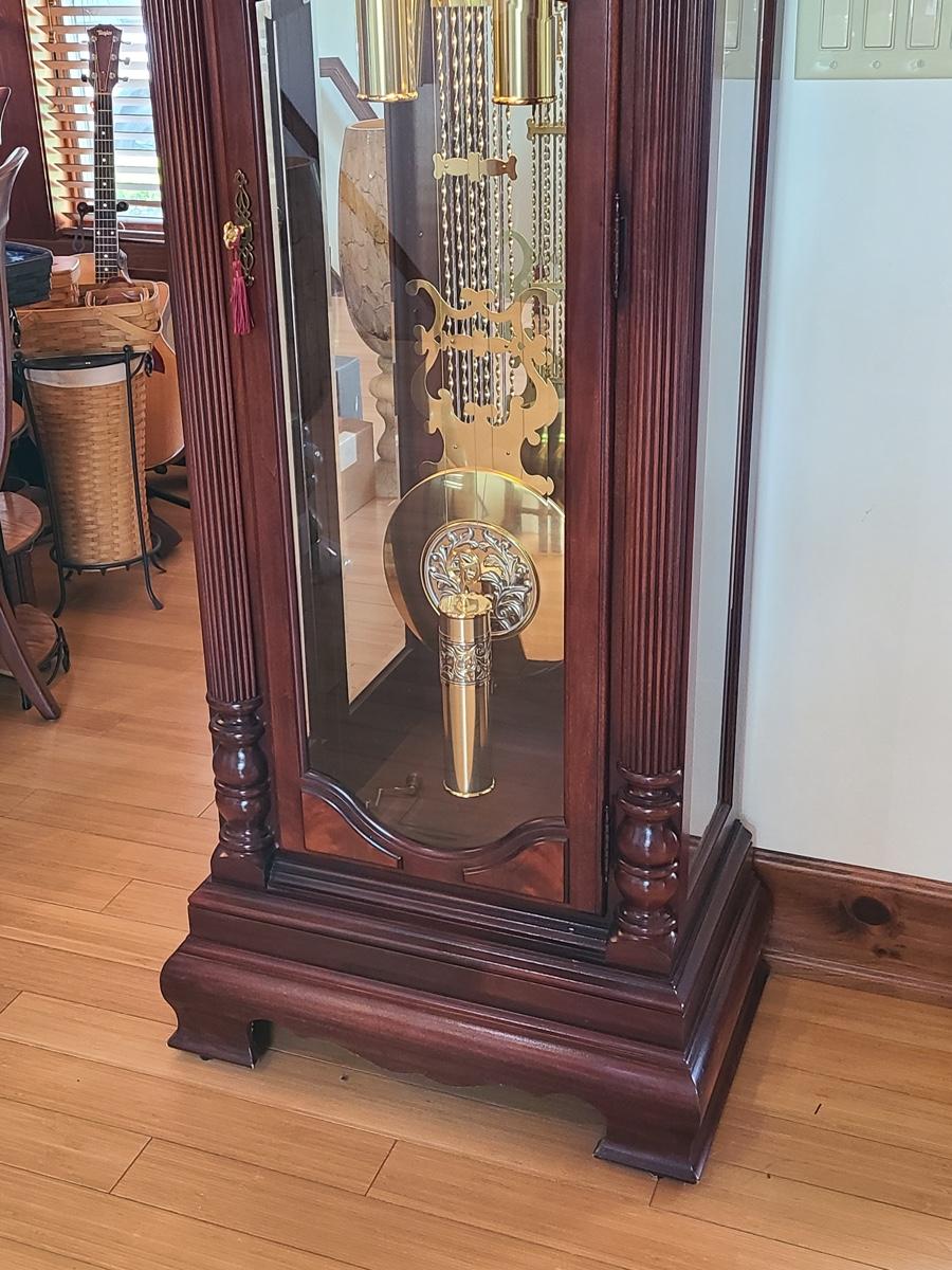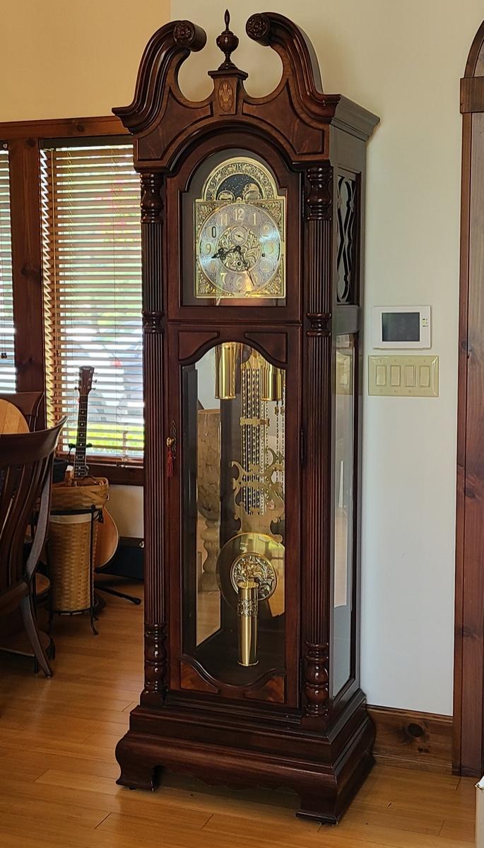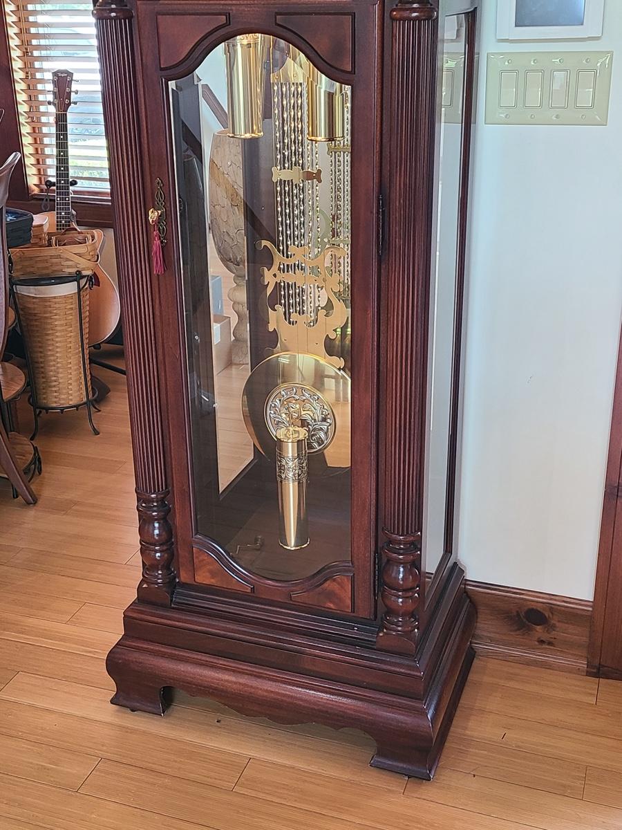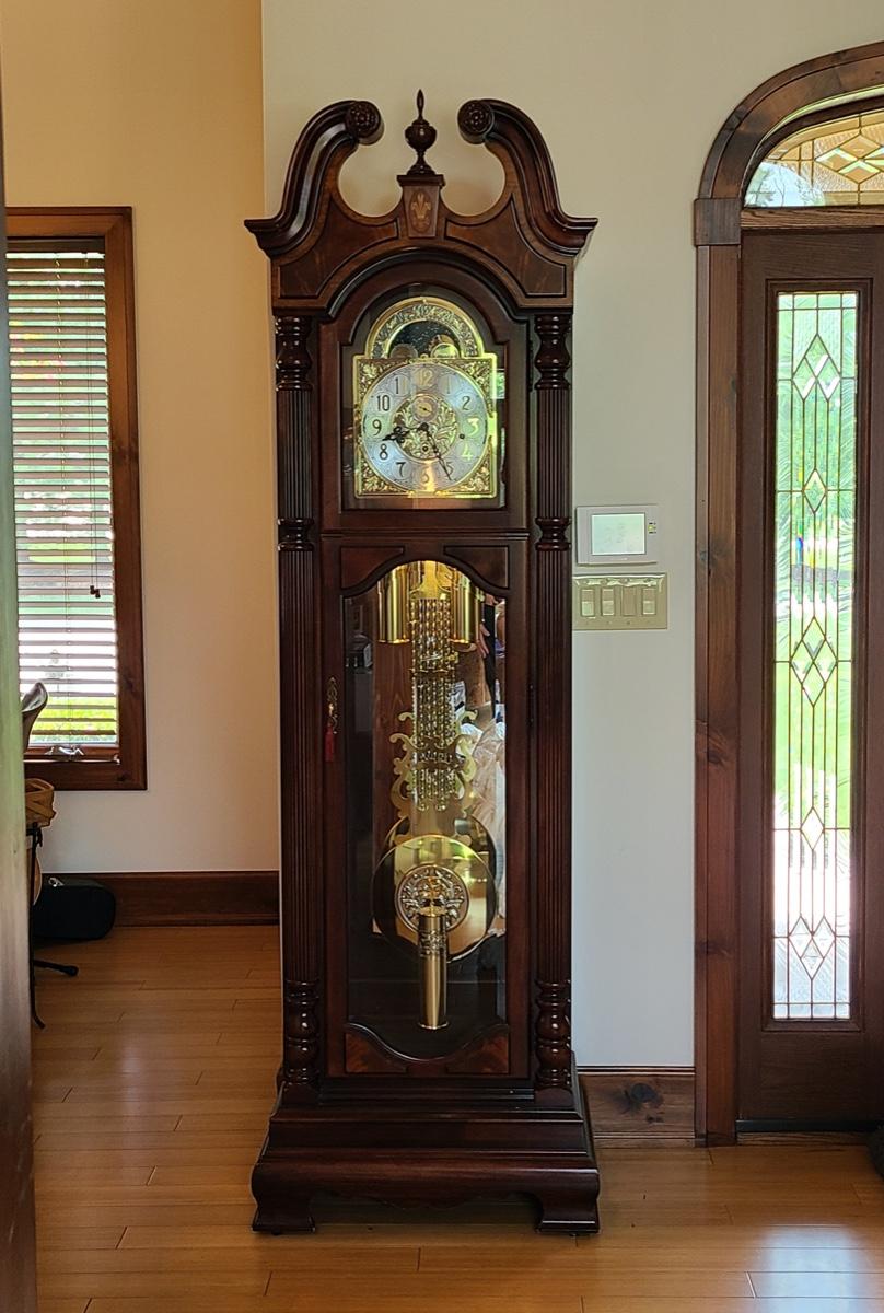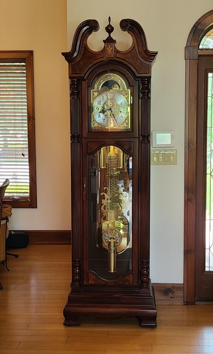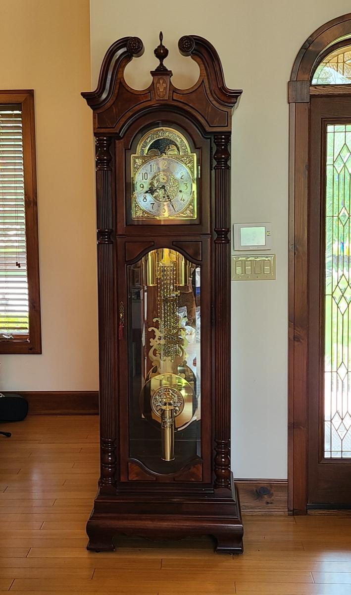 28x17x96 inches tall. Gorgeous! Howard Miller Grandfather clock. Interior has a gifted name plate, other than that still looks new. Gorgeous piece! Located on first floor by front door, but you will need to move down three stairs on porch. Please see all pictures as they are the best representation of the items. The pictures show condition, measurements if taken, and what is included in the lot. Due to the large amount that we photograph and the time frame, we are not always able to take measurements. All items unless noted, are pre-owned and have been used. If you purchased furniture, you must bring help. We do not allow one person to carry large furniture out on their own. Bring help, tools and a truck for the safety of our clients homes, and your personal safety. Company policy. Thank you.