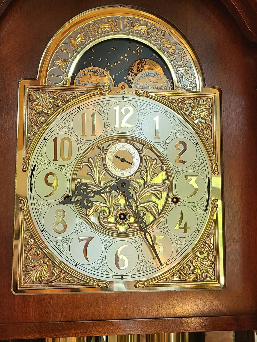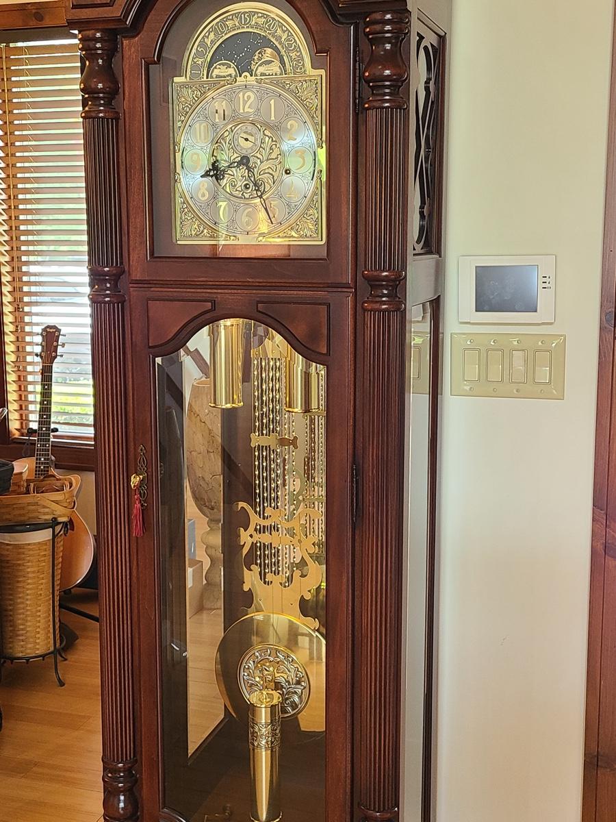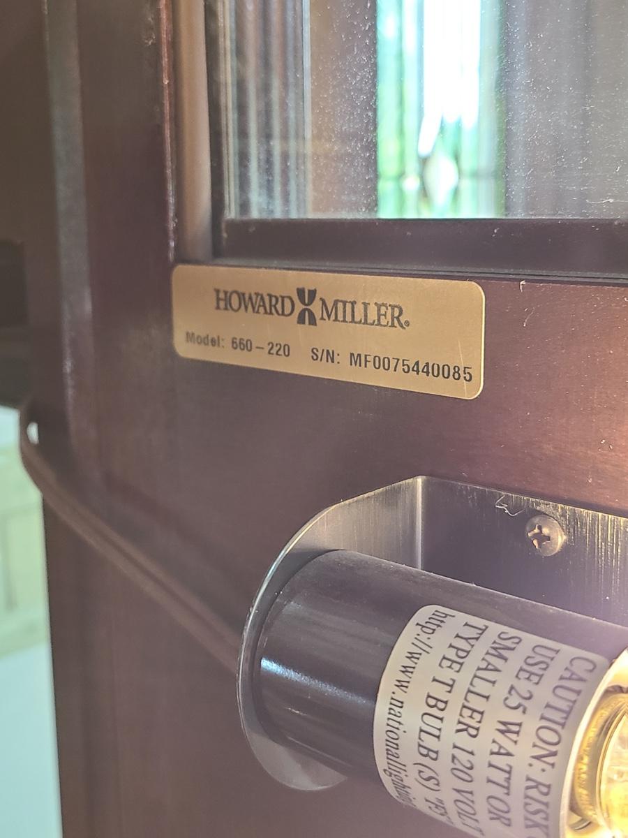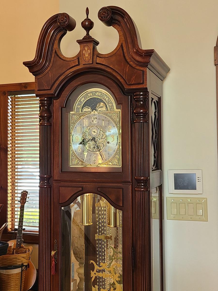 28x17x96 inches tall. Gorgeous! Howard Miller Grandfather clock. Interior has a gifted name plate, other than that still looks new. Gorgeous piece! Located on first floor by front door, but you will need to move down three stairs on porch. Please see all pictures as they are the best representation of the items. The pictures show condition, measurements if taken, and what is included in the lot. Due to the large amount that we photograph and the time frame, we are not always able to take measurements. All items unless noted, are pre-owned and have been used. If you purchased furniture, you must bring help. We do not allow one person to carry large furniture out on their own. Bring help, tools and a truck for the safety of our clients homes, and your personal safety. Company policy. Thank you.