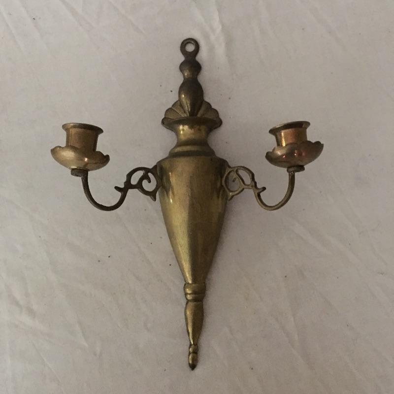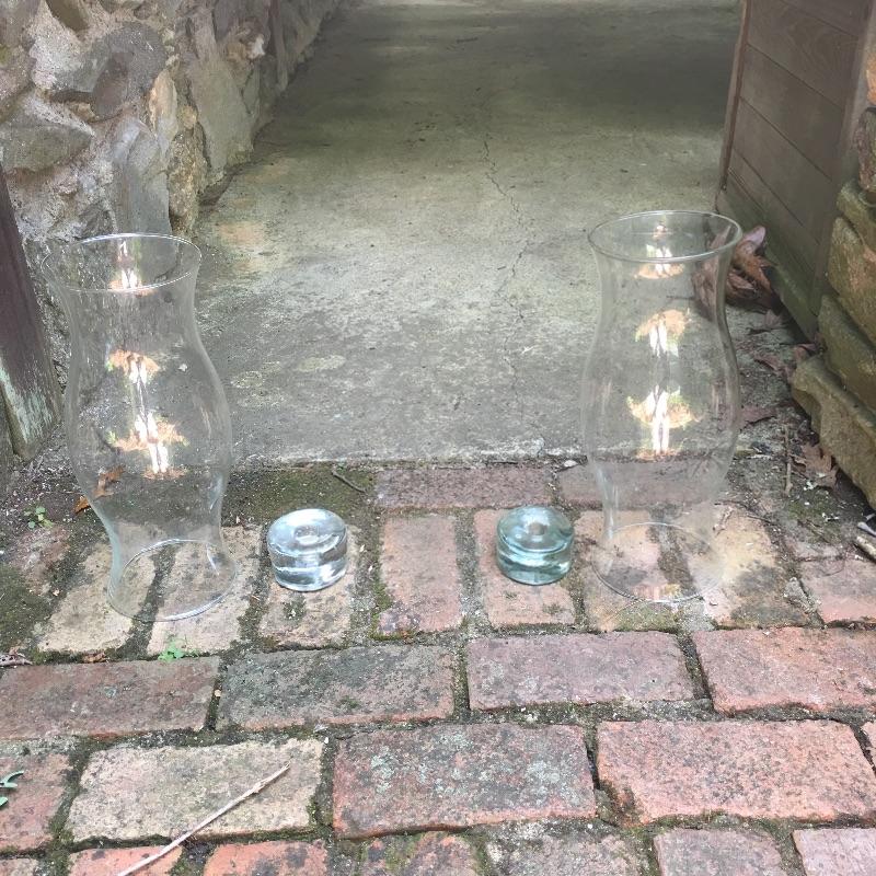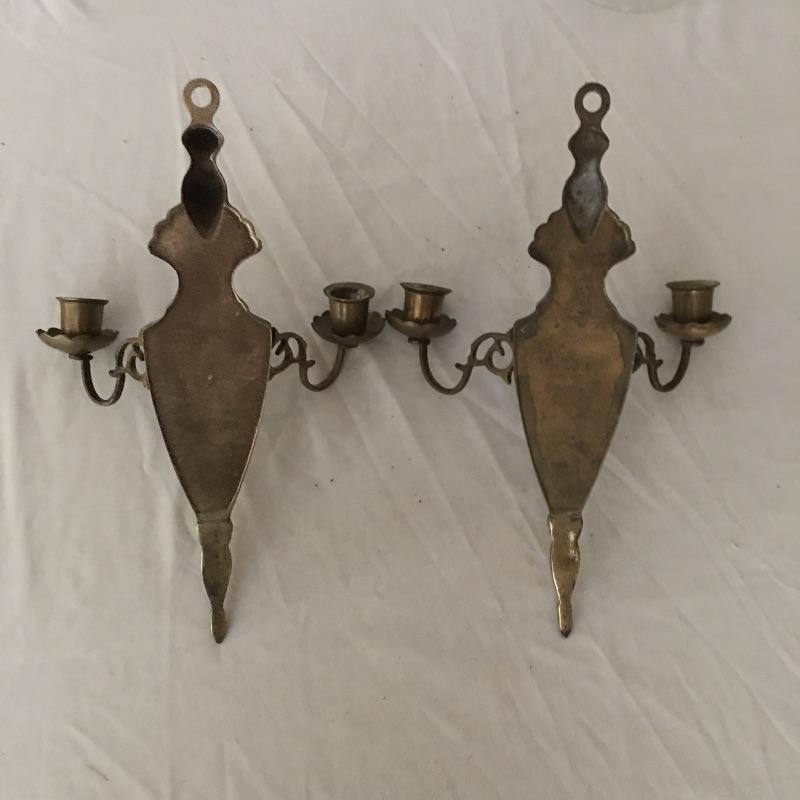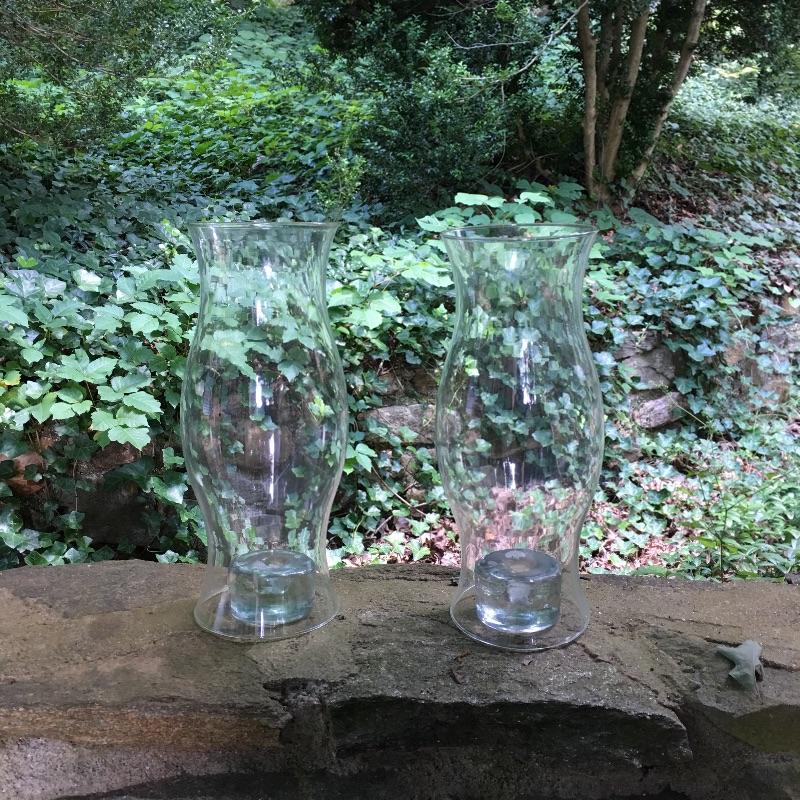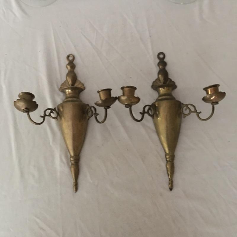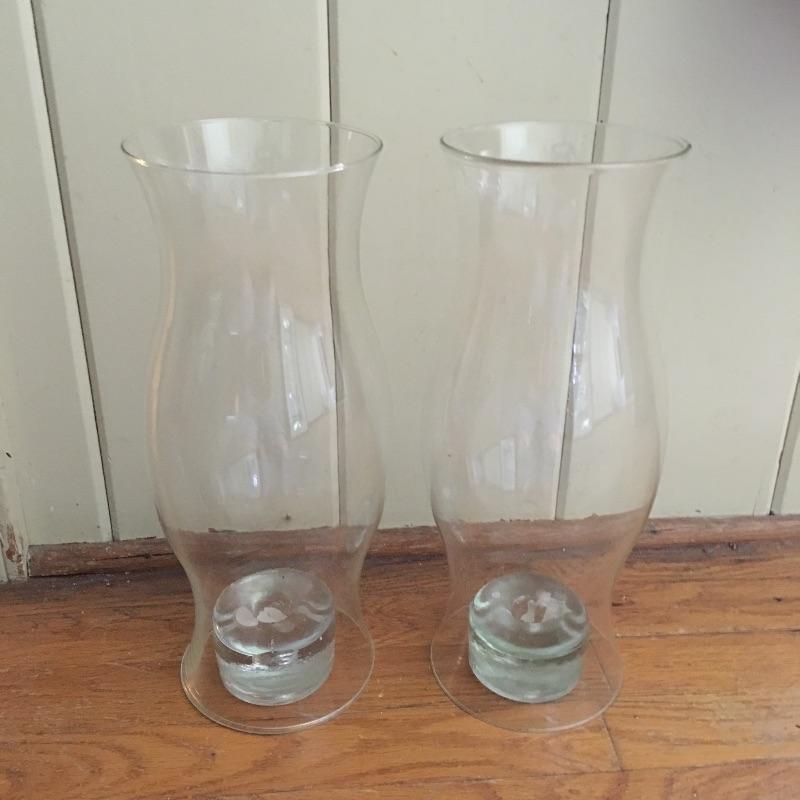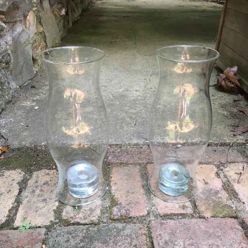 Elegant pair of hurricane lamps with glass candle holders inside and two brass sconces with room for two candles each. Pictures don’t do these lamps justice, don’t miss out on these beauties. Lamps measure 5.25”D x 14” tall.