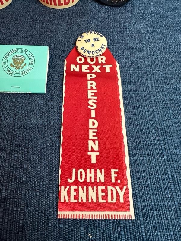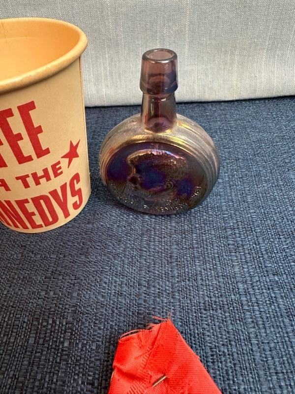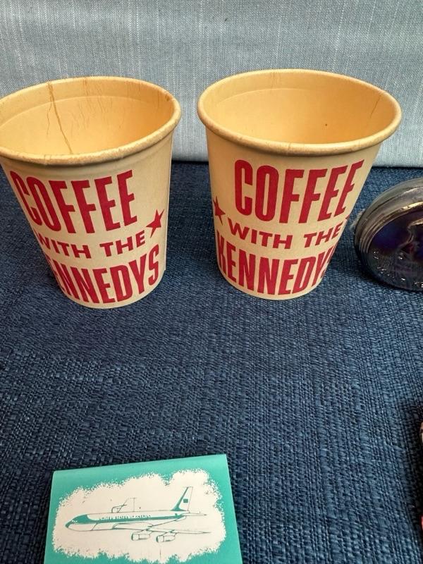 Lot 19 JFK Pin, ribbon, paper coffee cups and mini bottle