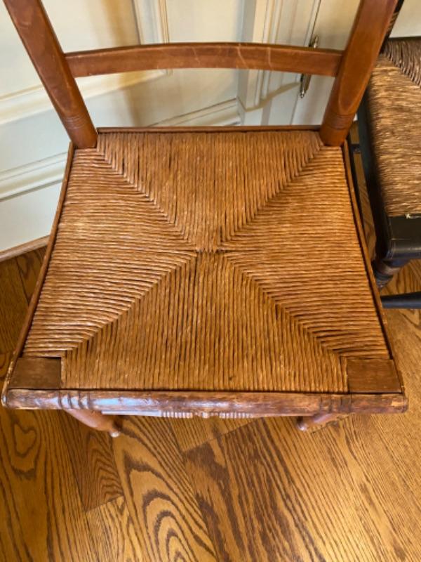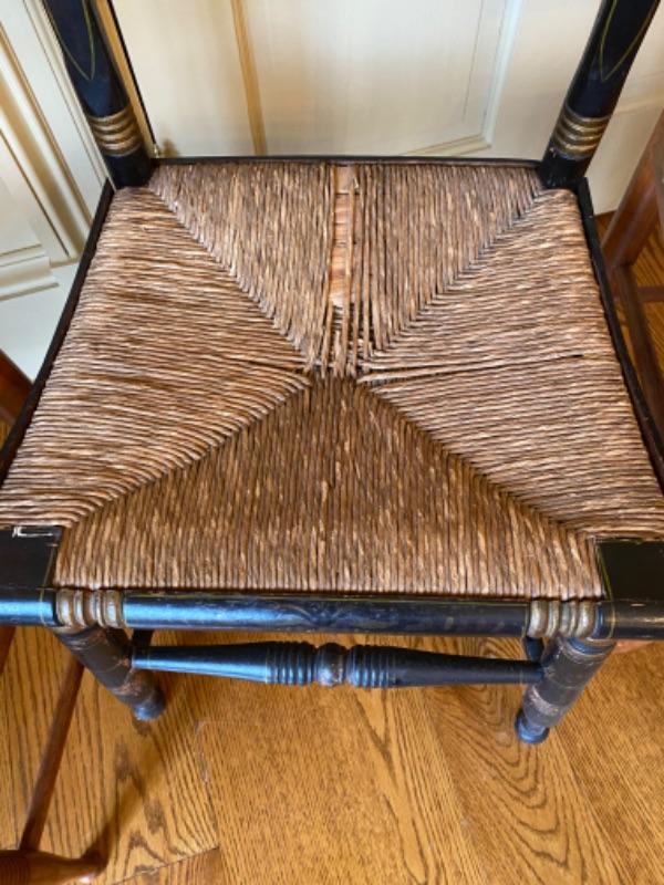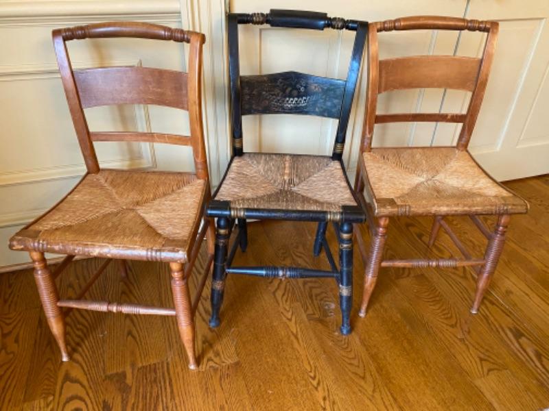 Lot of 3 Baltimore style chairs 1- early Baltimore (black) with damage to seat and 2- vintage Baltimore style with rush seats in good condition