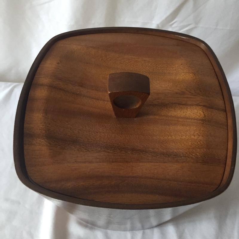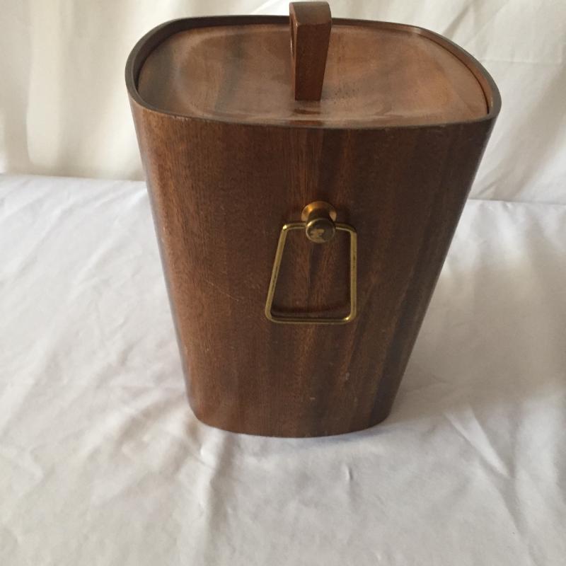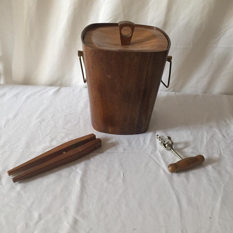 Beautiful MCM wooden ice bucket,wood handled corkscrew and wooden ice cracker. Great for your holiday parties. Ice bucket measures 8.5” x 8.5” x 9.5”.