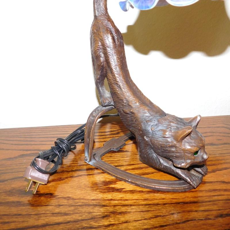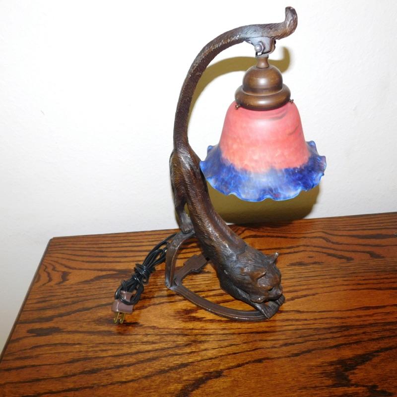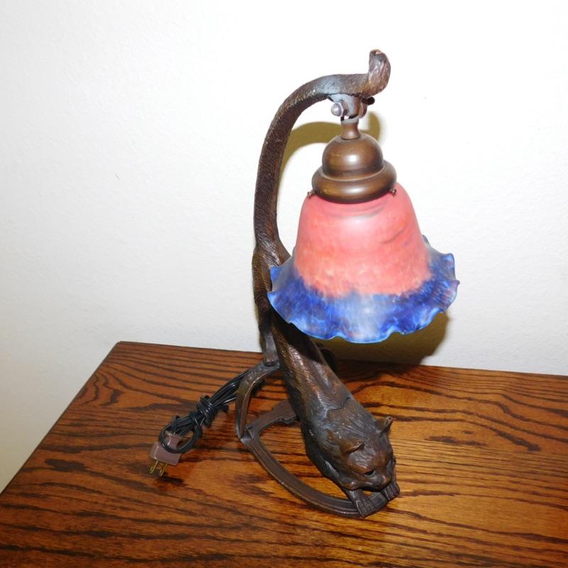 Metal Cat Lamp with Glass Shade W 9.5" H 17"