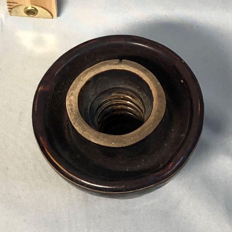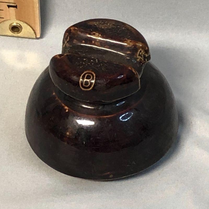 This is in very good condition. I didn't find any chips or cracks. It is embossed with a capital B inside an oval which my Google search insidicates is the Ohio Brass Company (1918-1980s).