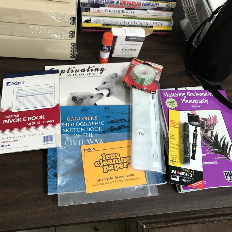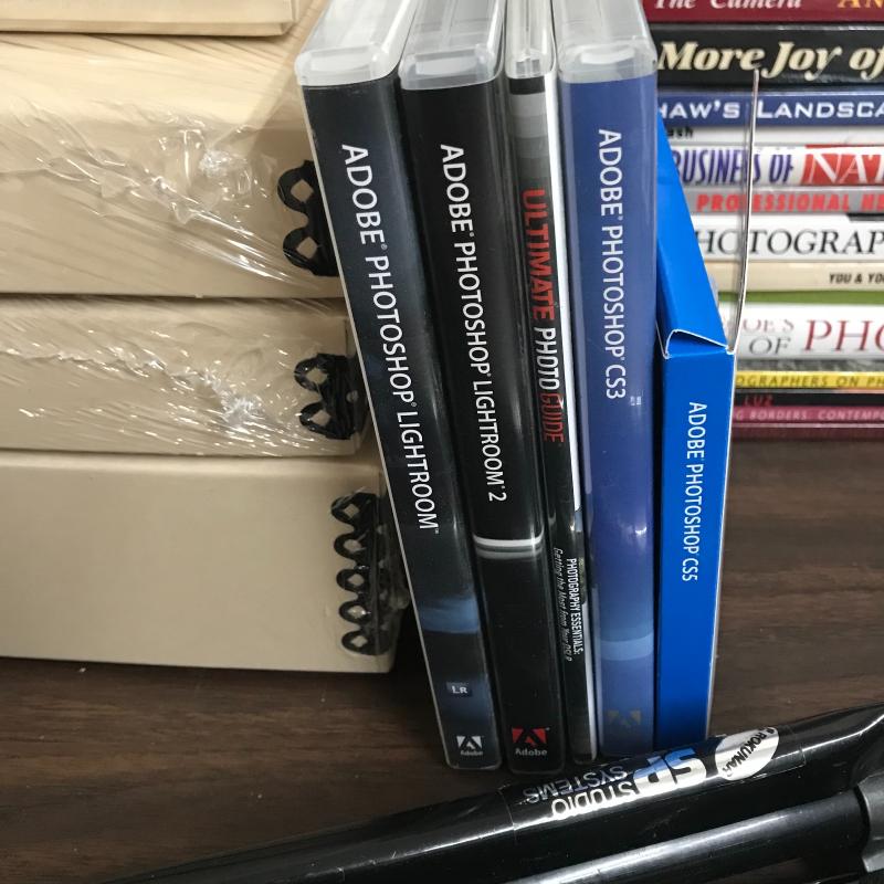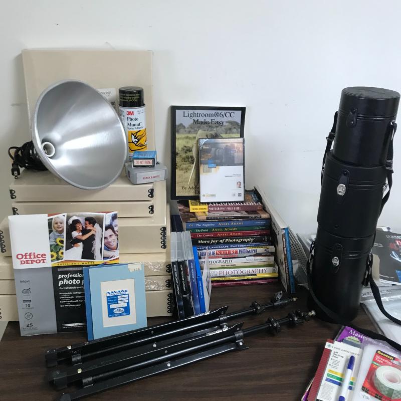 Large lot with various items from a collection of Abobe Photoshop versions, instructional and inspirational books and magazines, two tripods, three empty lens cases, protective boxes and sheet protectors, photo mailers and more! See photos for entire inventory of lot. Local pick up only in Asheville, NC.
