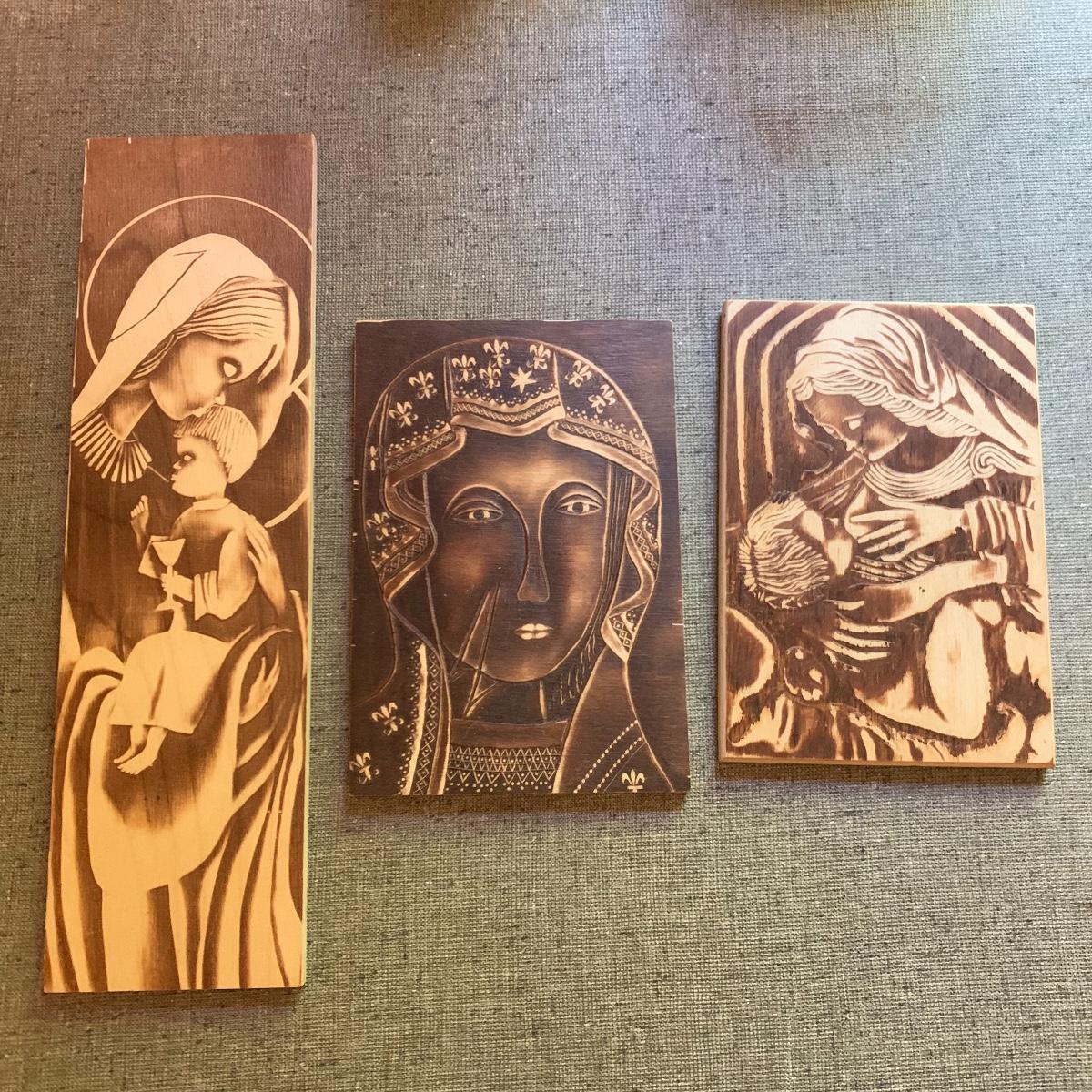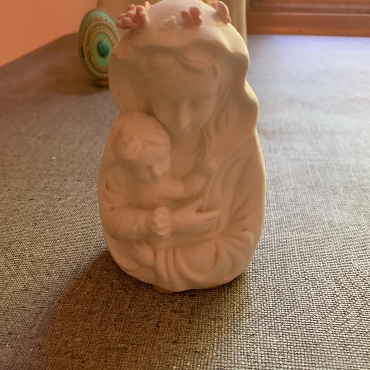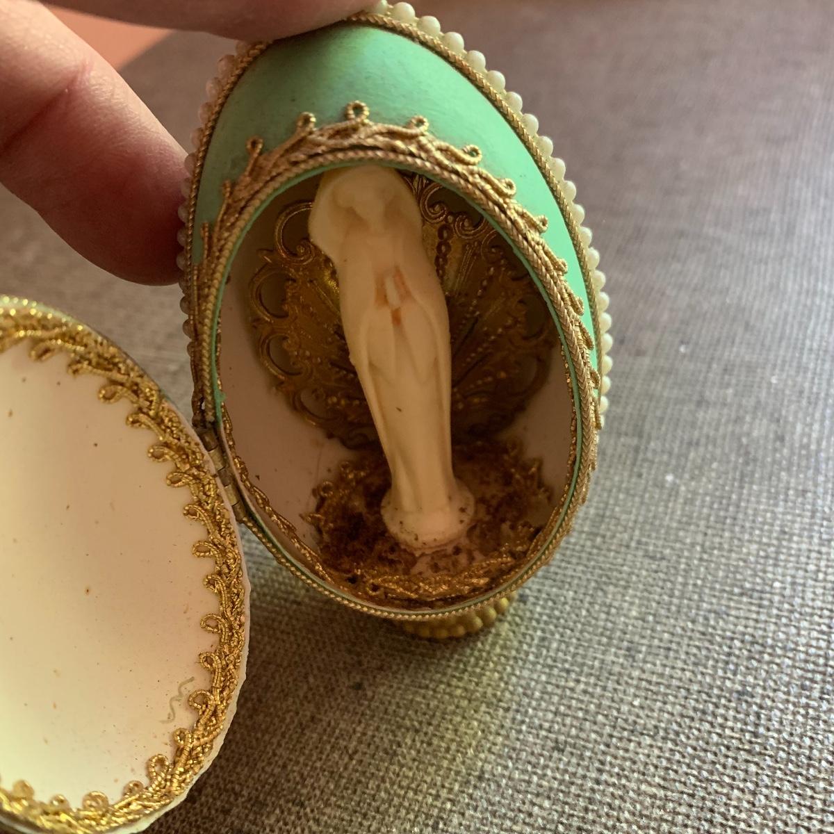 Lot contains interesting religious pieces likely from travels. The two ceramic alter boys appear to be vintage at least and small green egg as well. All three are a bit weathered but in decent condition overall. The wood burnings are sweet depictions with the longest one measuring 13” x 3.5”. Two Pope mementos and a music box that plays Silent Night are included and more. One altar boy has chip on top, see pictures.