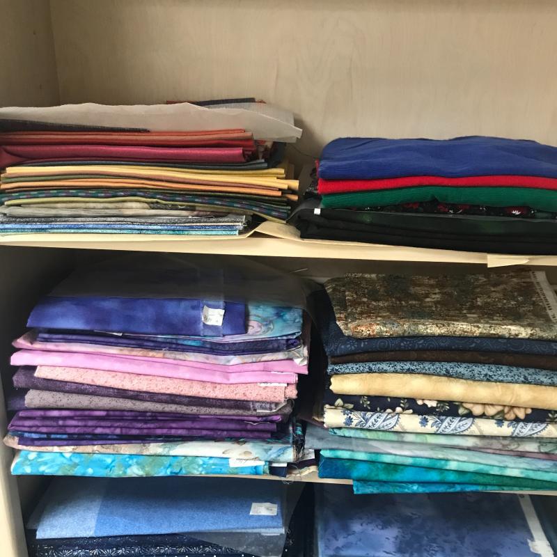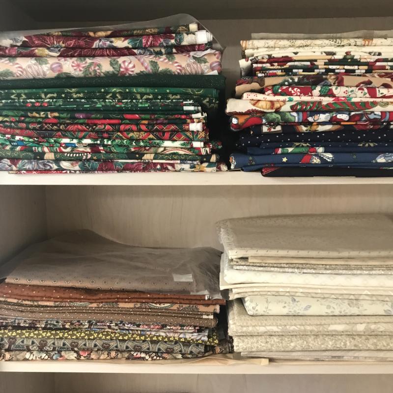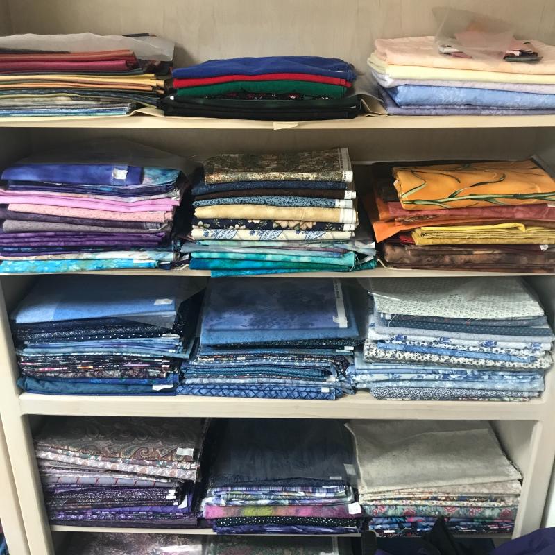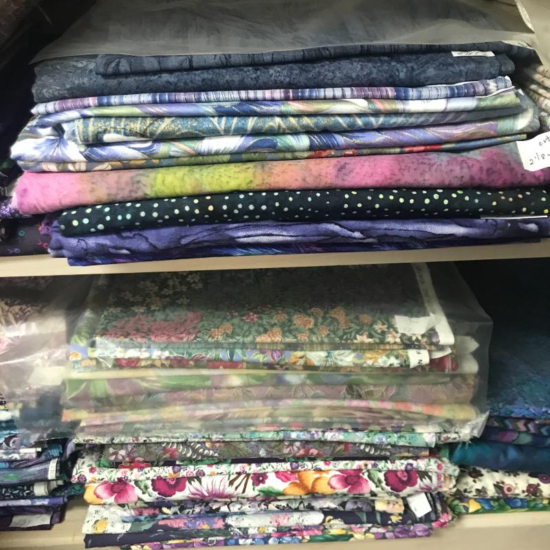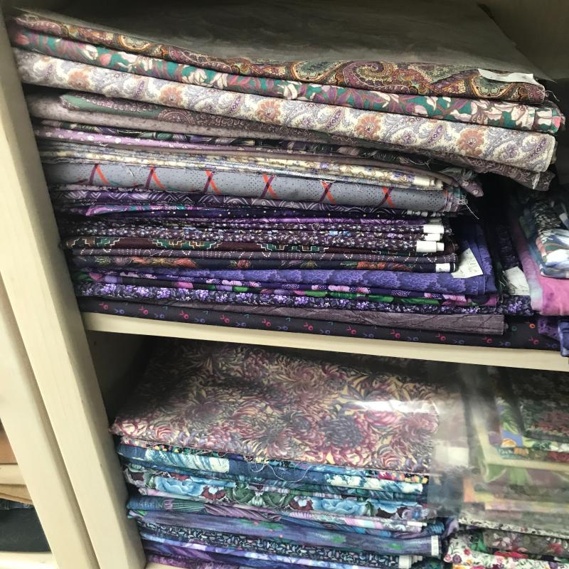 Large lot of quilting fabric mostly one yard or more per fabric. See pictures for colors and details. We encourage you to come to the preview to see the fabrics in person. Shelf not included. Shipping available.