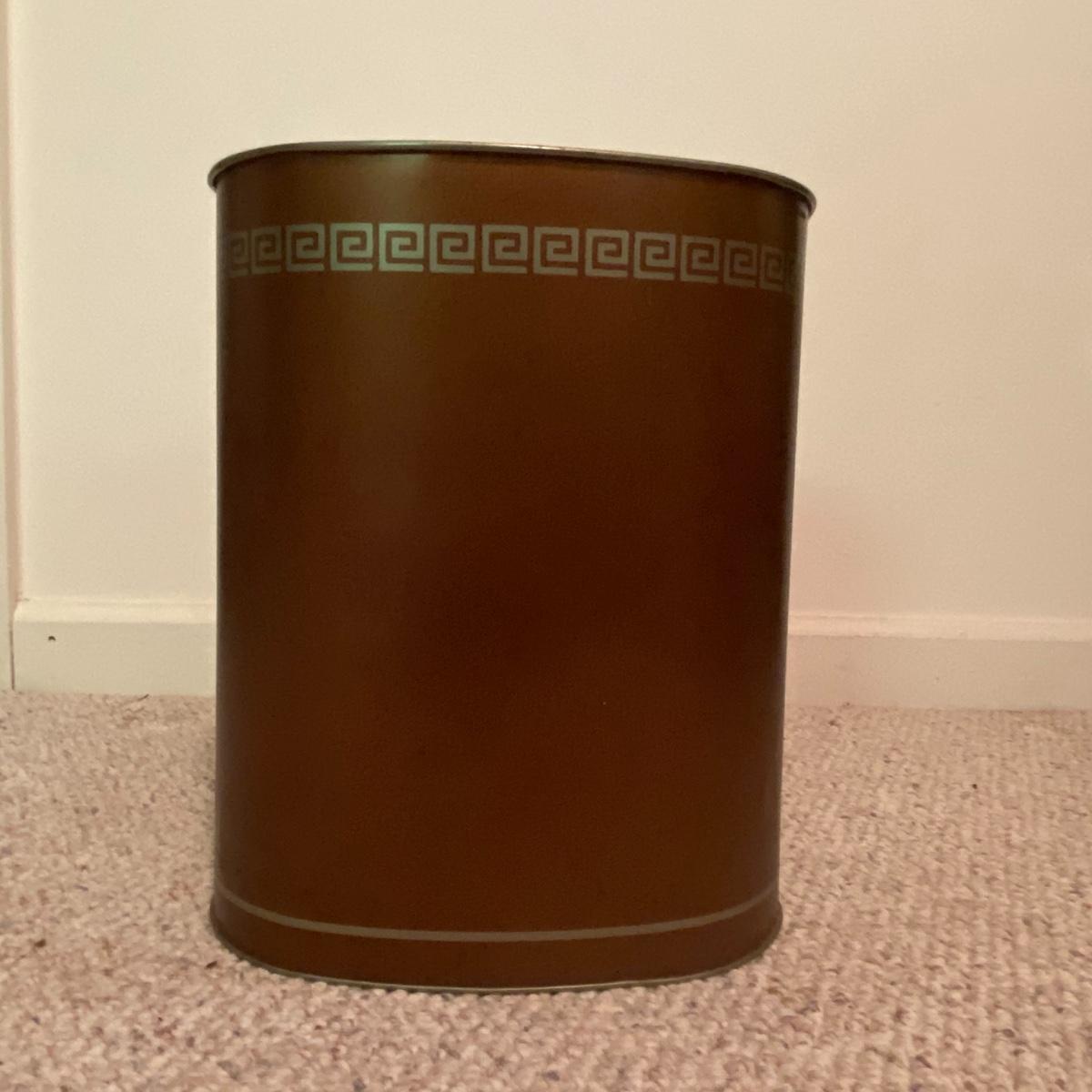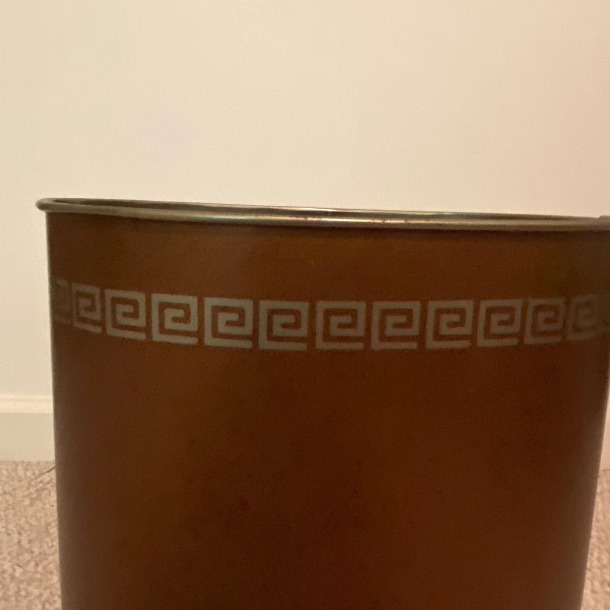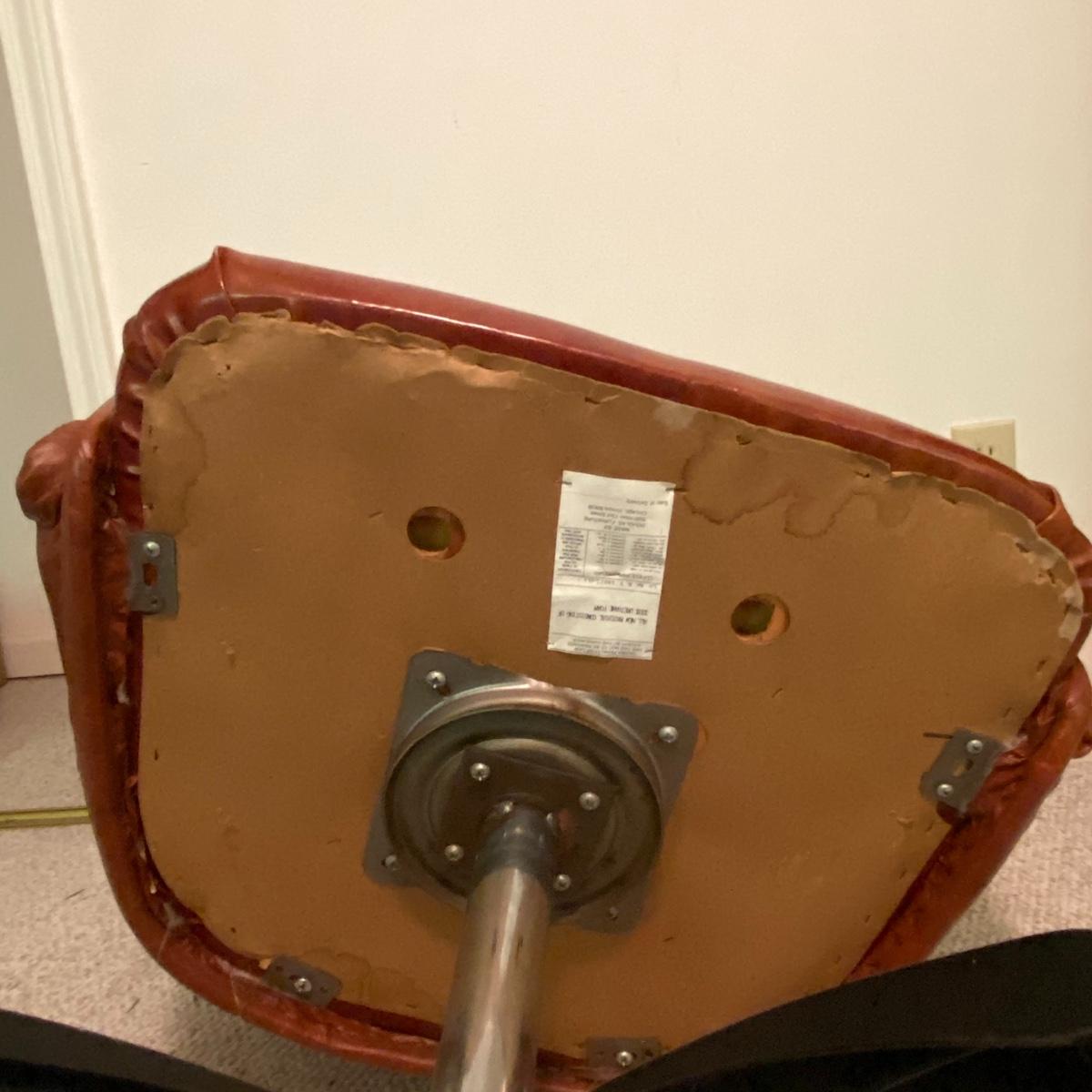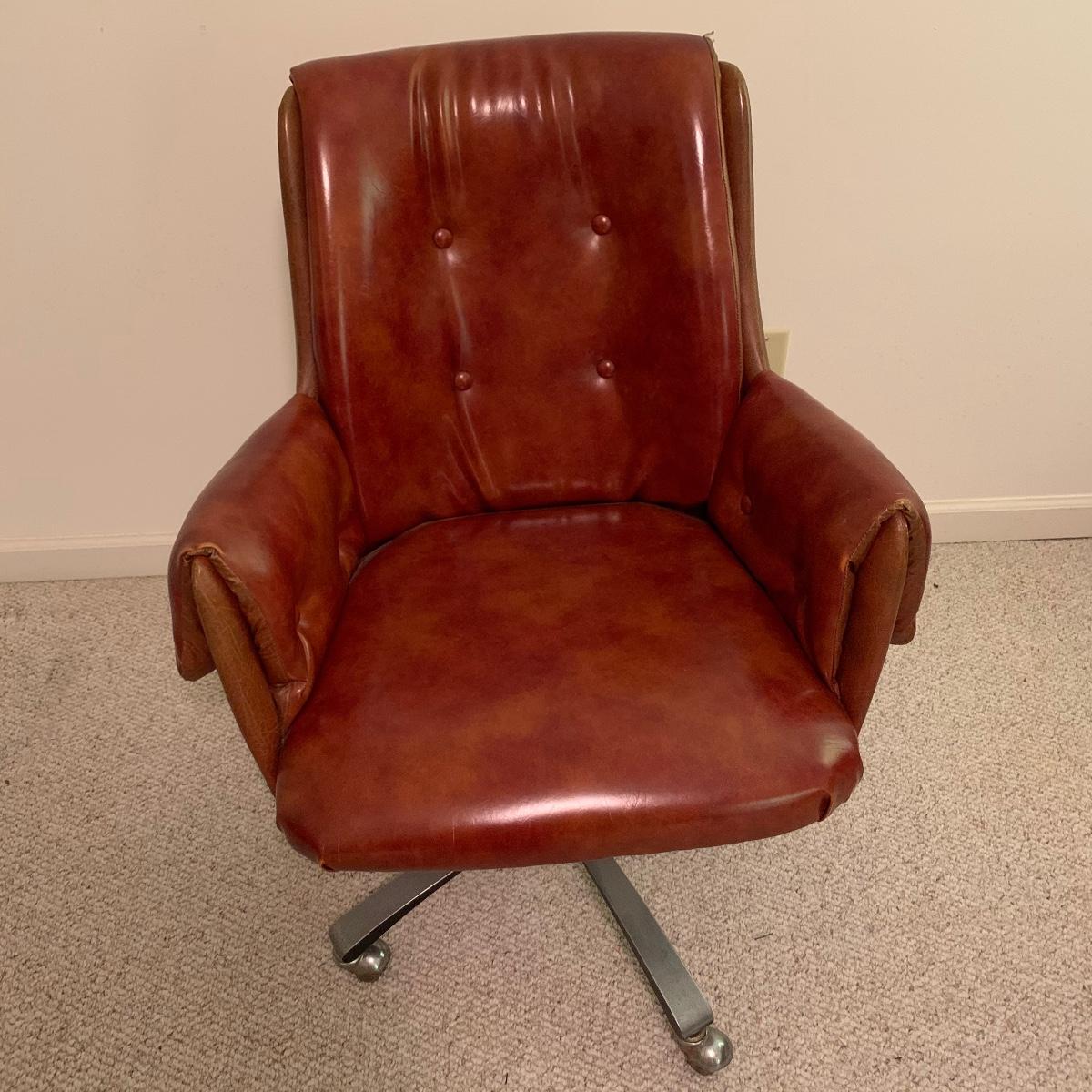 Lot includes a dark red leather-like office chair. Chair measurements are 25”x18”x17”. Including back, chair stands 36” tall. Chair swivels and is on wheels. Sturdy back with button details, does not rock. Copper colored waste bin with unique continuous design measures 13” tall. See photos. Local pickup only.